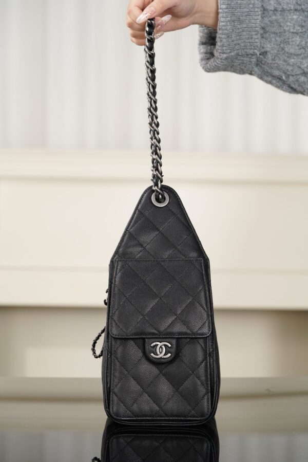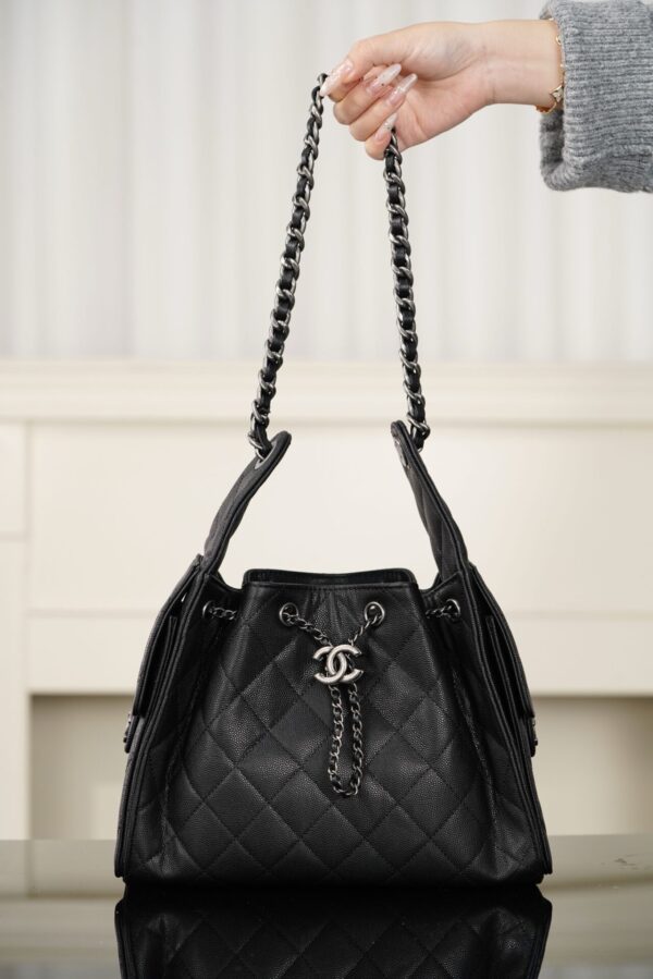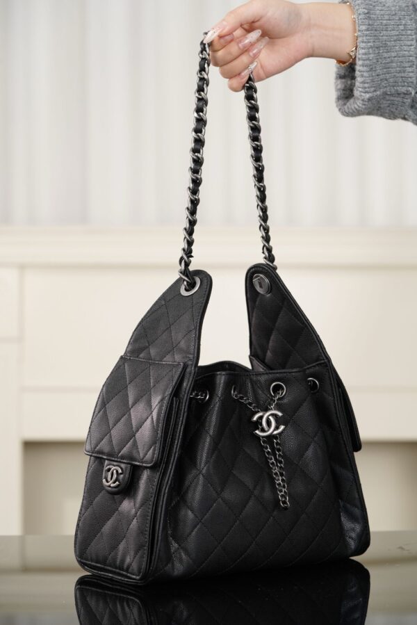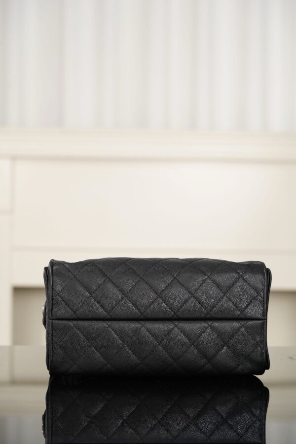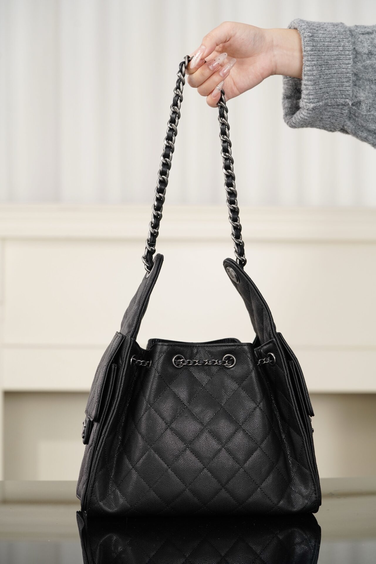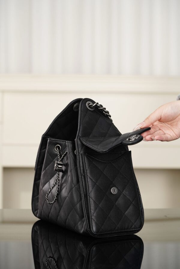 샤넬의 26c 신款 25백은 블랙 캐비어 가죽으로 제작되어 고급스러운 질감을 자랑합니다.
