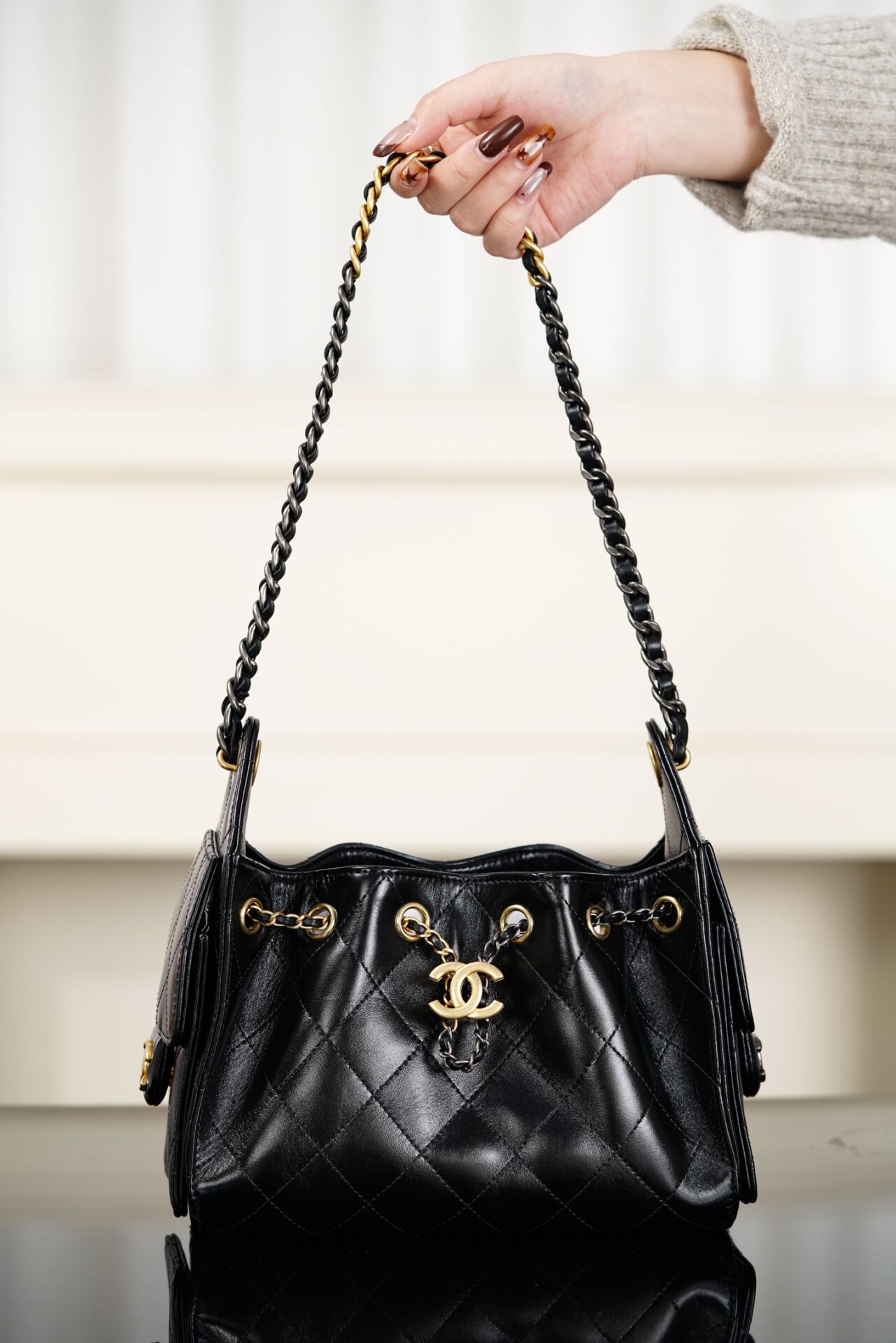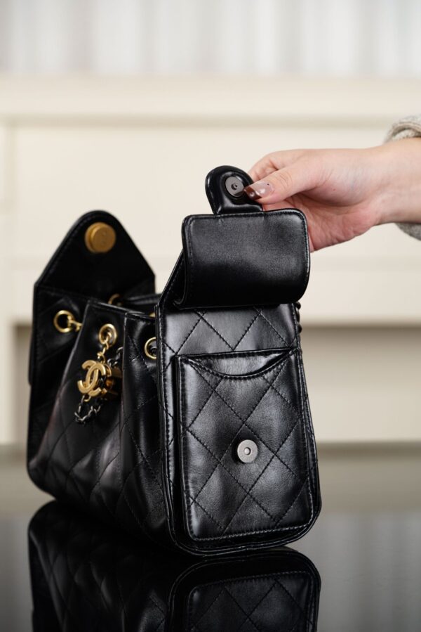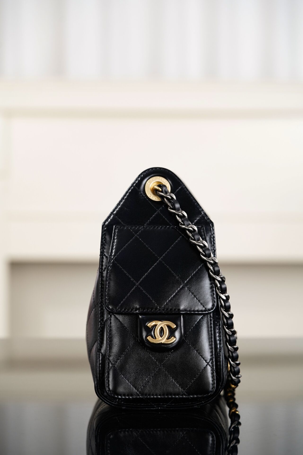 샤넬의 26C 신상 25백 미니백은 유화 가죽으로 제작되어 고급스러운 광택을 자랑합니다.