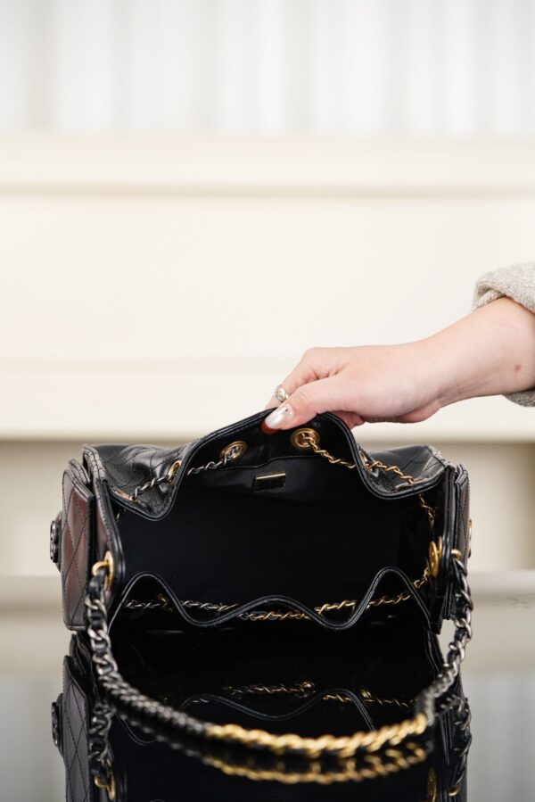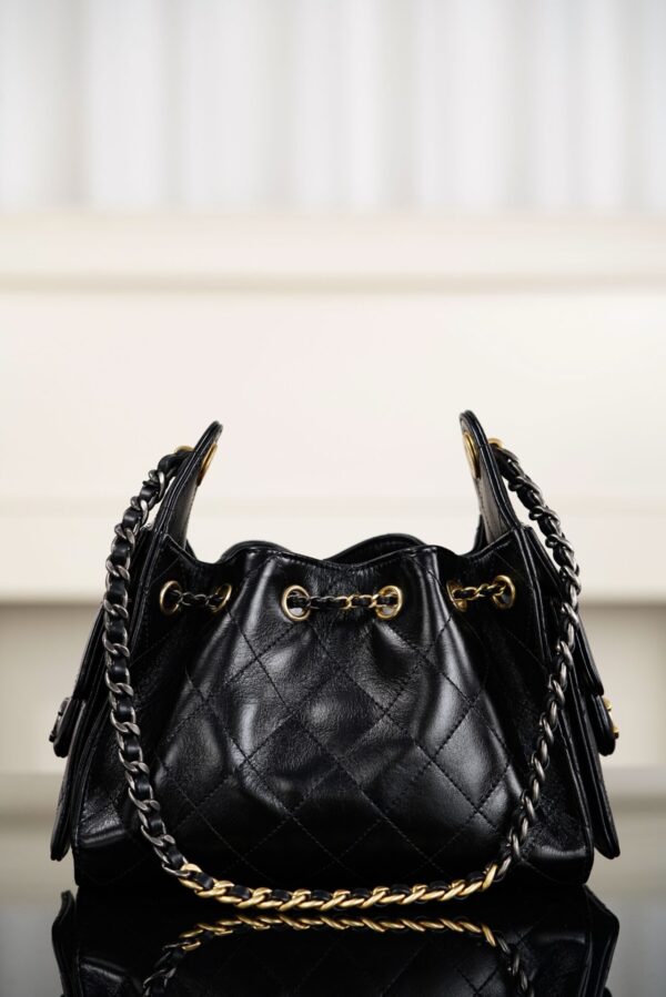 투톤 체인 디자인이 독특하며, 금색과 은색의 조화가 클래식한 매력을 더합니다. 실용적인 조절 가능한 끈 디자인과 측면의 두 개의 작은 포켓이 있어 편리하게 사용할 수 있습니다.