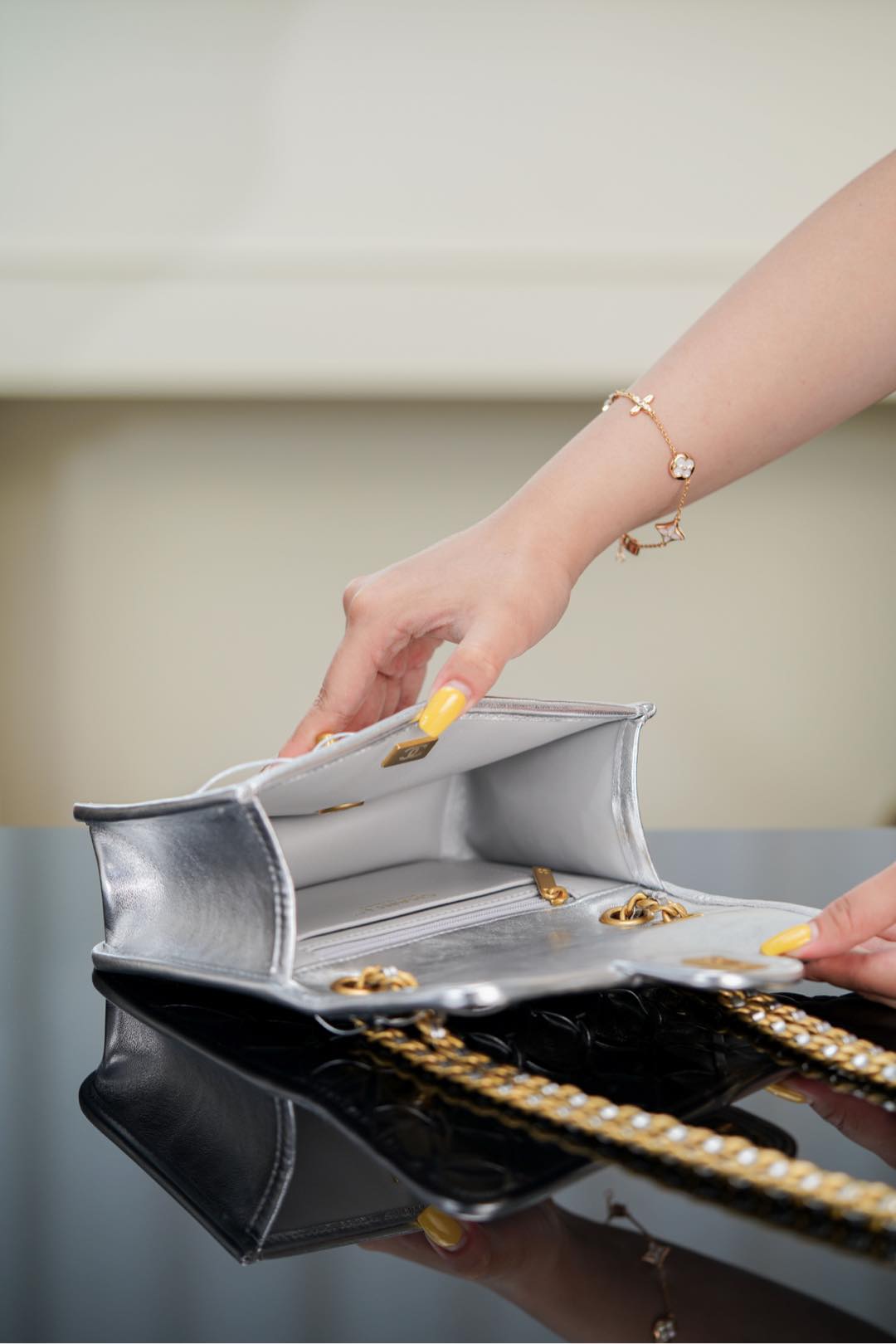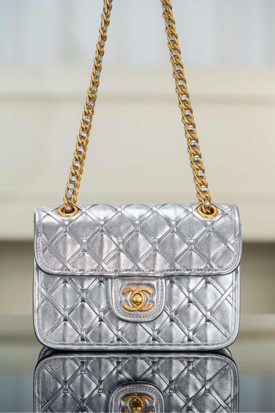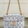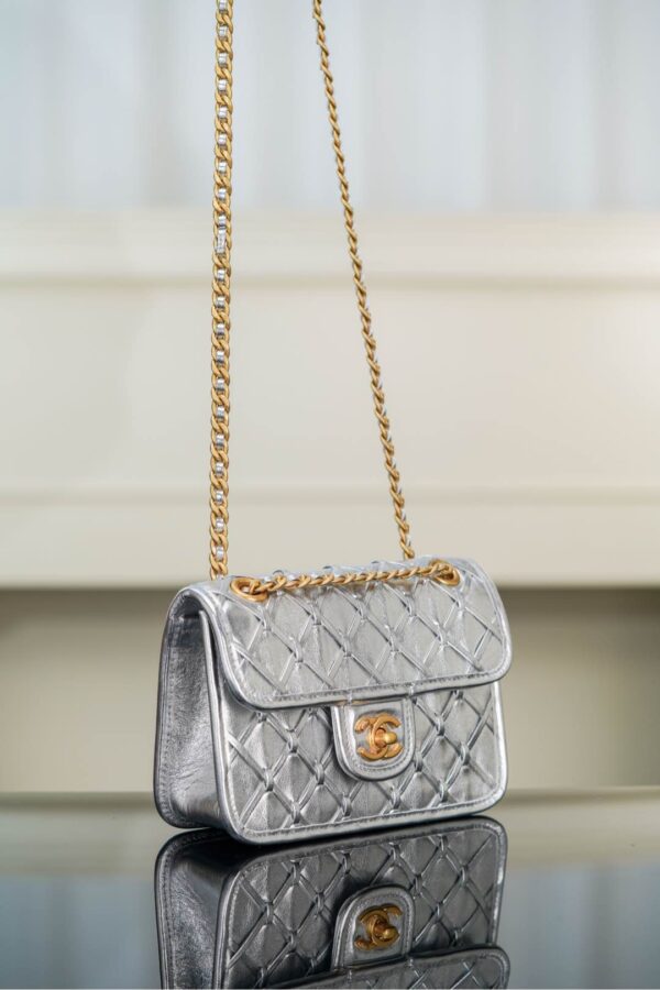 샤넬의 CF 편직 체인백은 미래감 넘치는 실버 컬러로 시선을 사로잡습니다.