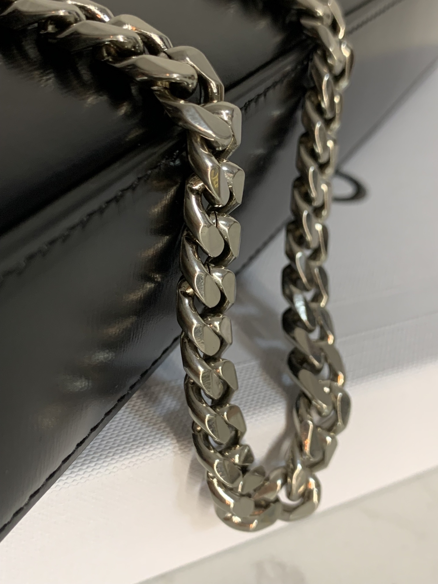 부드러운 광택의 소가죽 소재로 제작되어 고급스러움을 더하며, 체인 스트랩이 포인트가 되어 스타일리시한 느낌을 줍니다.