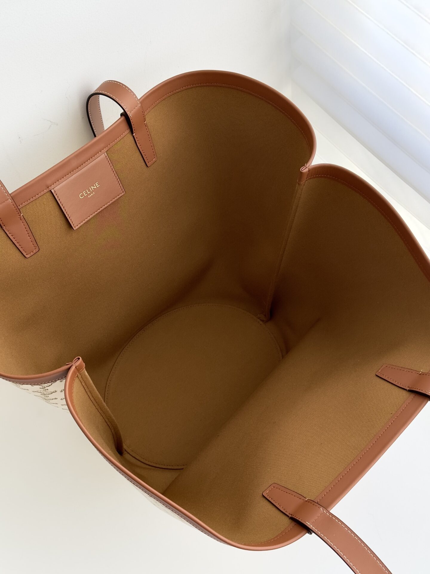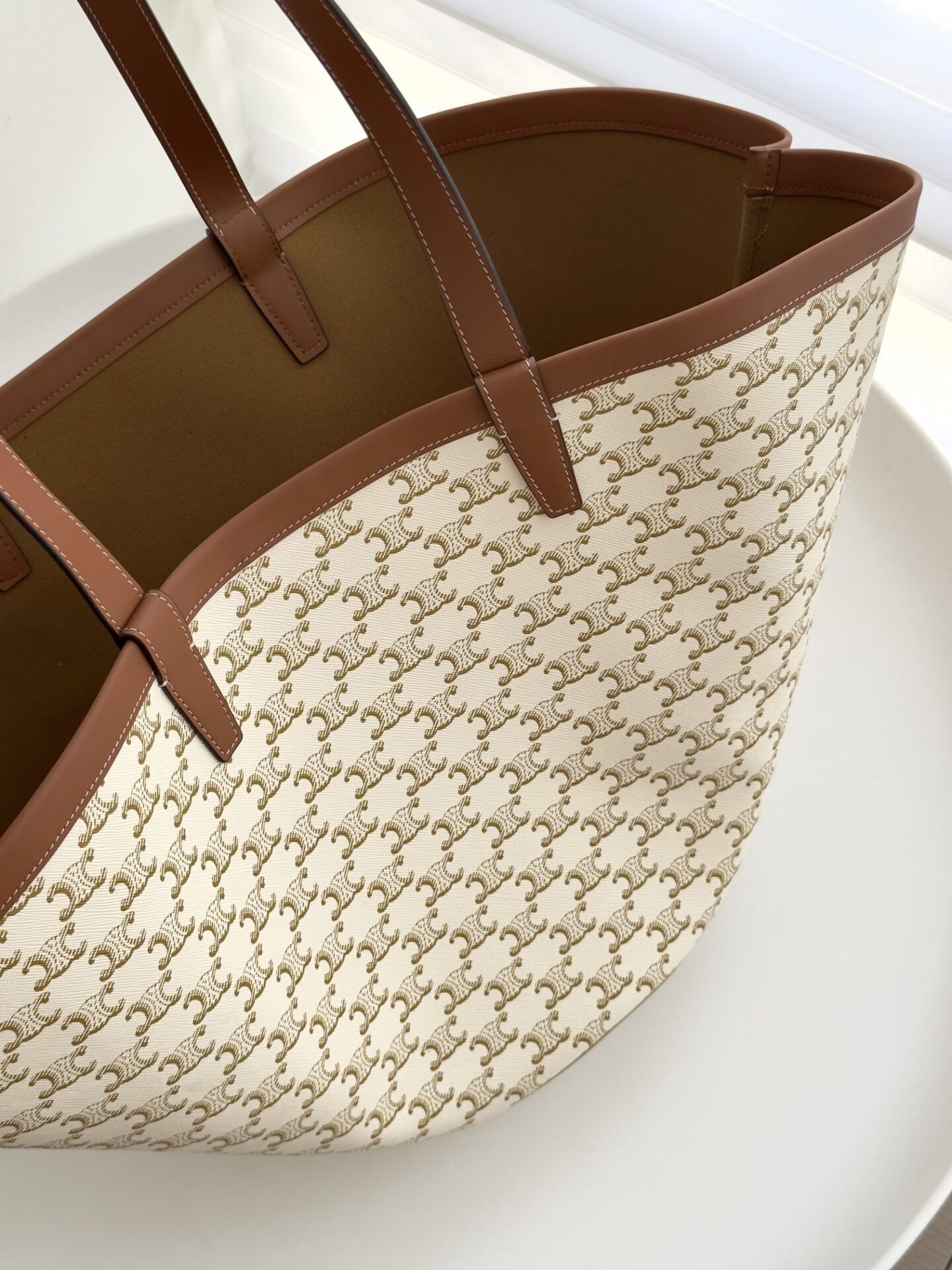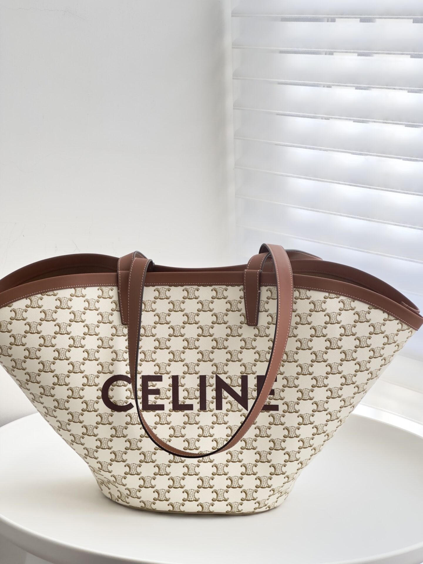 셀린느의 대형 카바스 백은 화사한 화이트 컬러로 여름철에 완벽한 선택입니다.