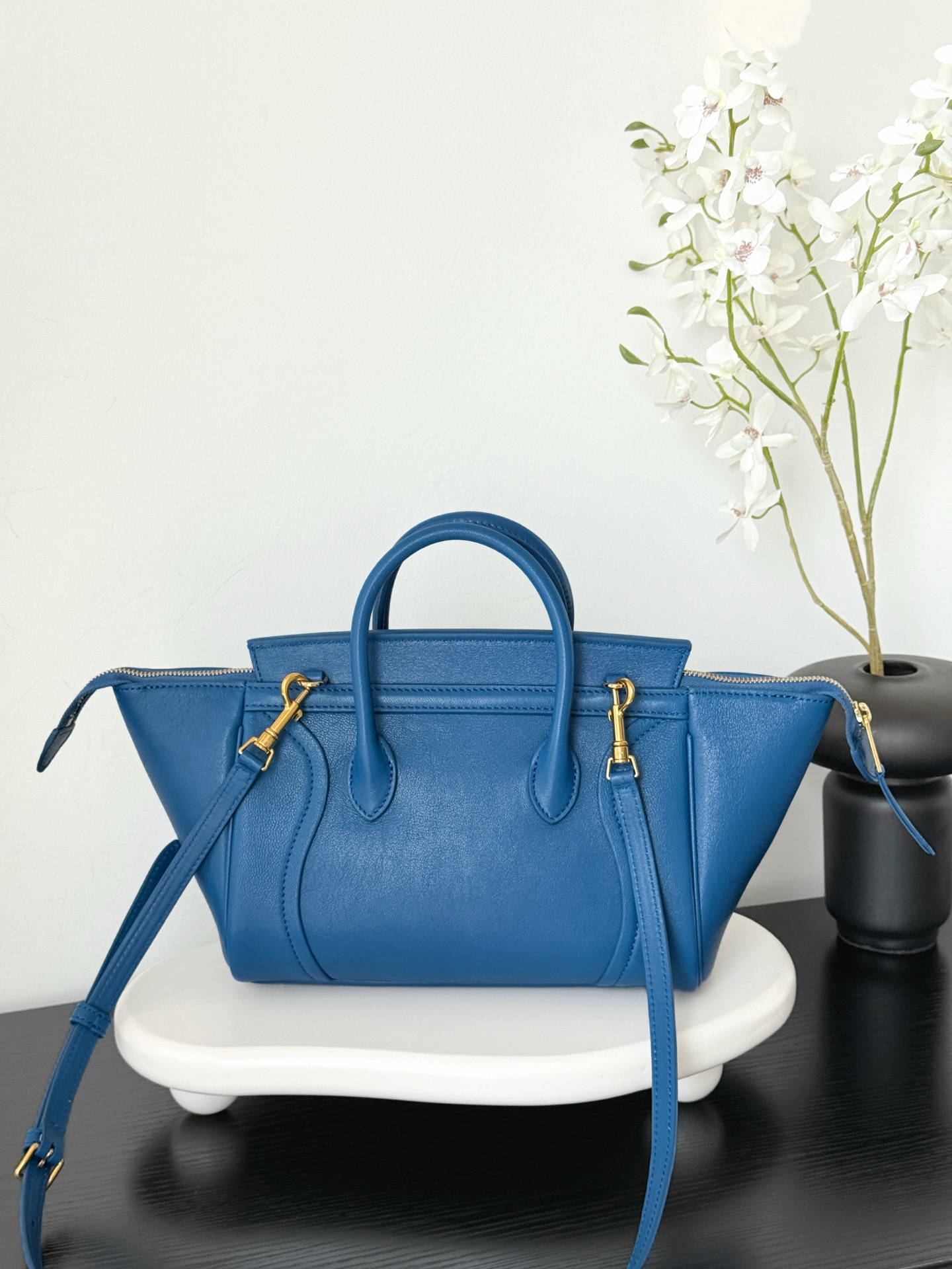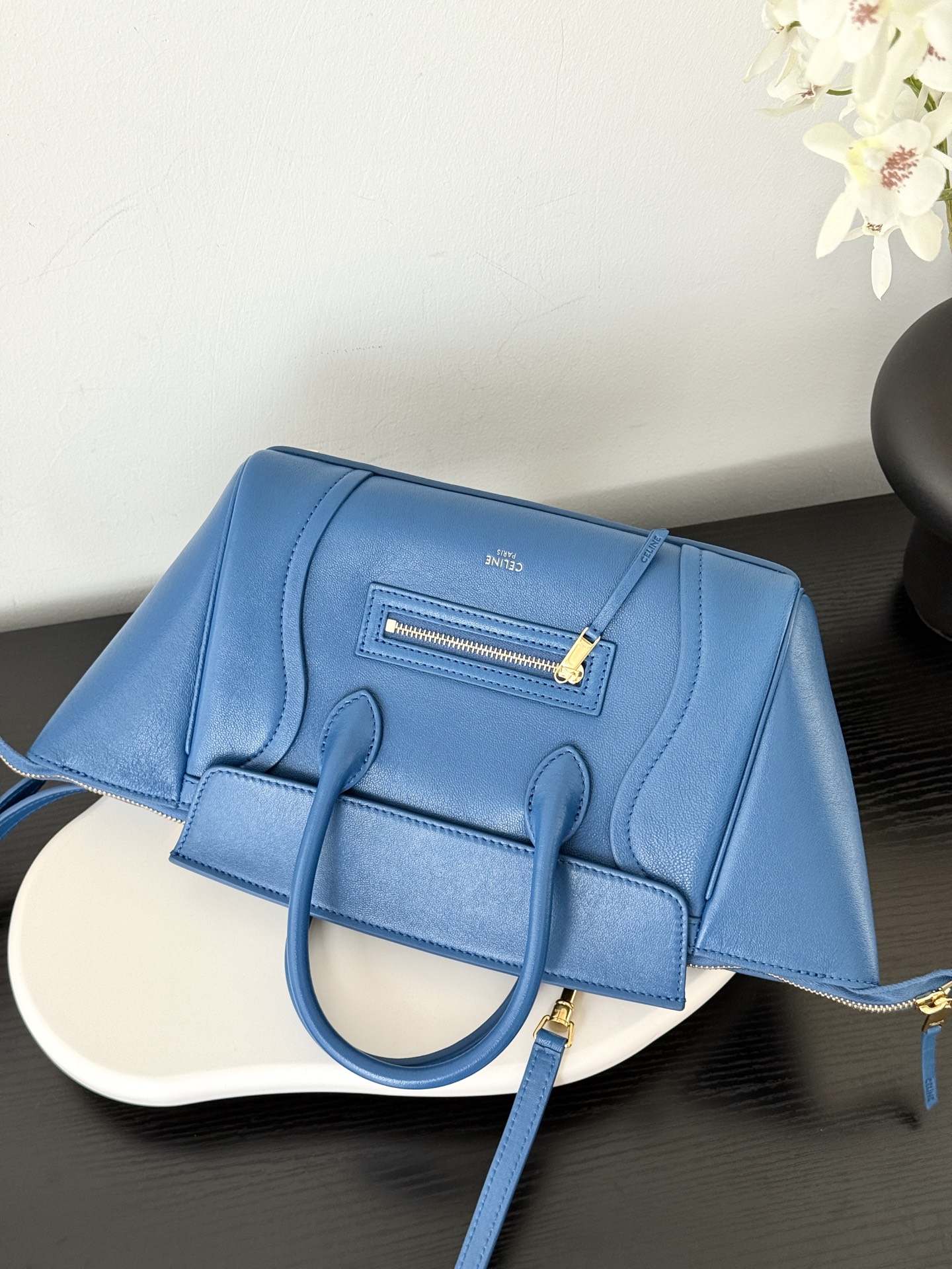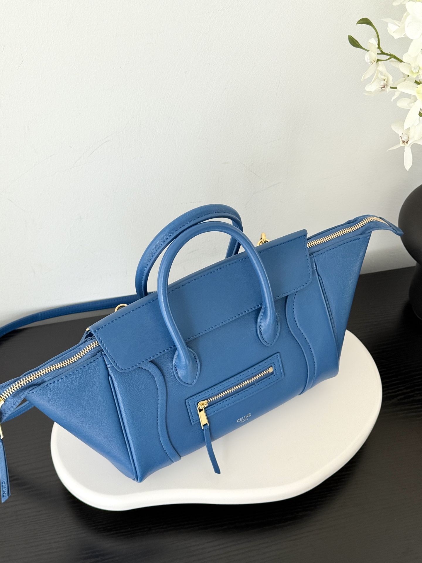 셀린느의 웃는 얼굴 가방이 새로운 모습으로 돌아왔습니다. 부드럽고 가벼운 양가죽 소재로 제작되어 우아함을 더합니다.
