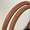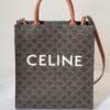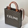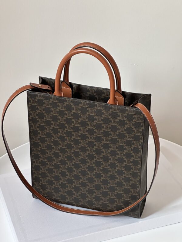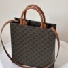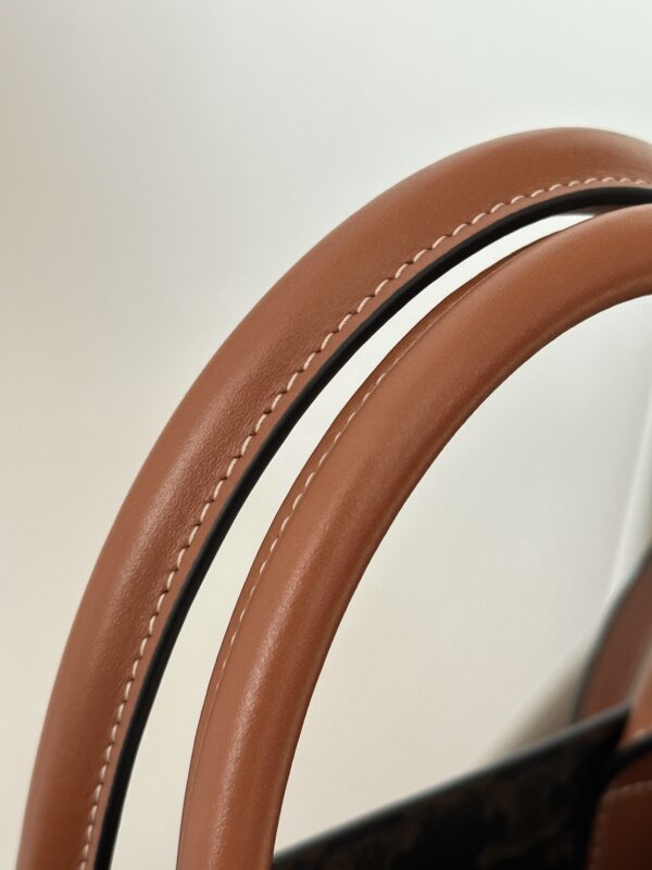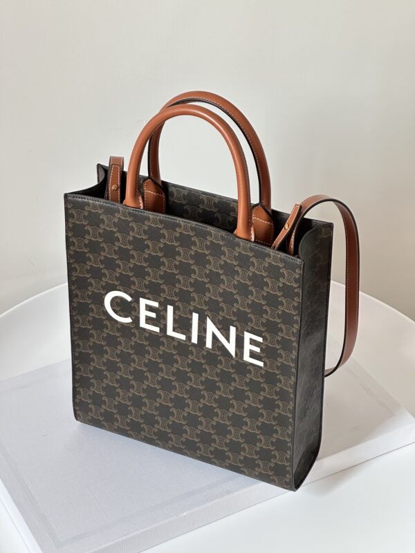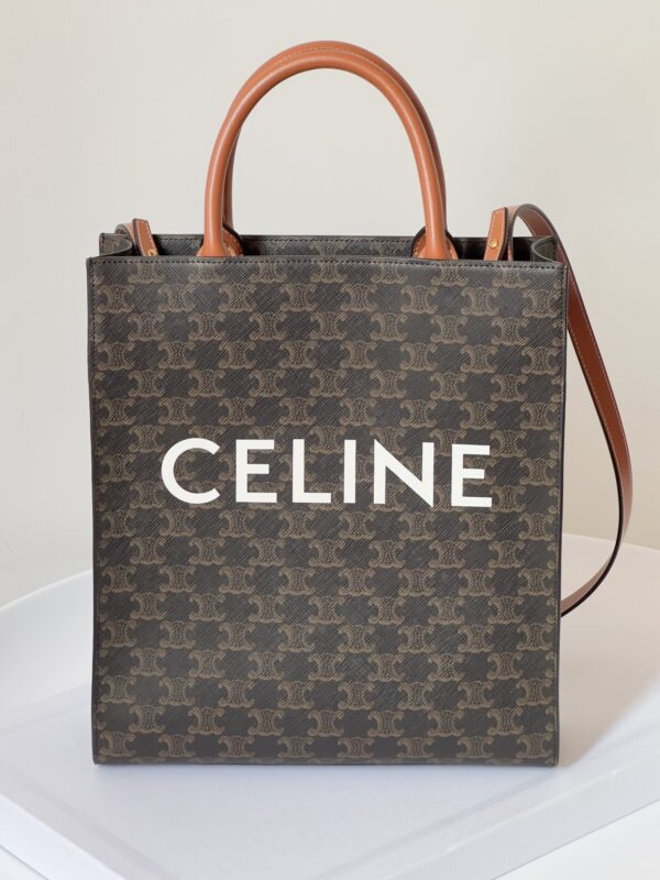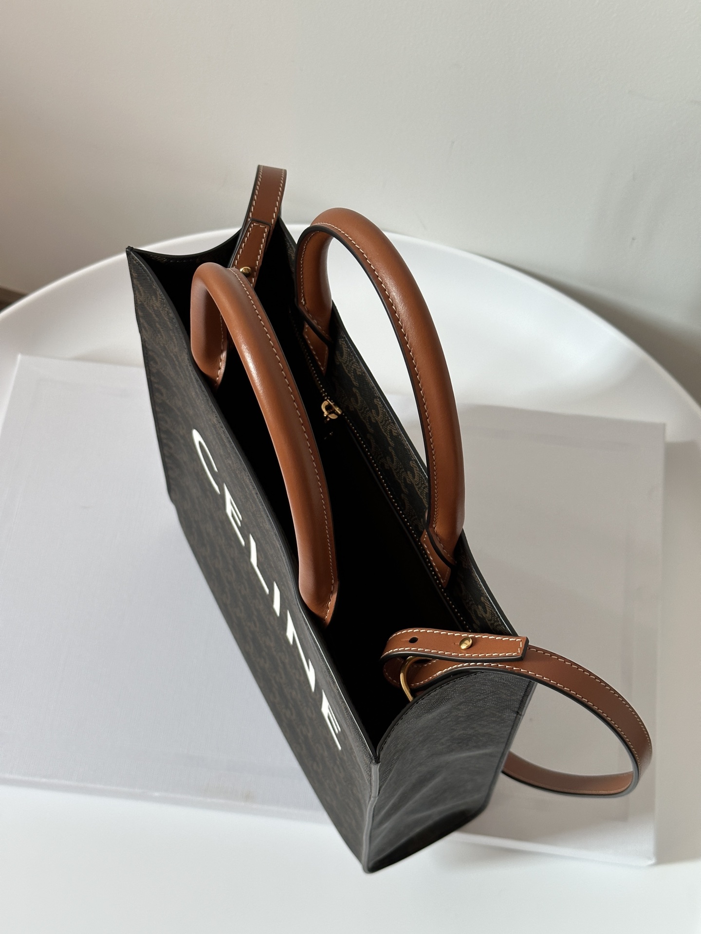 셀린느의 미니 토트백은 클래식한 카라멜 색상의 가죽 핸들과 함께 고급스러운 로고 패턴이 조화를 이루고 있습니다.