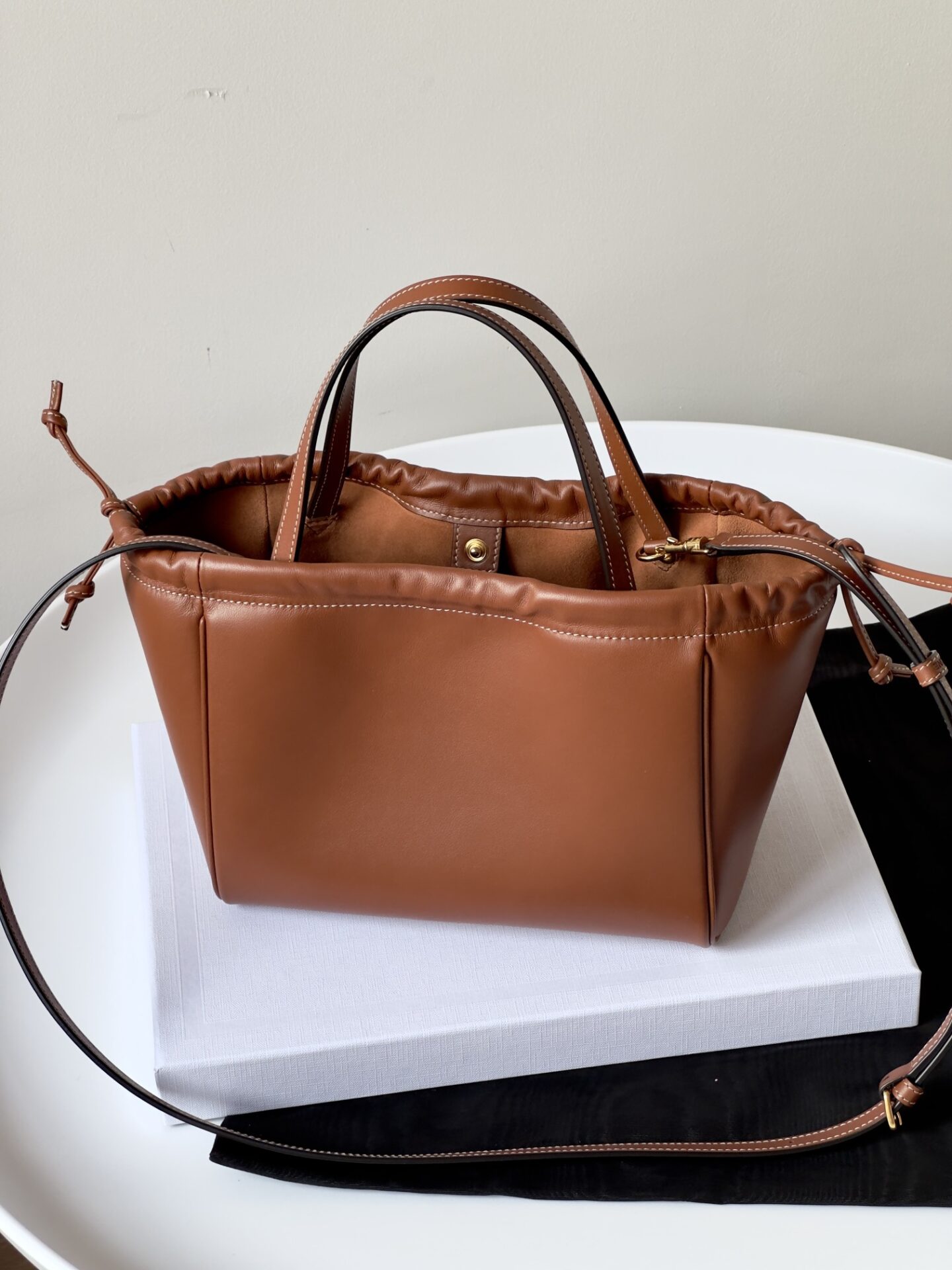 소가죽 소재로 고급스러움을 더하며, 손잡이와 스트랩으로 다양한 착용이 가능합니다.