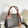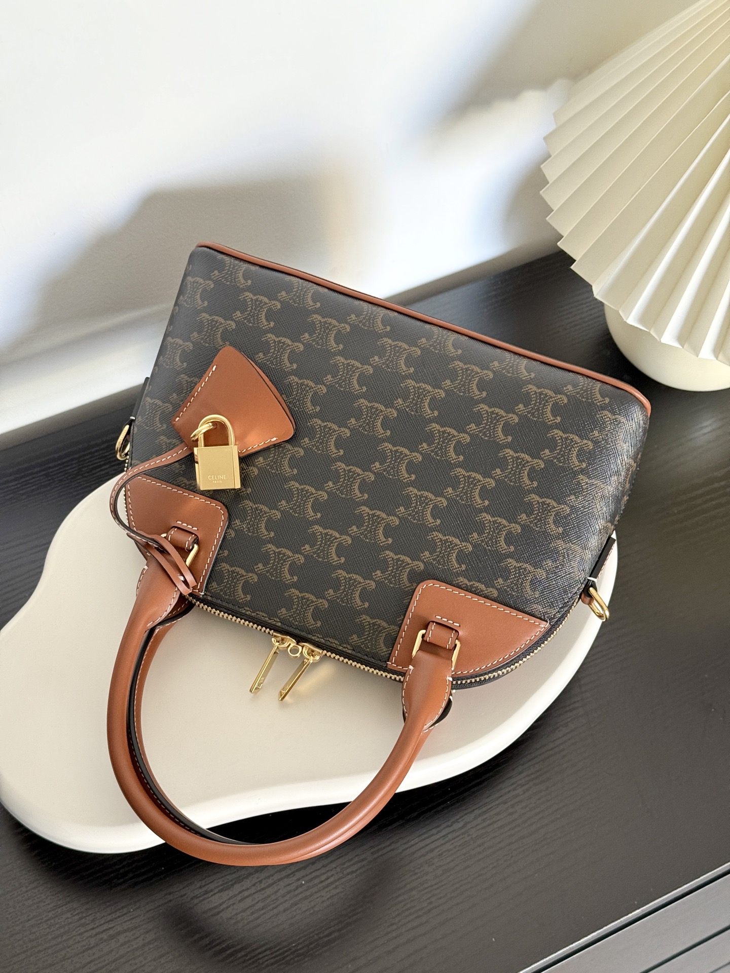 부드러운 브라운 소가죽으로 마감된 모서리와 장식이 고급스러움을 더하며, 아치형 손잡이는 건축적인 느낌을 줍니다.
