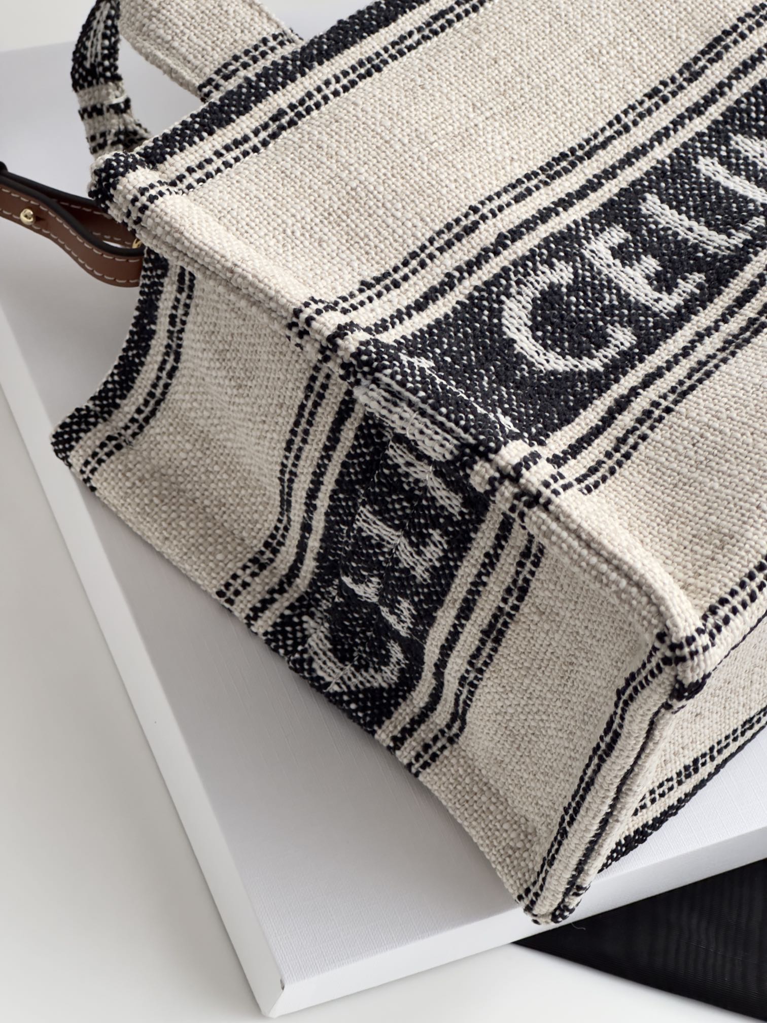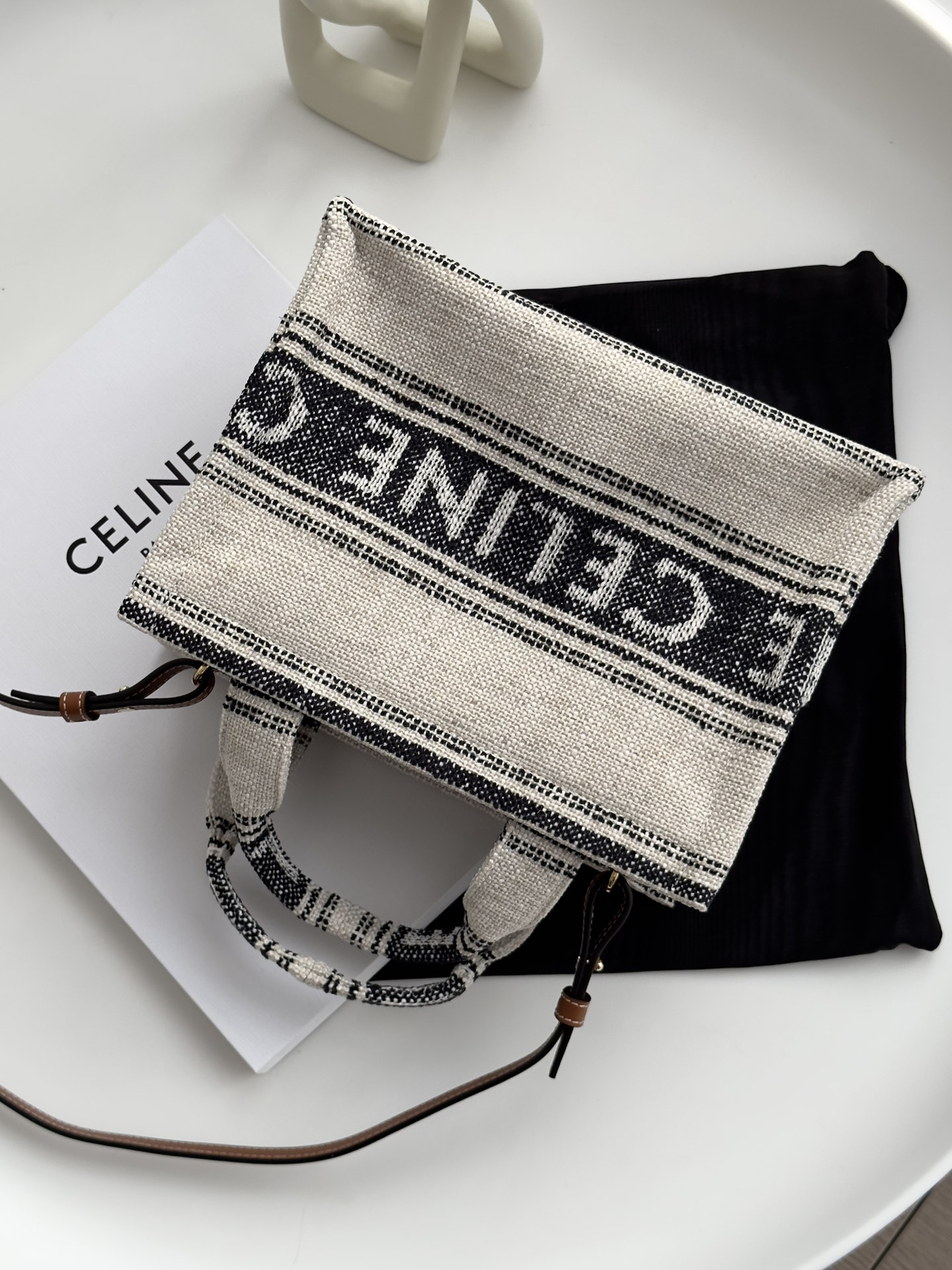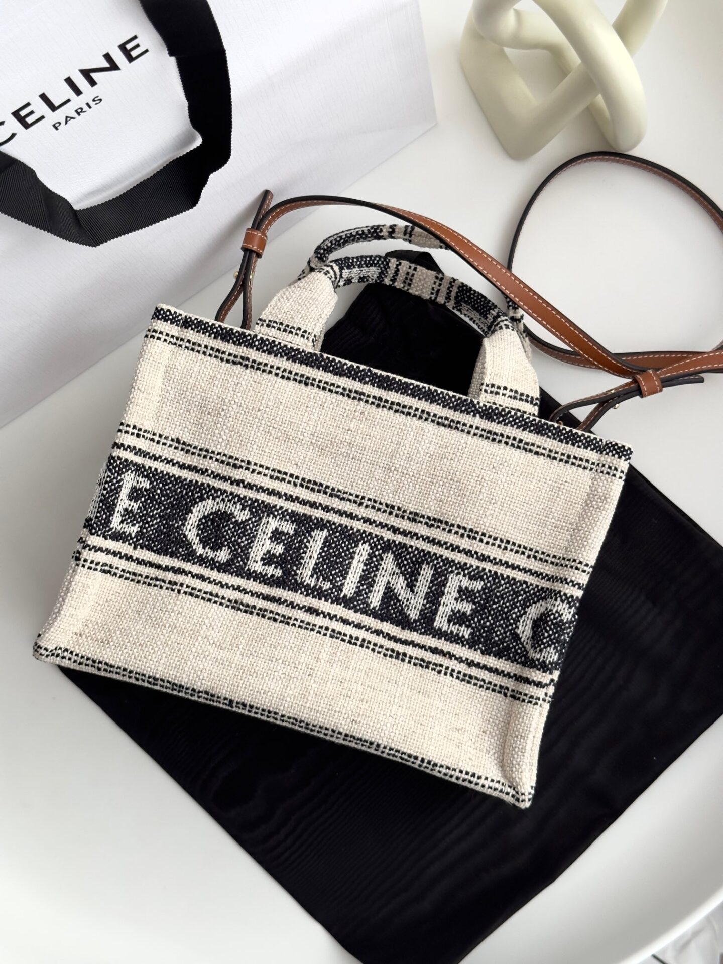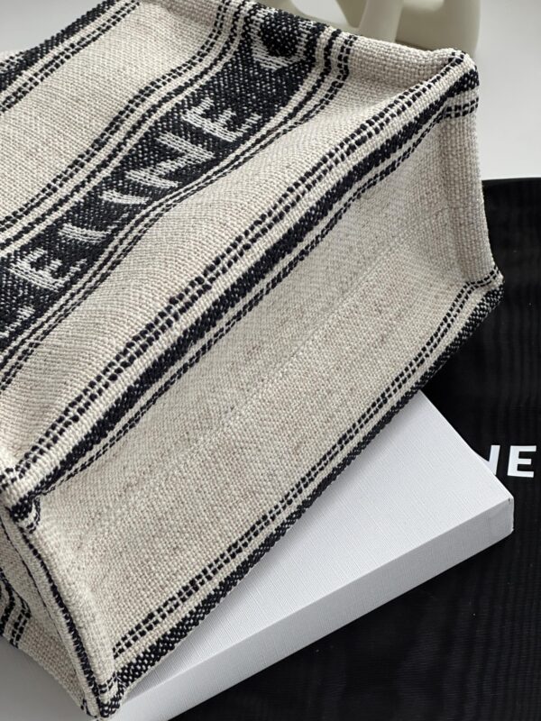 셀린느의 제직 스트라이프 캔버스 숄더백은 여름철 필수 아이템입니다.
