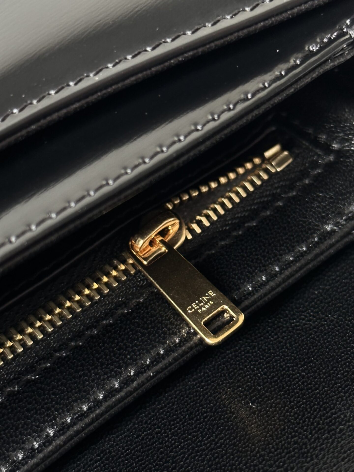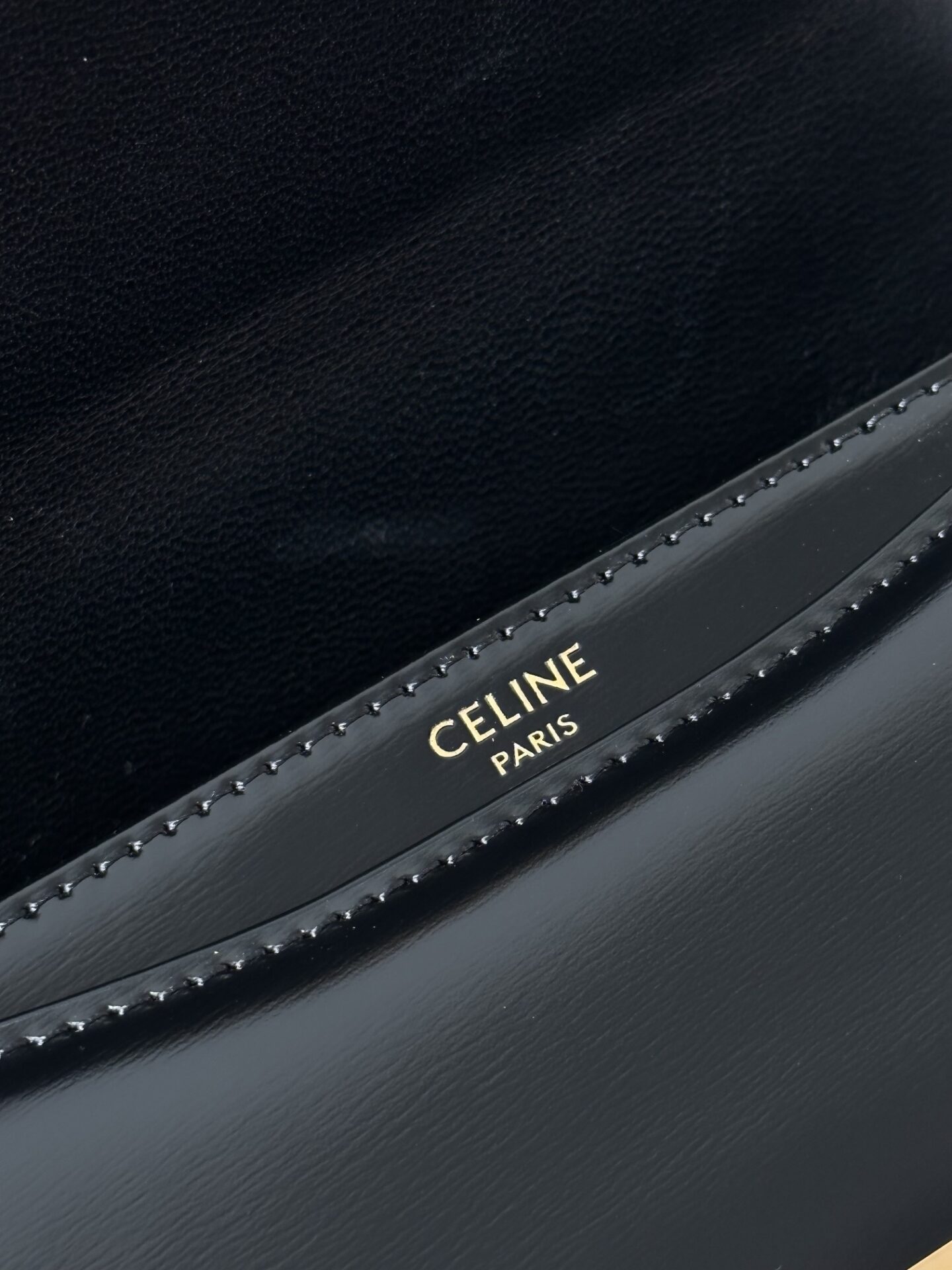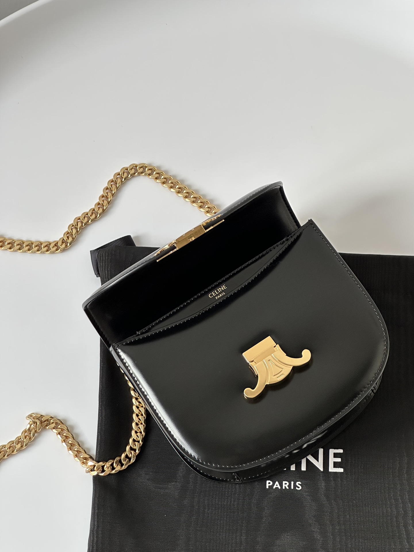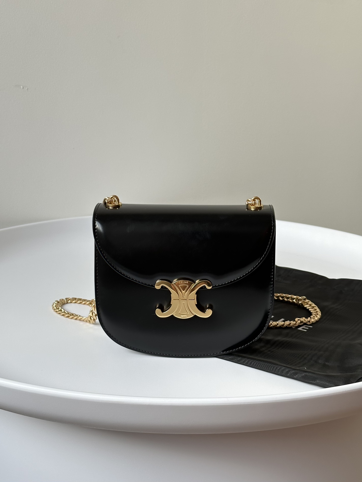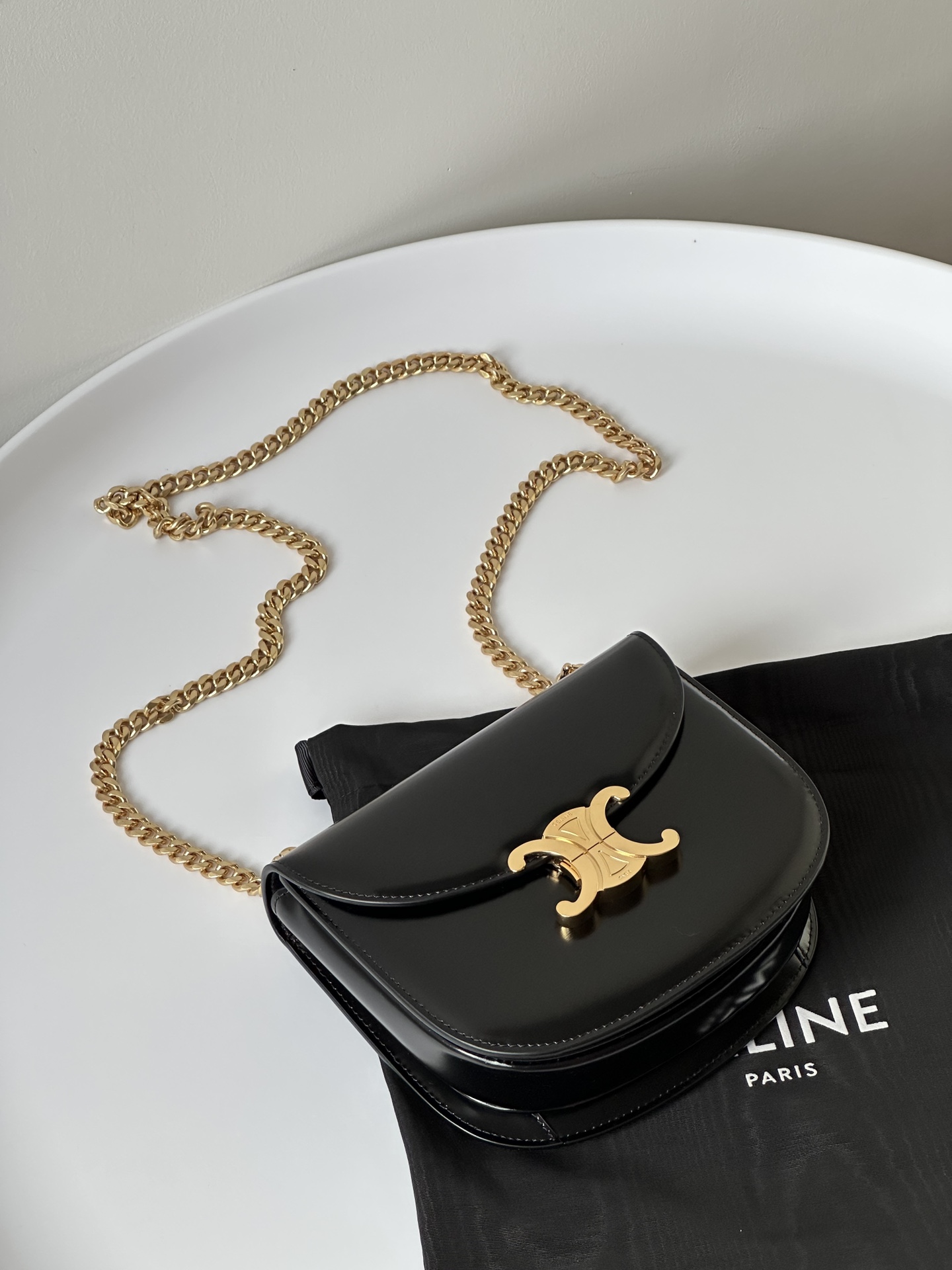 고급스러운 블랙 컬러와 골드 하드웨어가 조화를 이루는 셀린느 체인 케이트 미니백입니다.