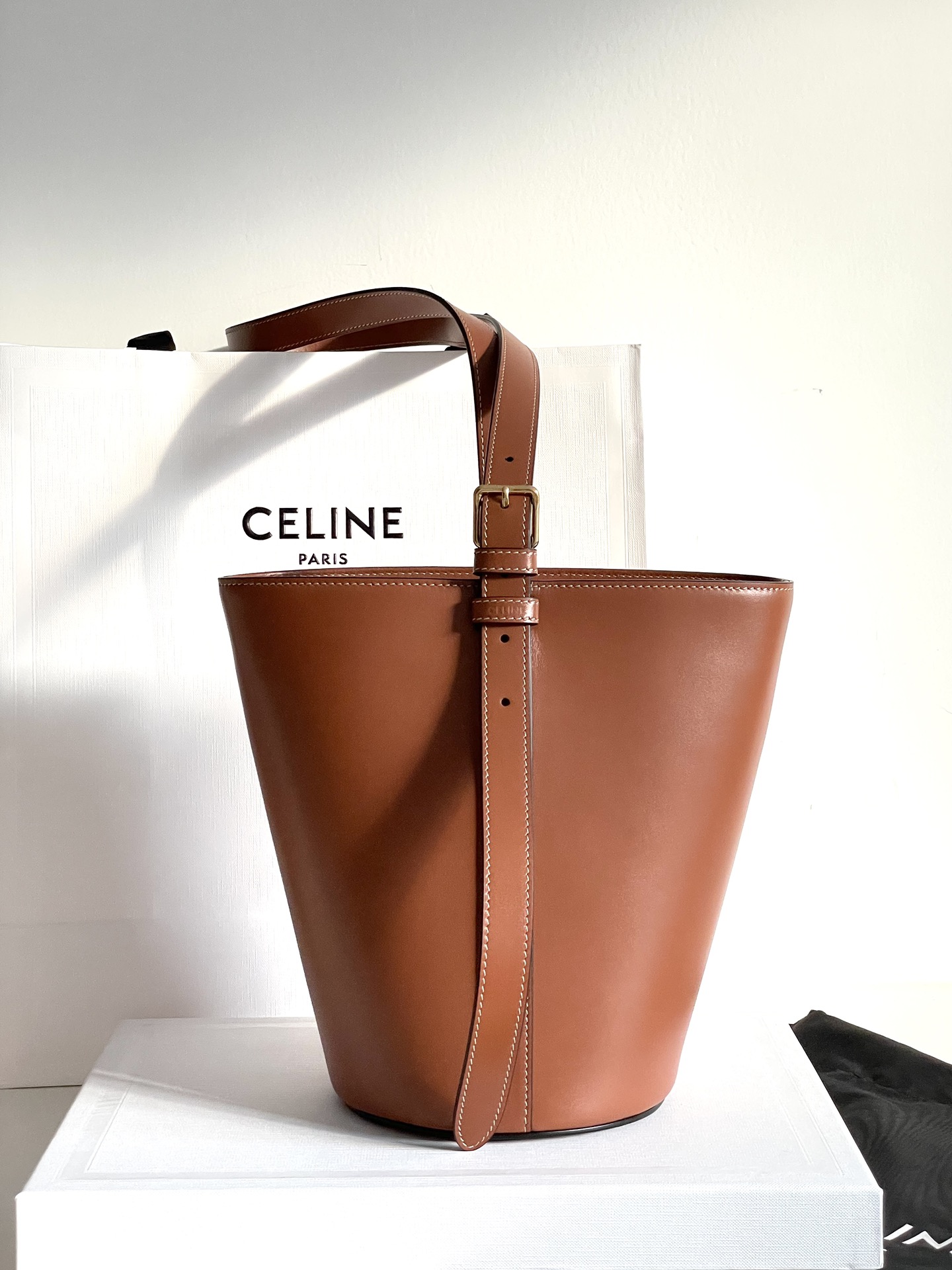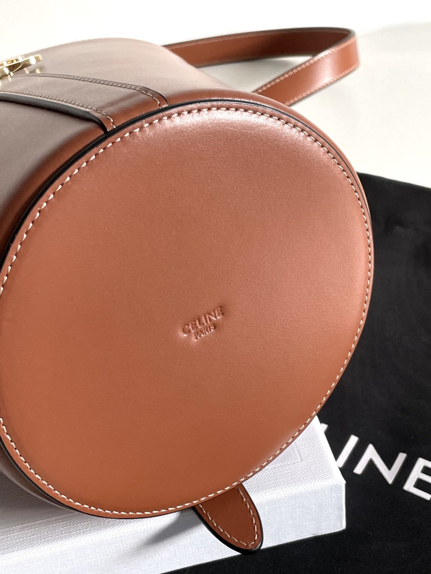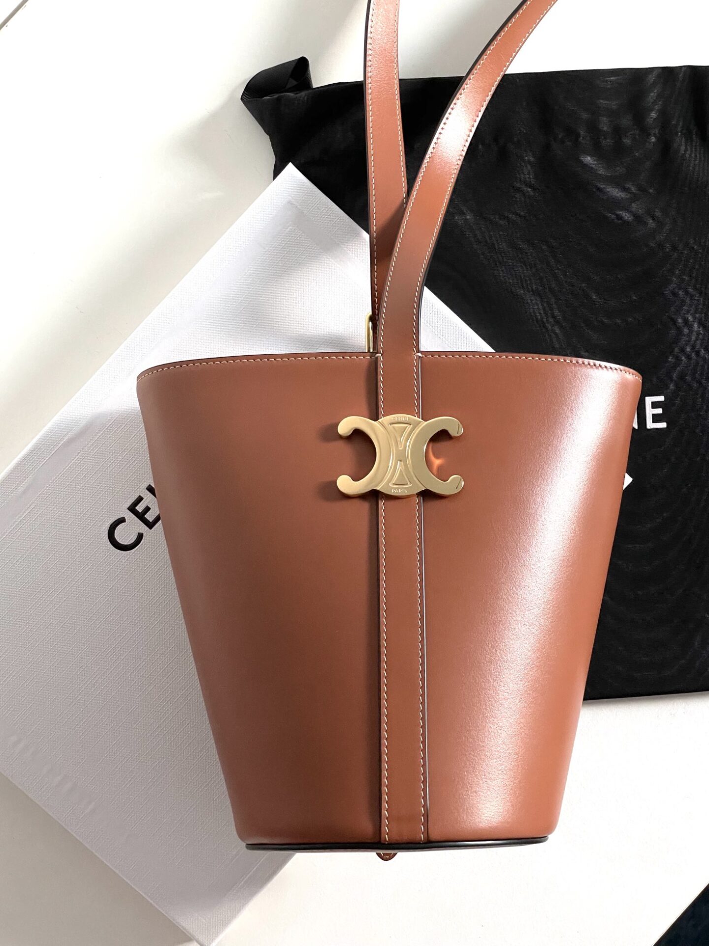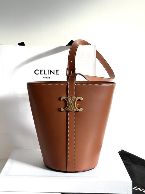 셀린느의 최신 카이세르 버킷백은 고급스러운 소가죽으로 제작되어 뛰어난 광택을 자랑합니다.