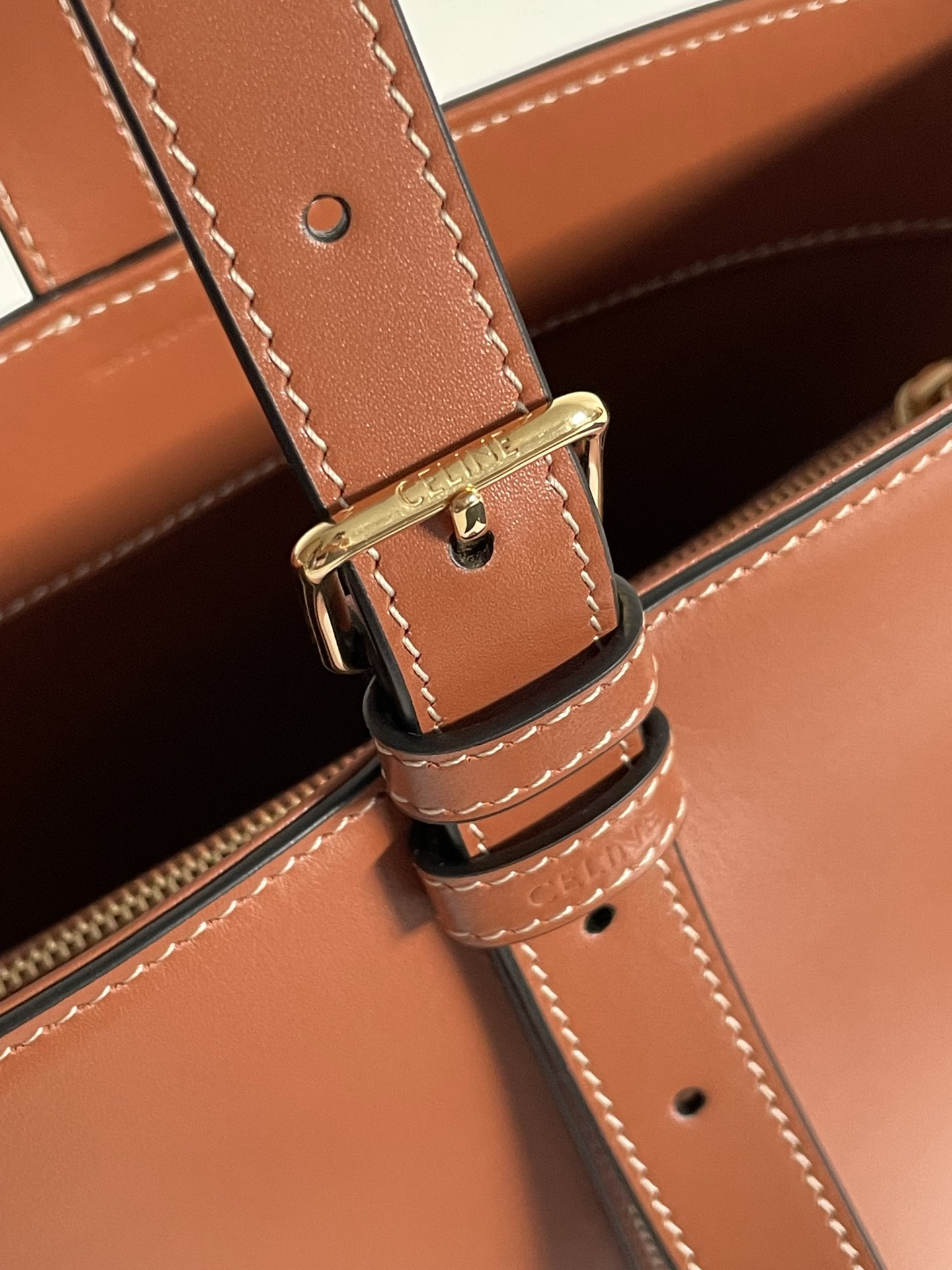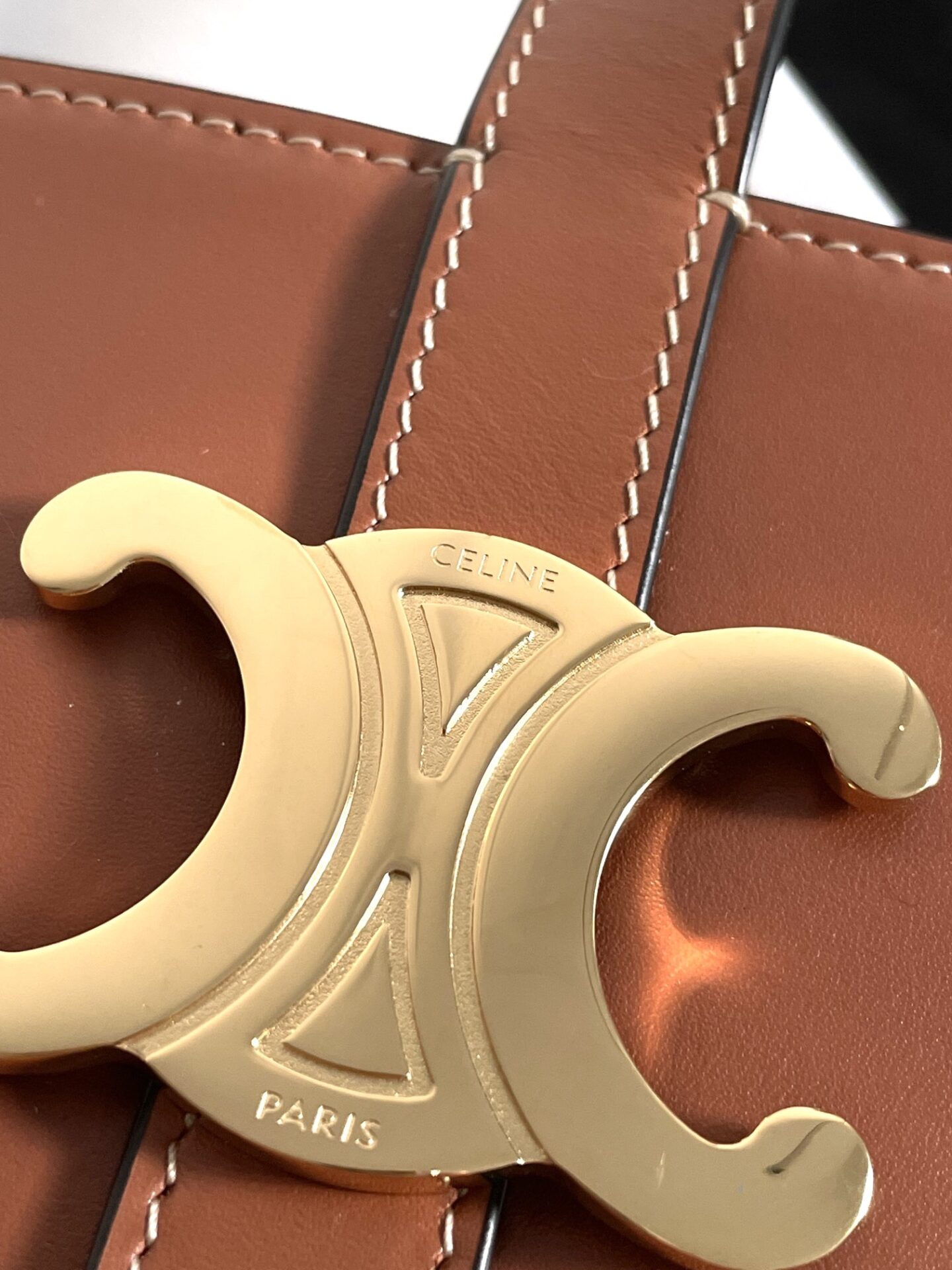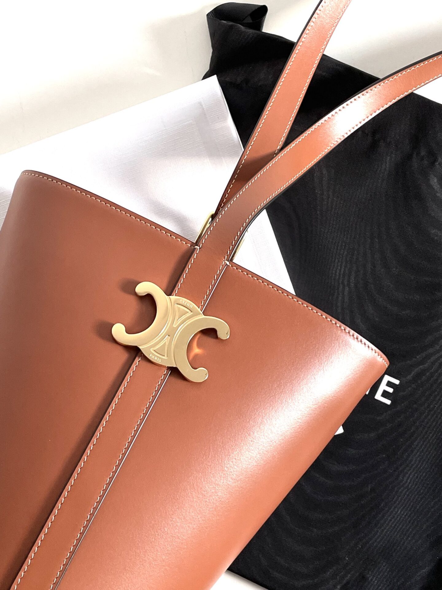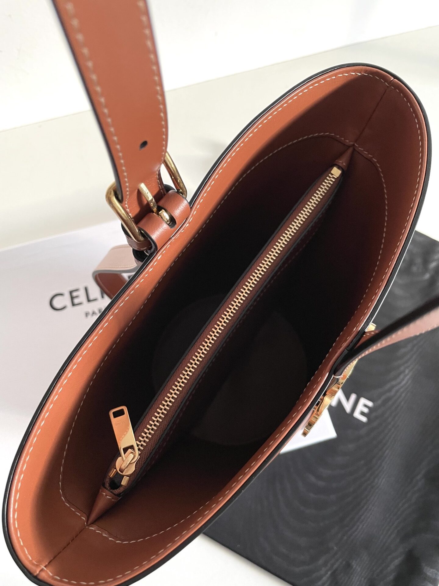 셀린느의 최신 카이세르 버킷백은 고급스러운 소가죽으로 제작되어 뛰어난 광택을 자랑합니다.