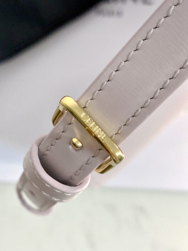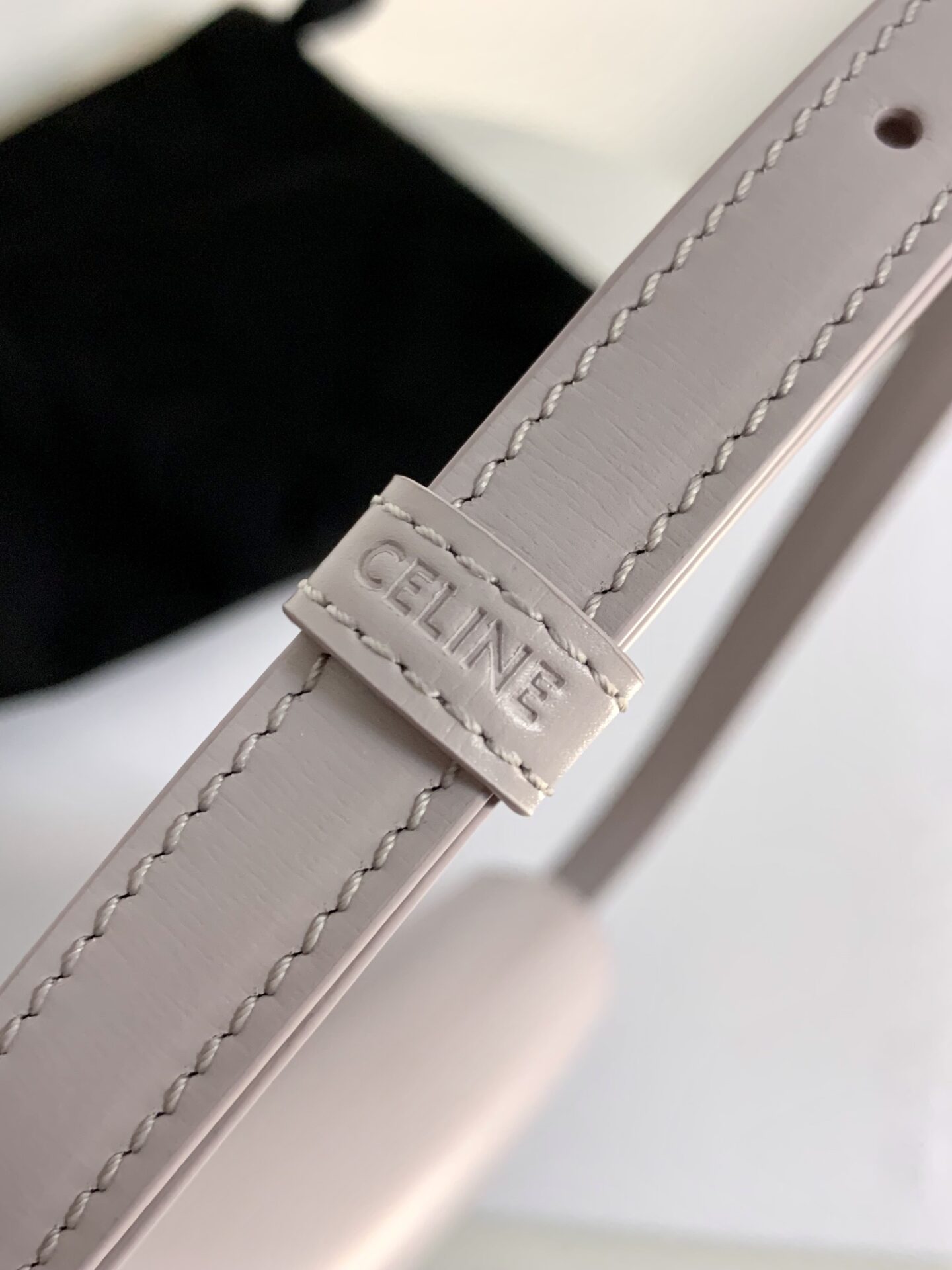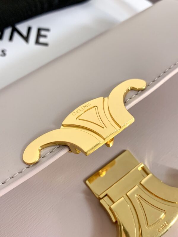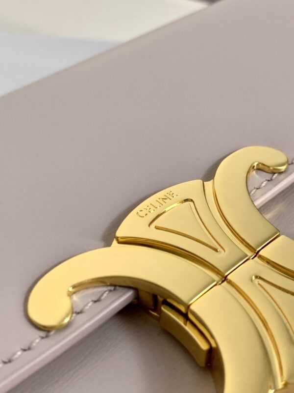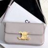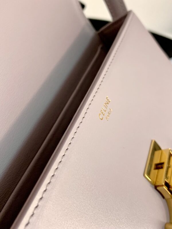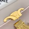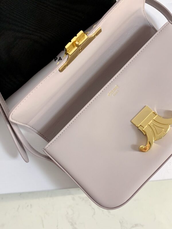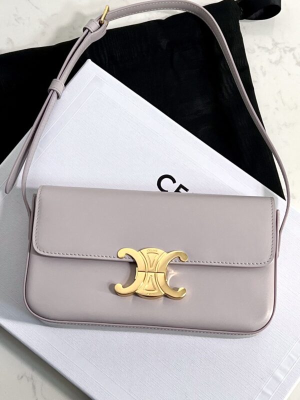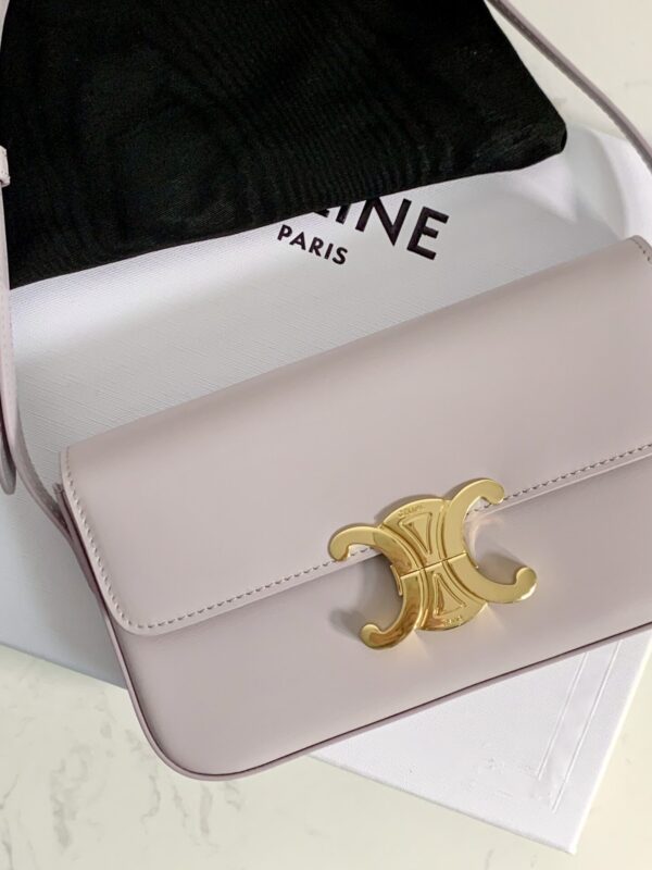 부드러운 라벤더 색상의 셀린느 트리옴프 숄더백입니다. 고급 소가죽과 양가죽으로 제작되어 내구성이 뛰어나며, 부드러운 질감이 특징입니다.
