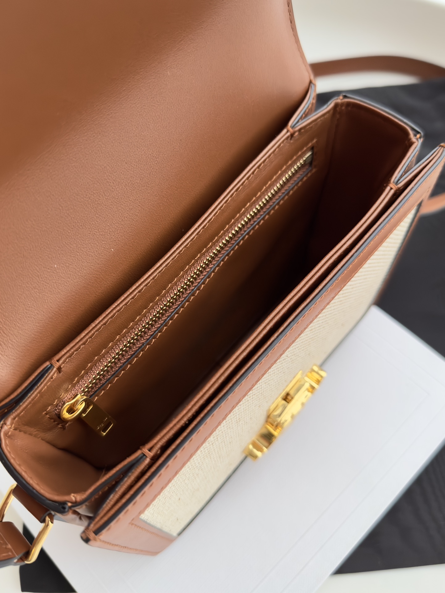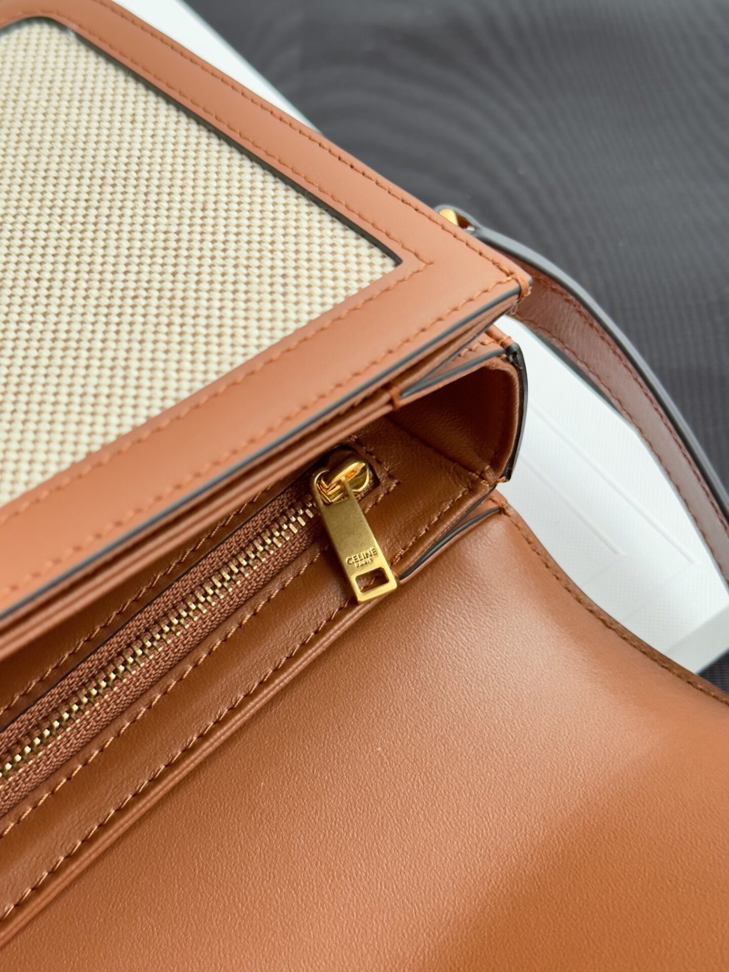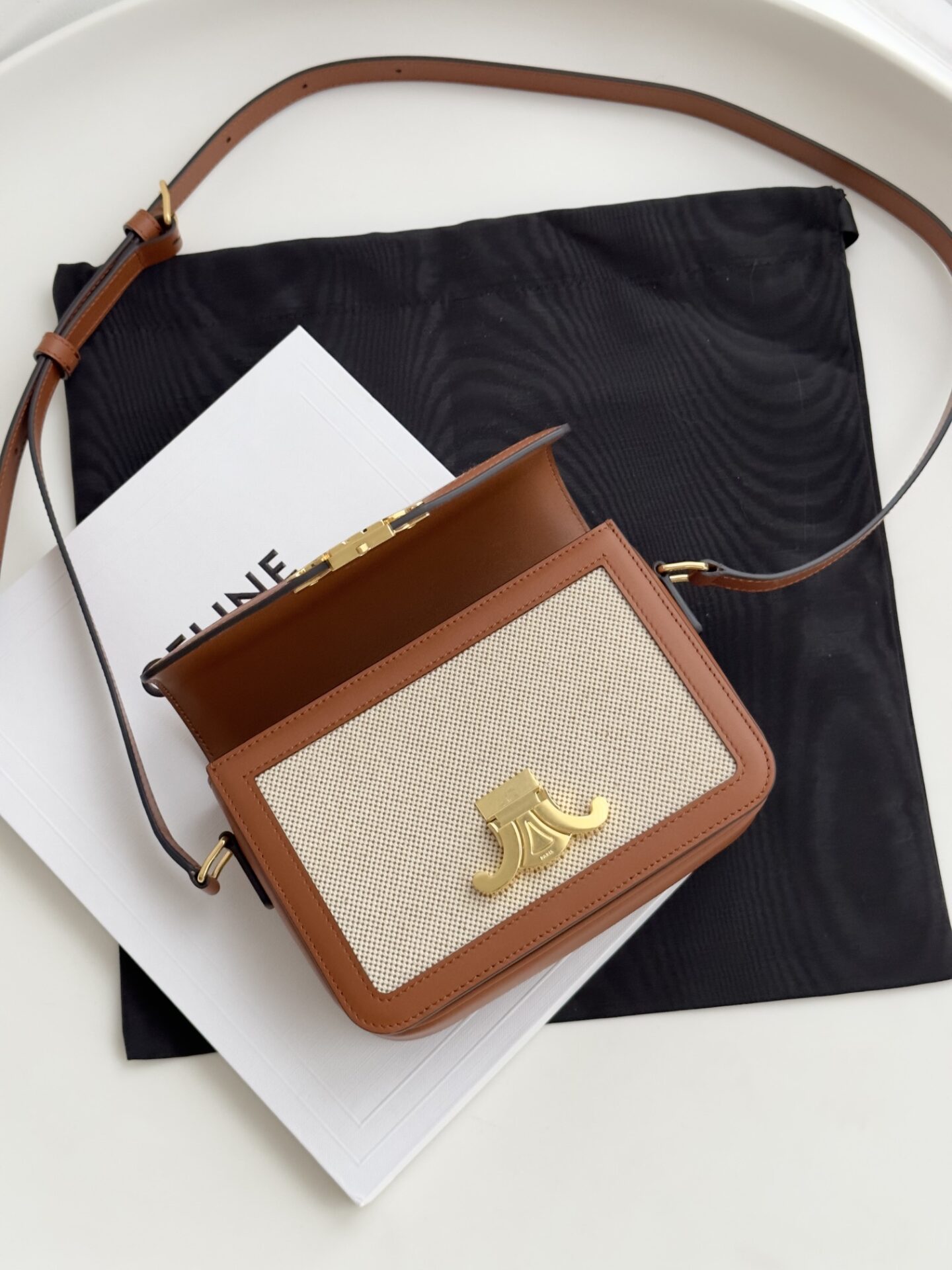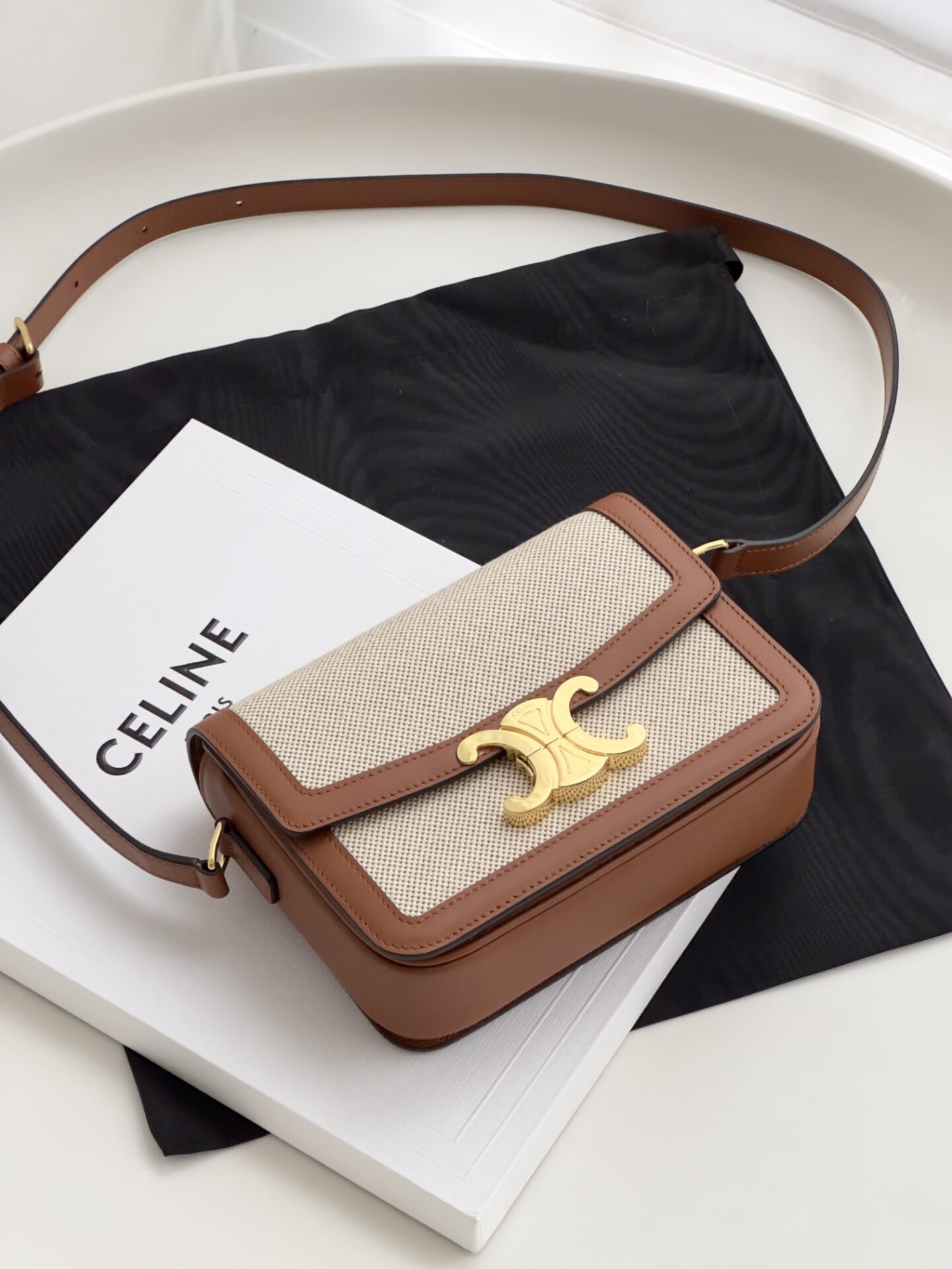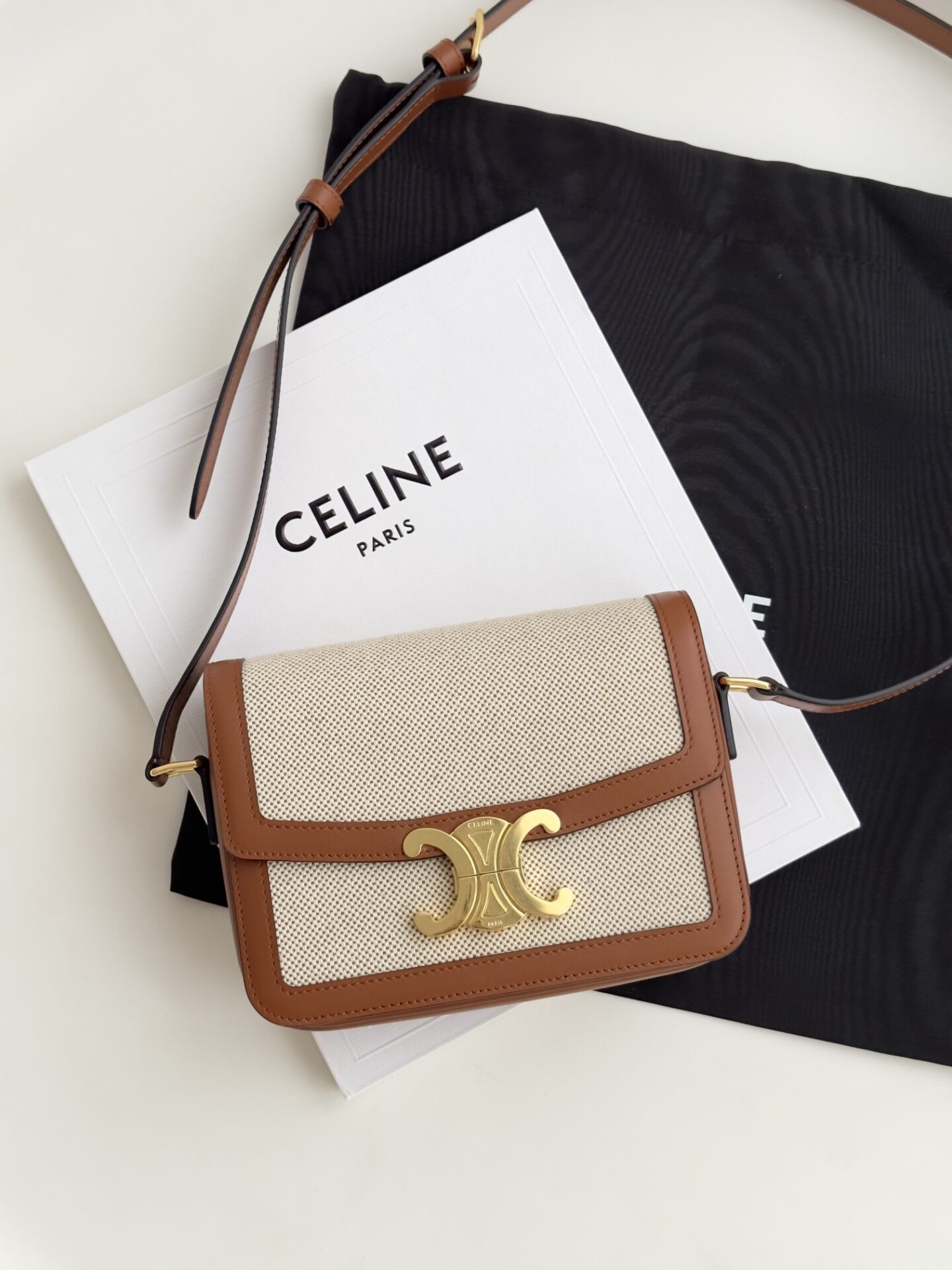 셀린느의 트리옴프 숄더백은 클래식한 디자인과 고급스러운 소재로 제작되었습니다. 베이지와 브라운의 조화로운 색상은 어떤 스타일에도 잘 어울리며, 사계절 내내 활용하기 좋은 아이템입니다.