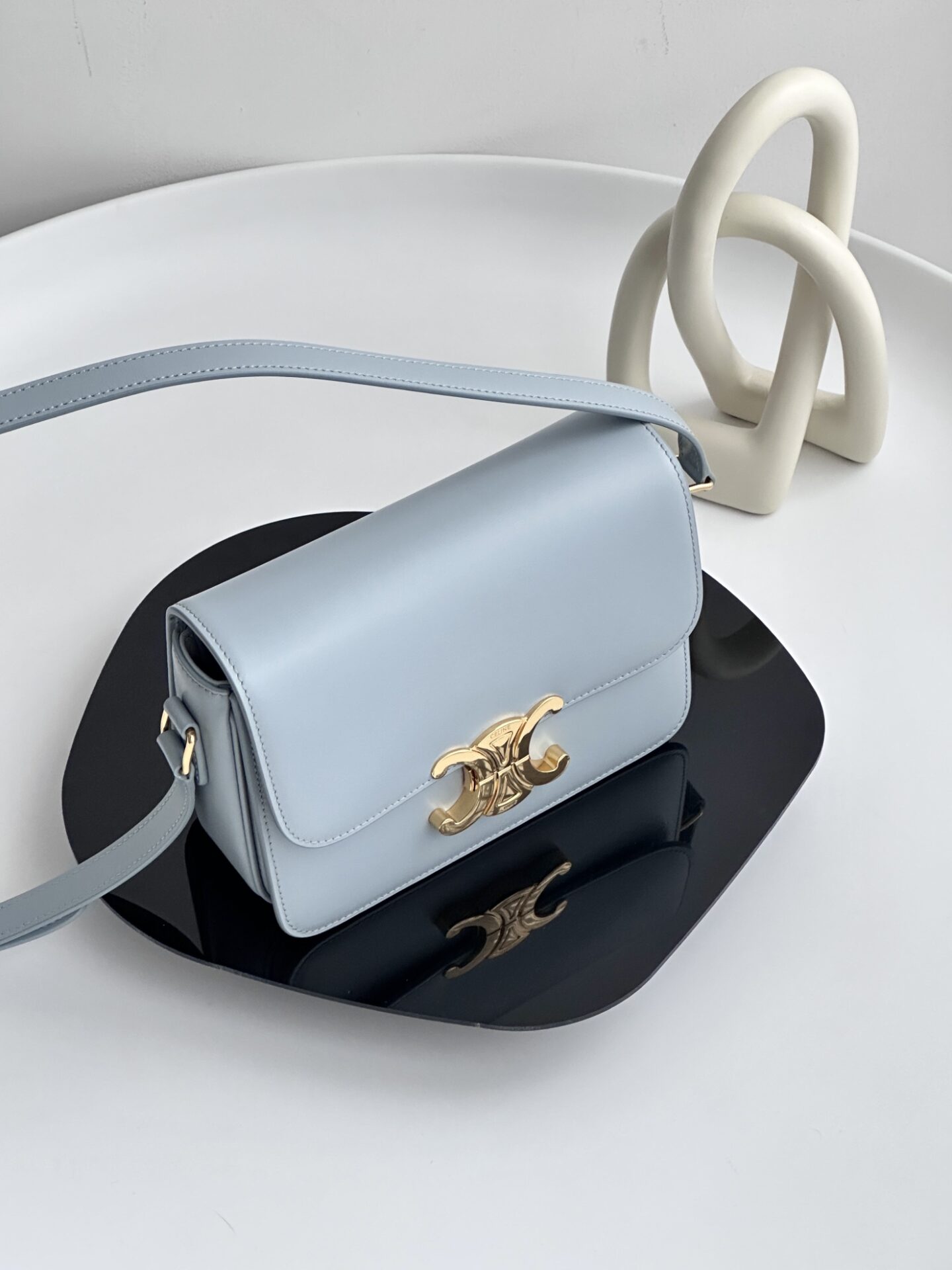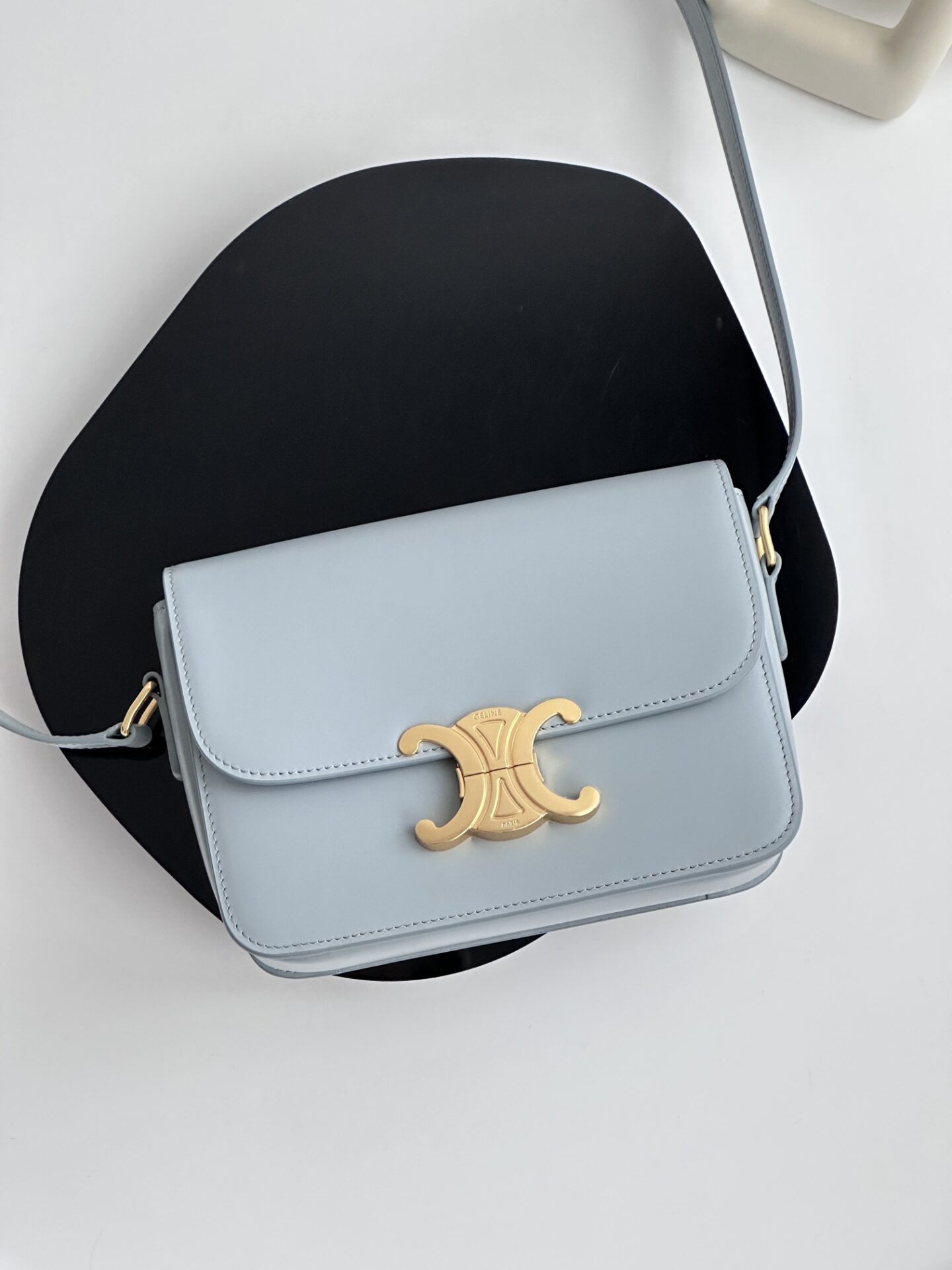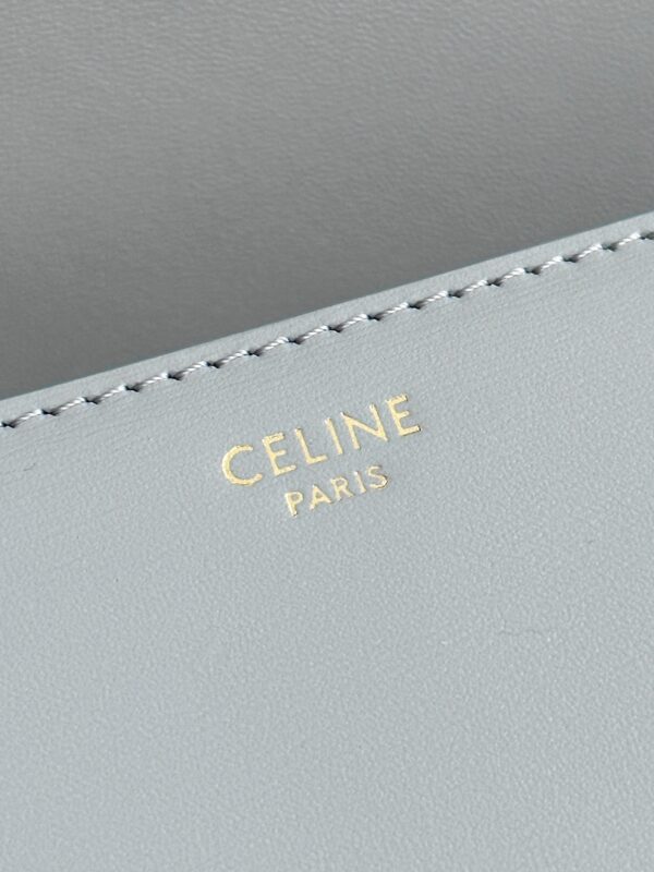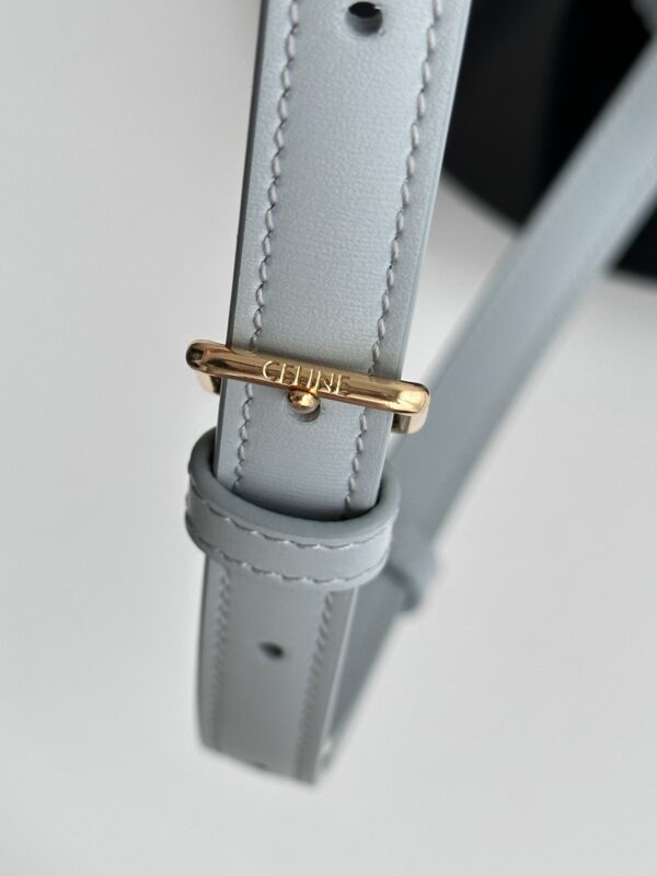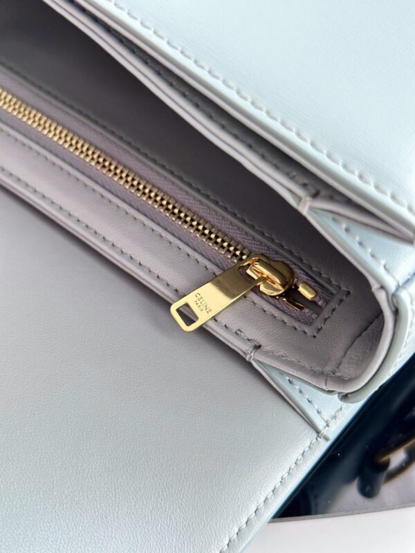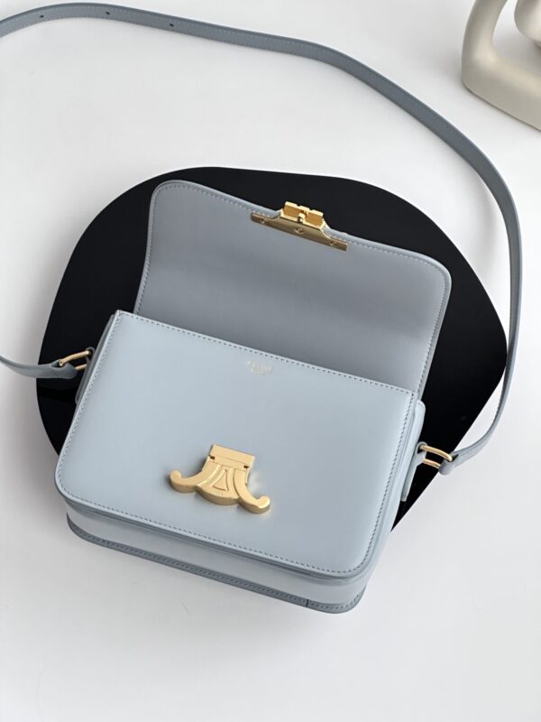 셀린느 트리옴프 크로스백은 클래식한 디자인으로, 어떤 스타일에도 잘 어울립니다. 부드러운 라이트 블루 색상과 고급스러운 가죽 소재가 매력적이며, 손에 닿는 느낌이 매우 우수합니다.