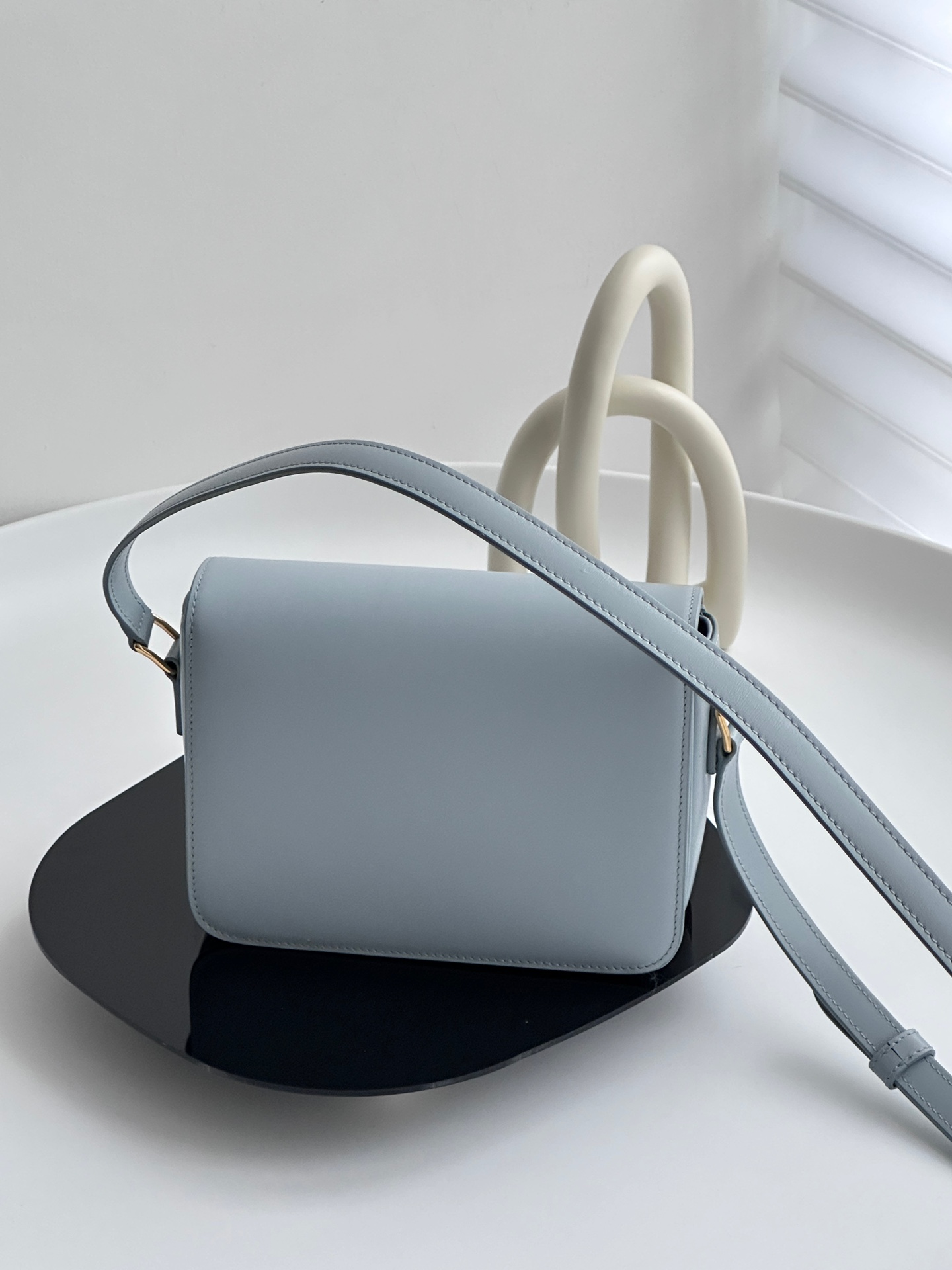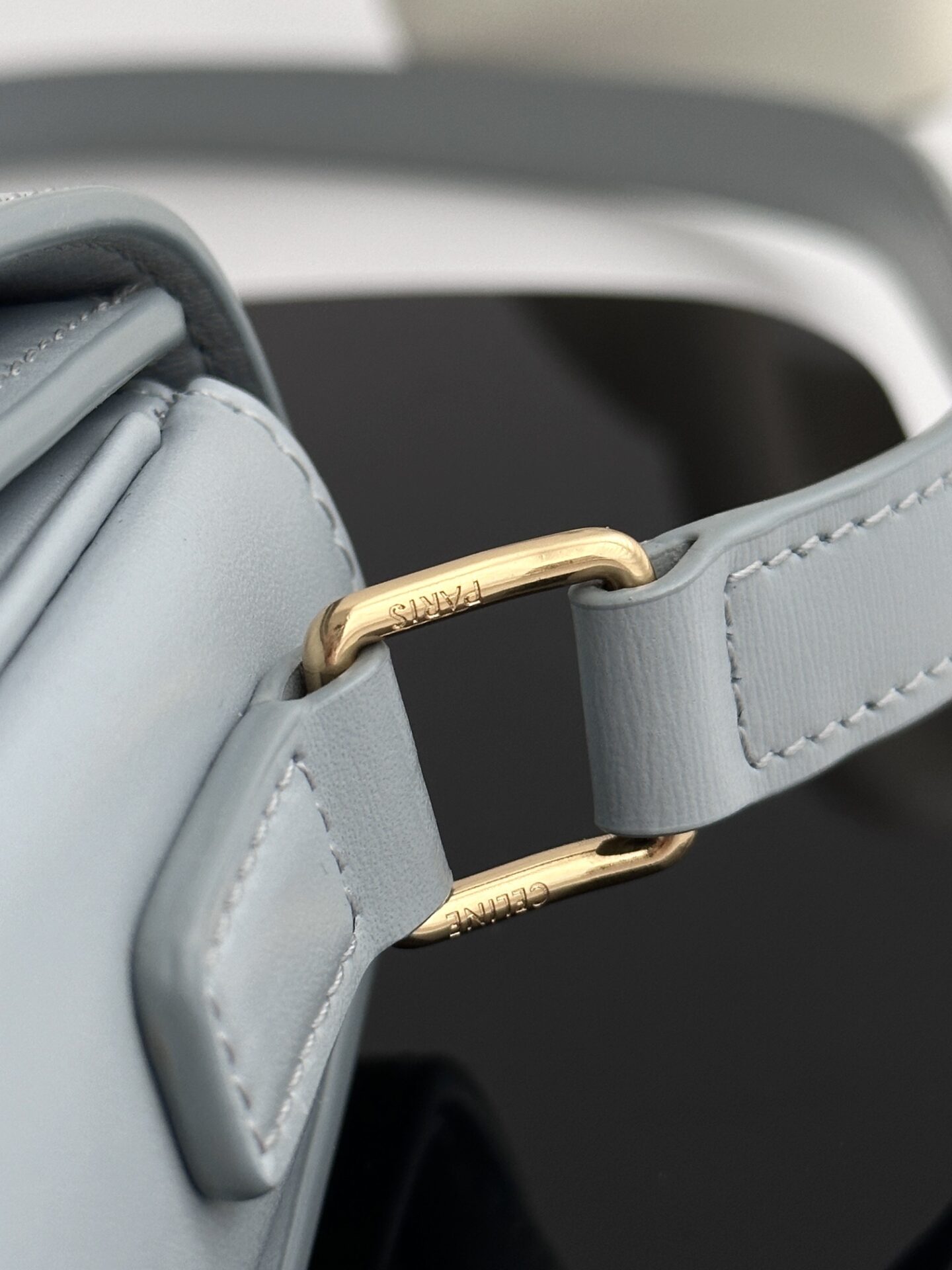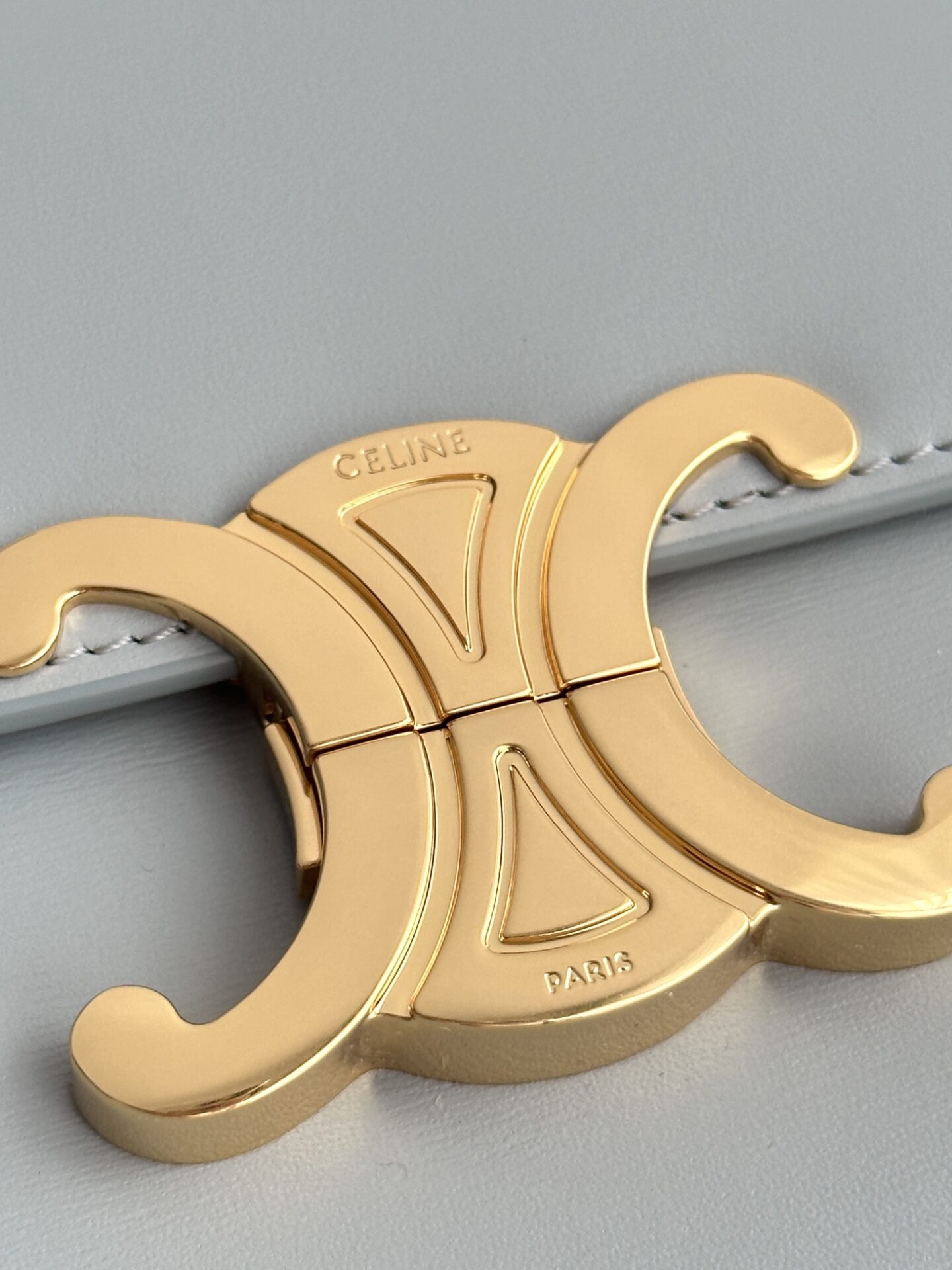셀린느 트리옴프 크로스백은 클래식한 디자인으로, 어떤 스타일에도 잘 어울립니다. 부드러운 라이트 블루 색상과 고급스러운 가죽 소재가 매력적이며, 손에 닿는 느낌이 매우 우수합니다.