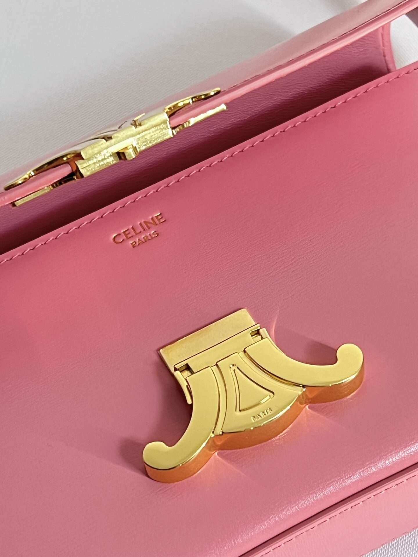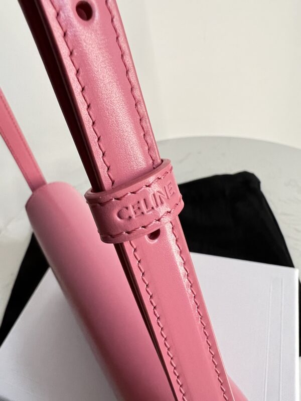 트렌디한 핑크 컬러의 셀린느 트리옴프 크로스백입니다. 소가죽 소재로 제작되어 고급스러운 질감을 자랑하며, 부드러운 촉감이 특징입니다.