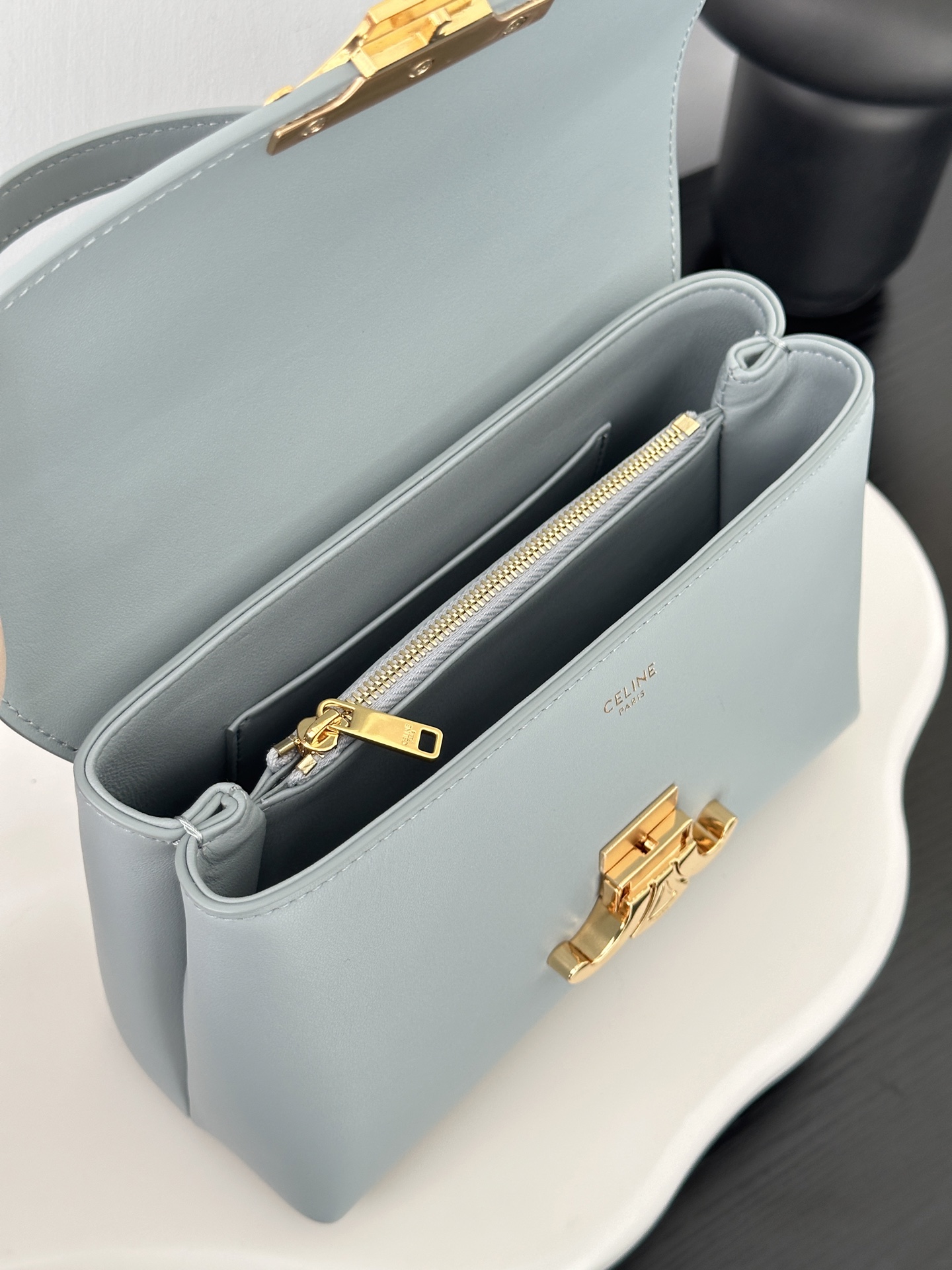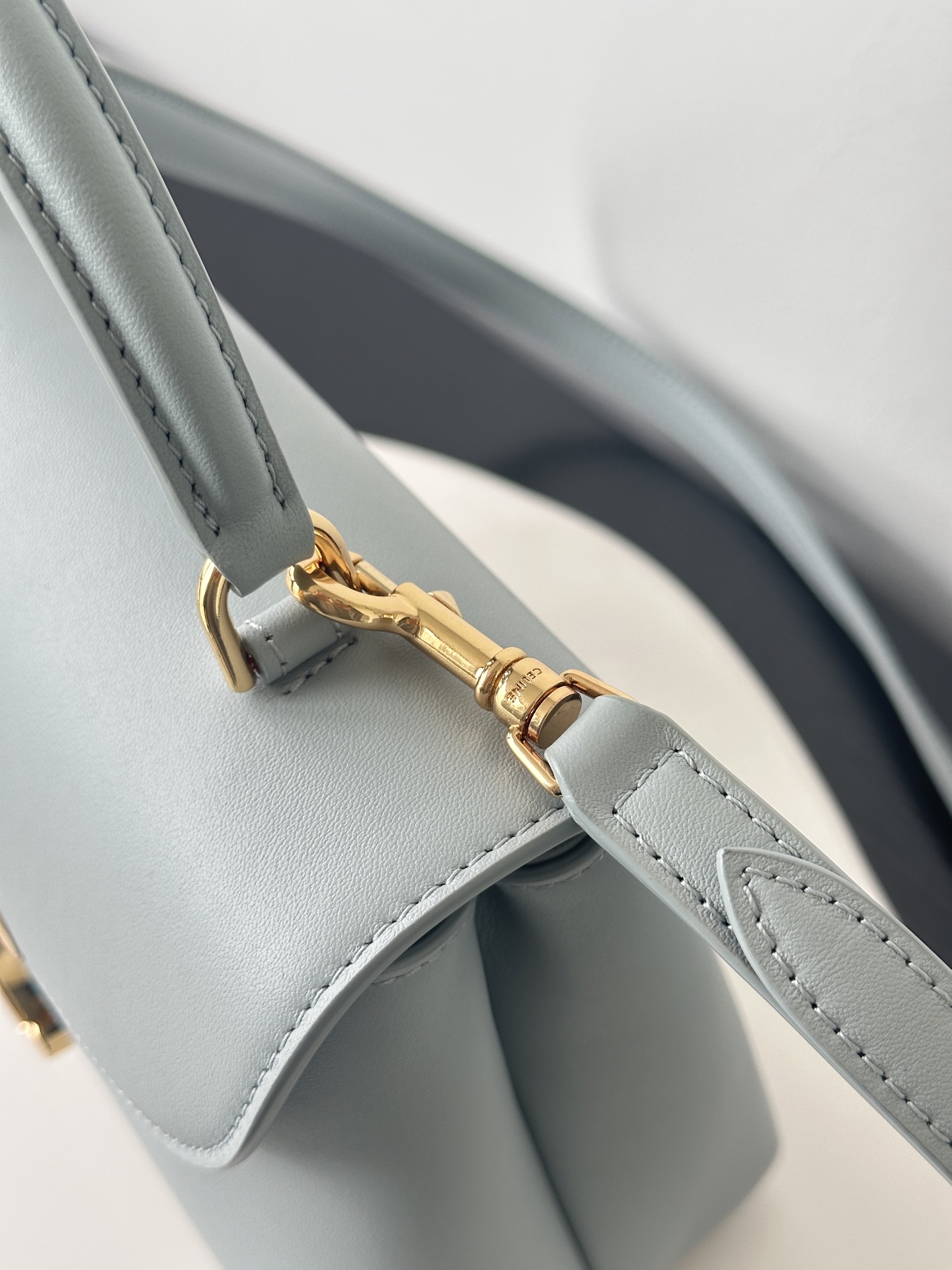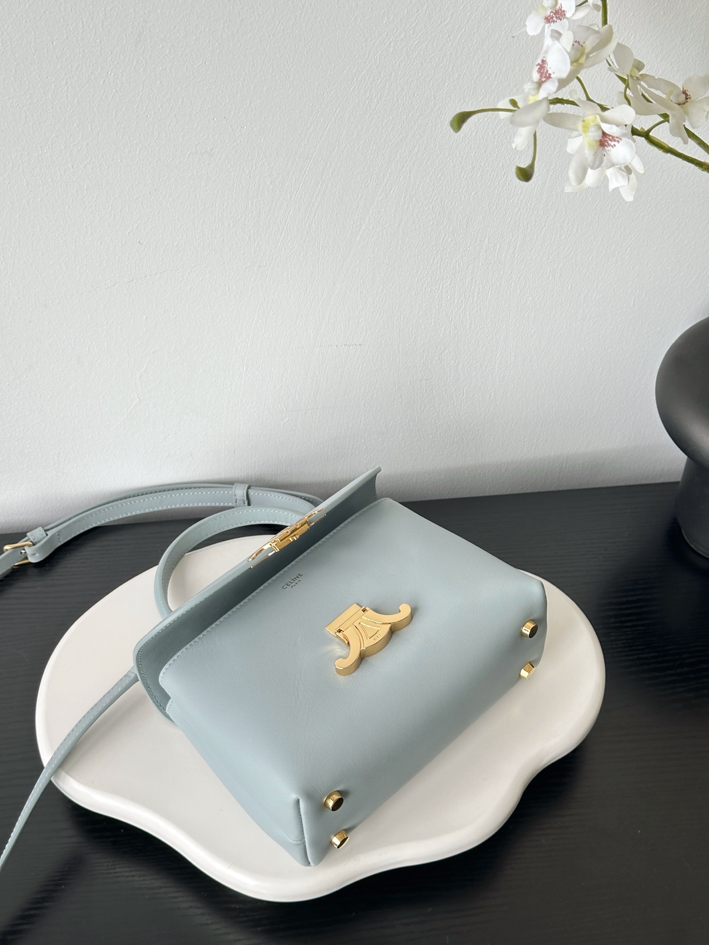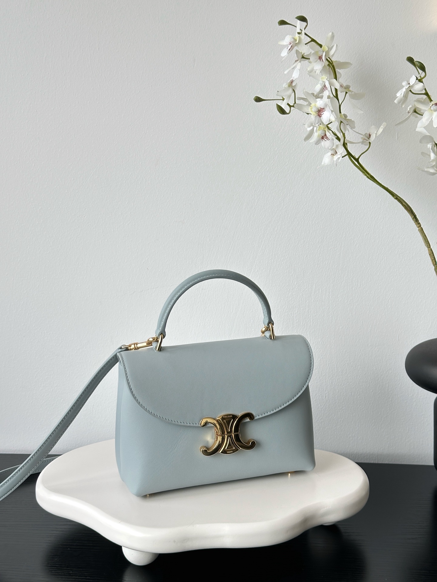 부드러운 블루 컬러와 골드 하드웨어가 조화를 이루어 고급스러운 느낌을 줍니다. 단일 손잡이 디자인으로 우아함을 더하며, 작은 사이즈임에도 불구하고 일상에서 활용하기에 적합합니다.