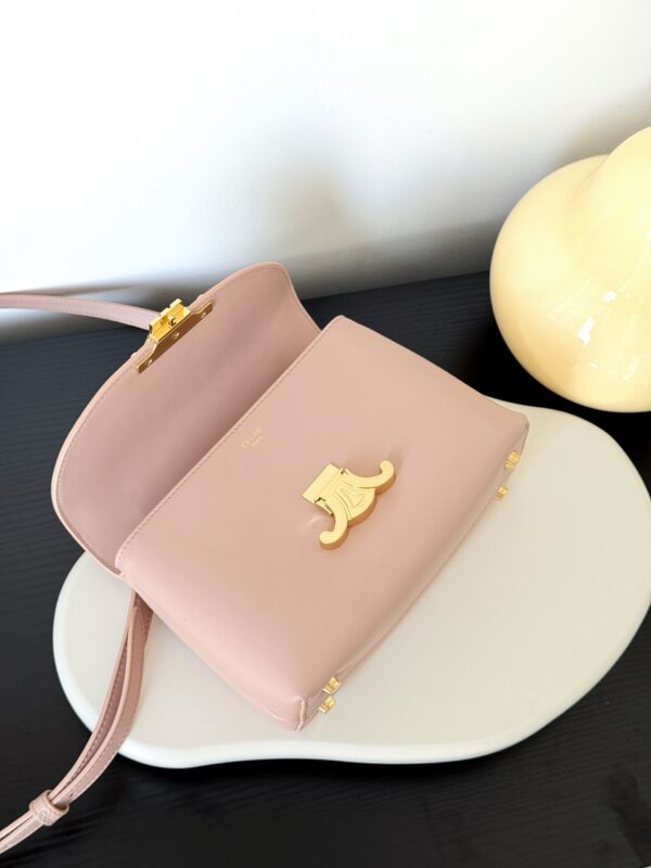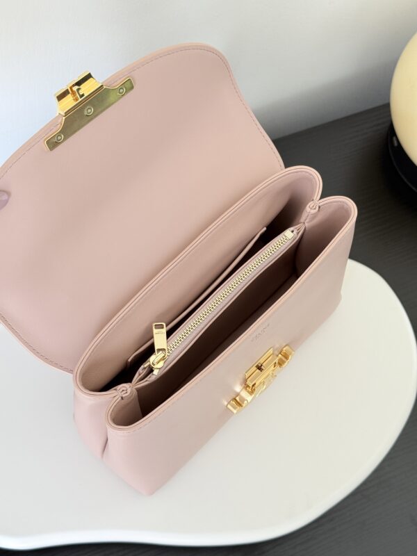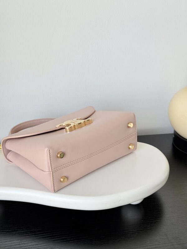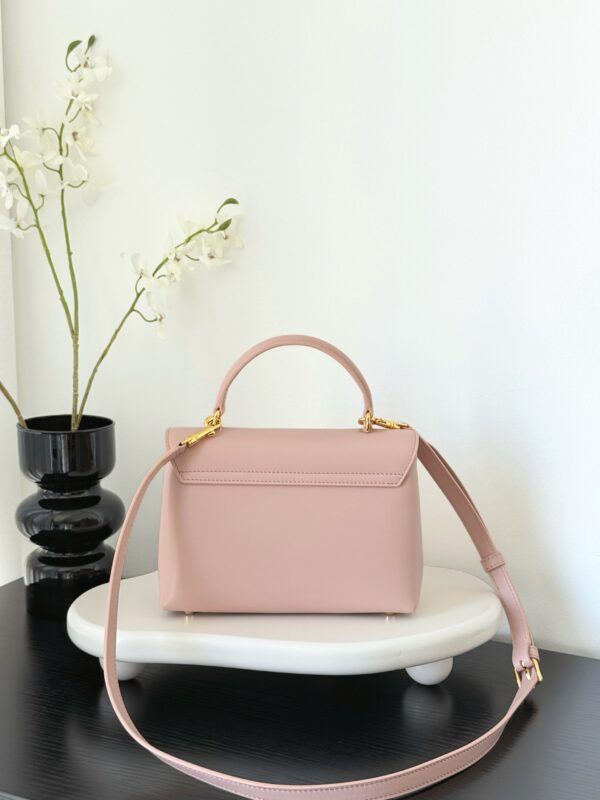 부드러운 핑크 컬러와 골드 하드웨어가 조화를 이루어 고급스러움을 더합니다. 단일 손잡이 디자인으로 우아함을 강조하며, 전체적인 실루엣은 ‘반항적인 귀족’의 느낌을 줍니다.