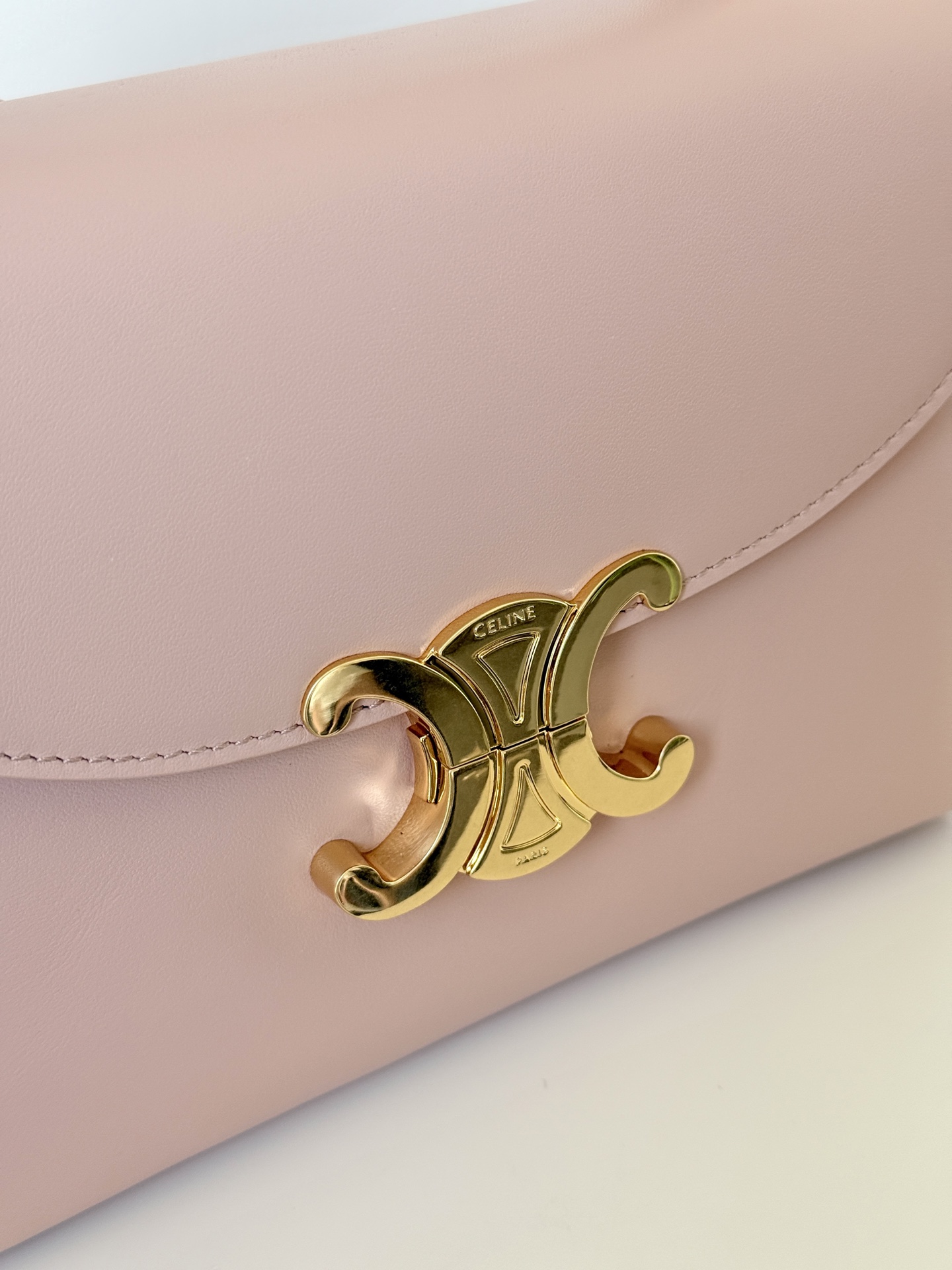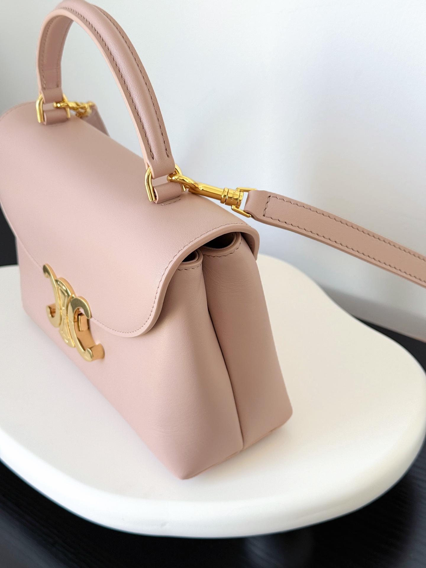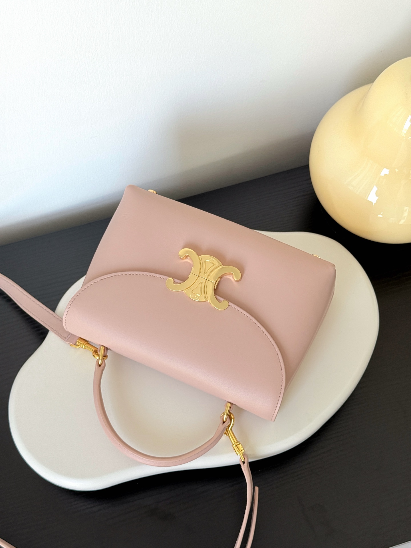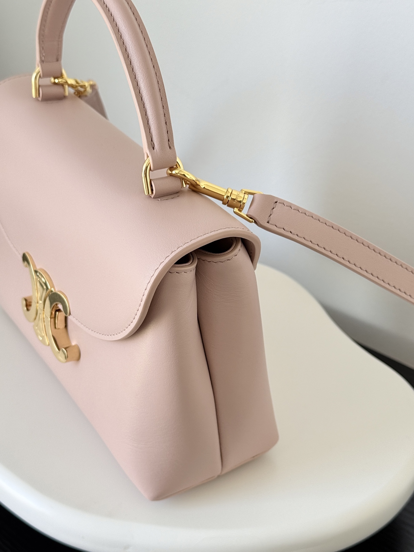 부드러운 핑크 컬러와 골드 하드웨어가 조화를 이루어 고급스러움을 더합니다. 단일 손잡이 디자인으로 우아함을 강조하며, 전체적인 실루엣은 ‘반항적인 귀족’의 느낌을 줍니다.