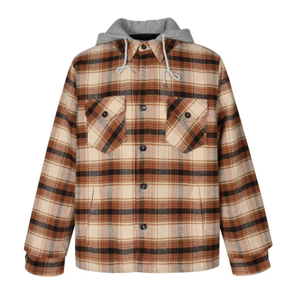 - 후드가 부착된 체크 패턴의 울 소재 셔츠로, 상의용 의류입니다.