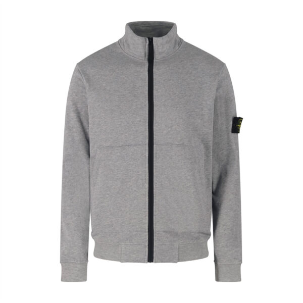 - 스톤아일랜드 브랜드의 집업 재킷으로, 싱글 지퍼 디자인과 와펜 패치가 적용되어 있습니다.