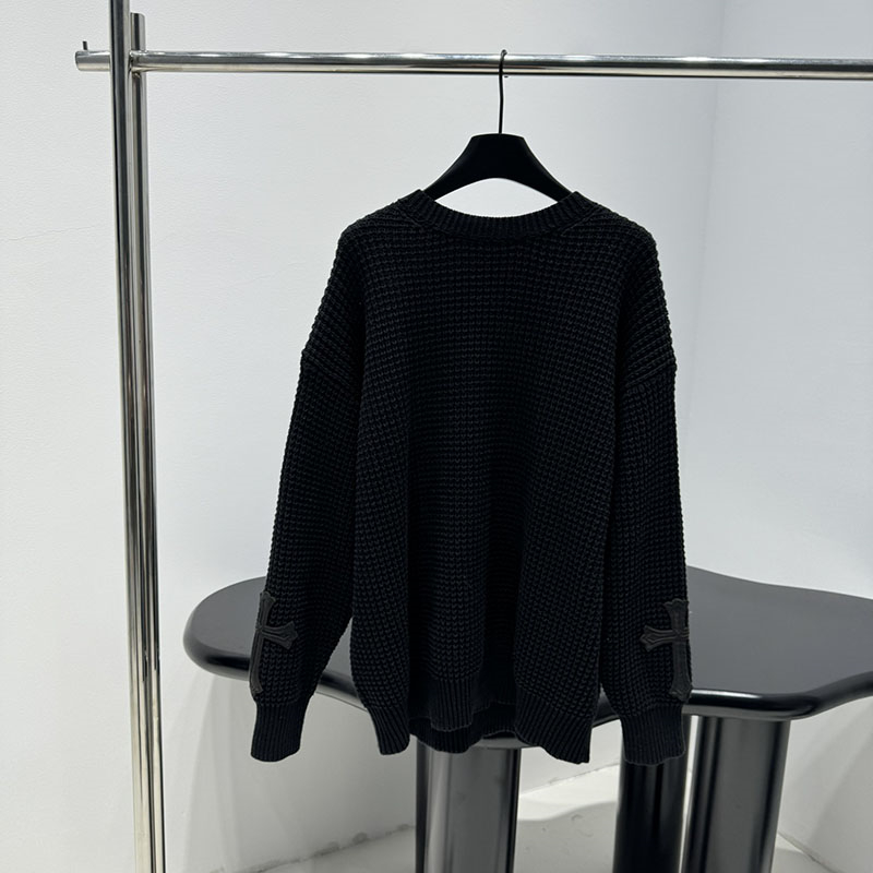 크롬하츠 레더 스웨터 니트 크로스 패치는 니트 소재로 제작된 상의입니다. 레더 크로스 패치 디자인이 적용되어 있습니다.
