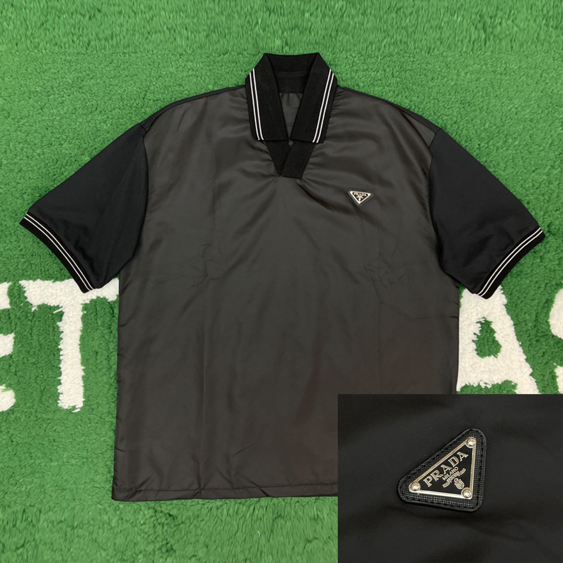 - 프라다에서 제작한 폴로 카라 반팔 티셔츠입니다.