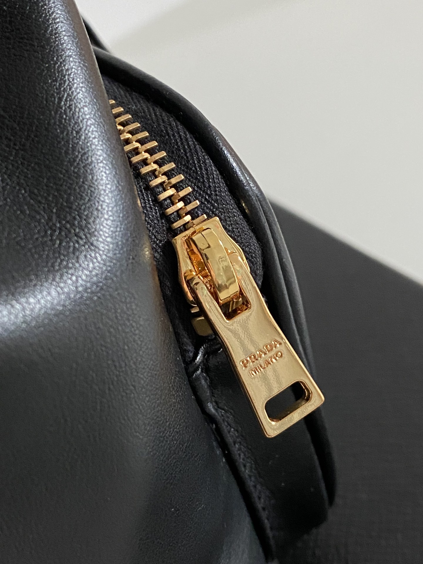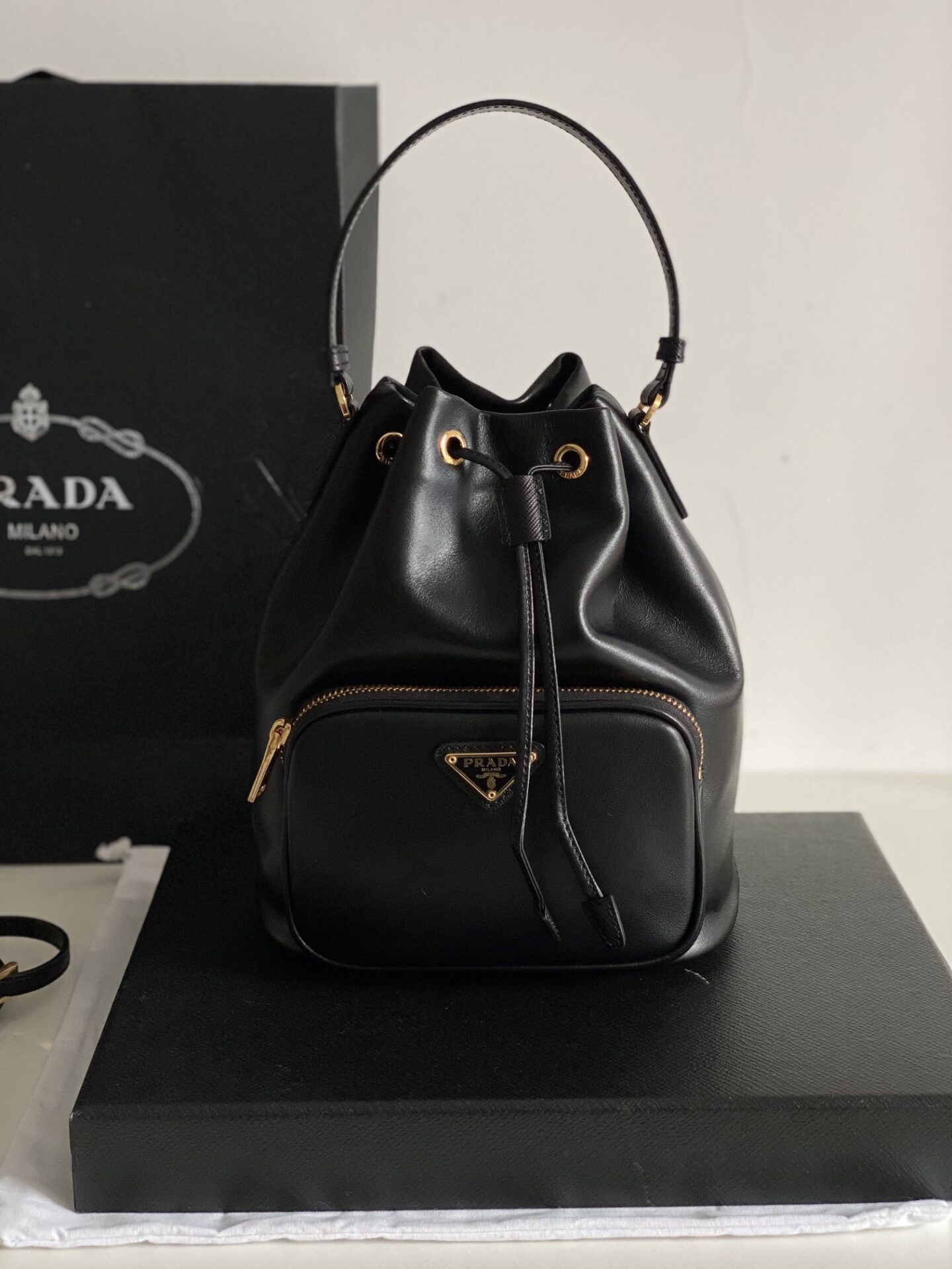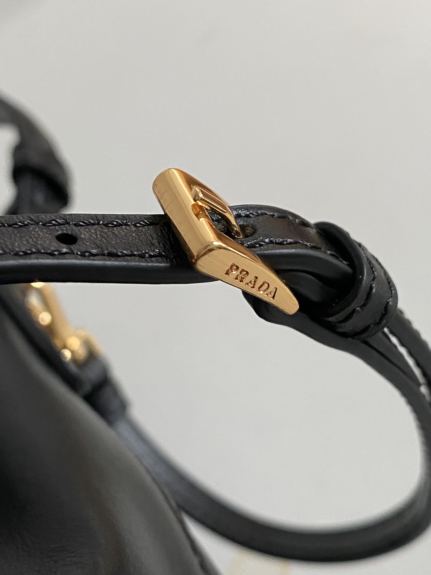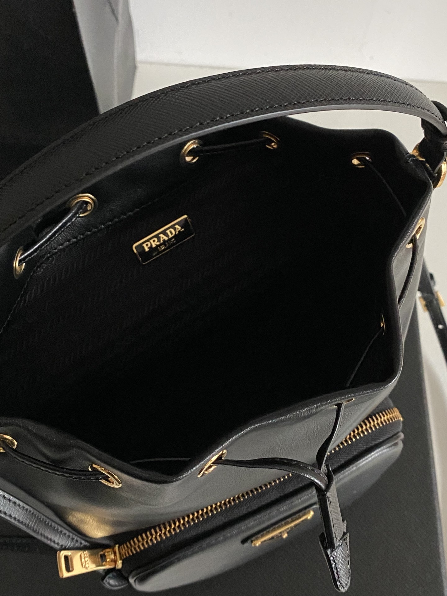 프라다의 니론 미니 물통백은 고급스러운 블랙 컬러로 어떤 스타일에도 잘 어울립니다.