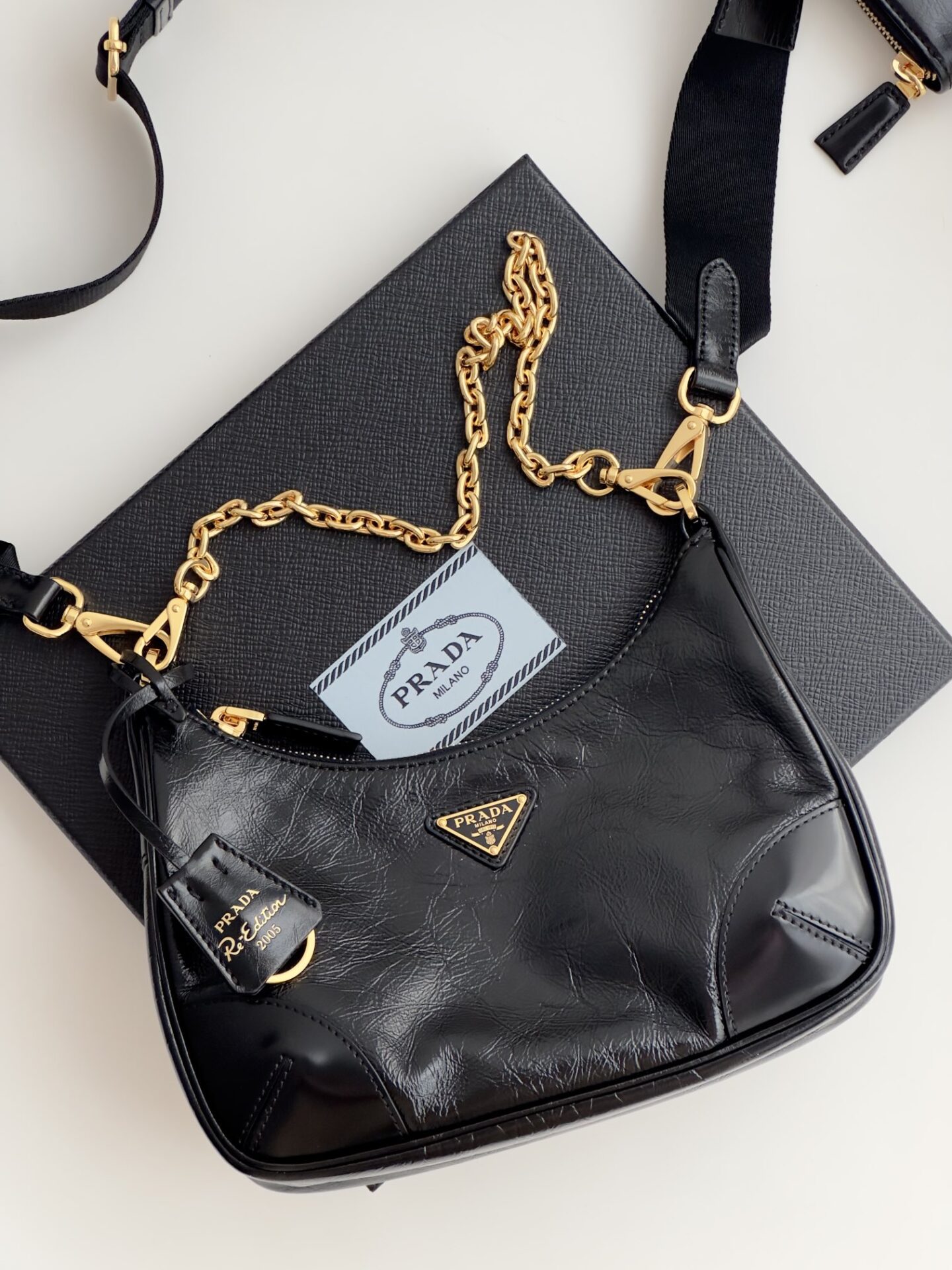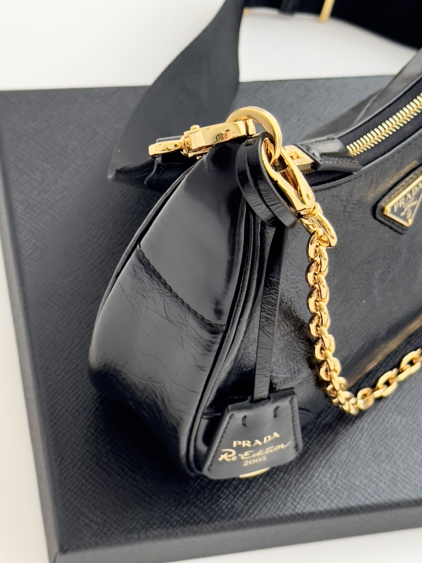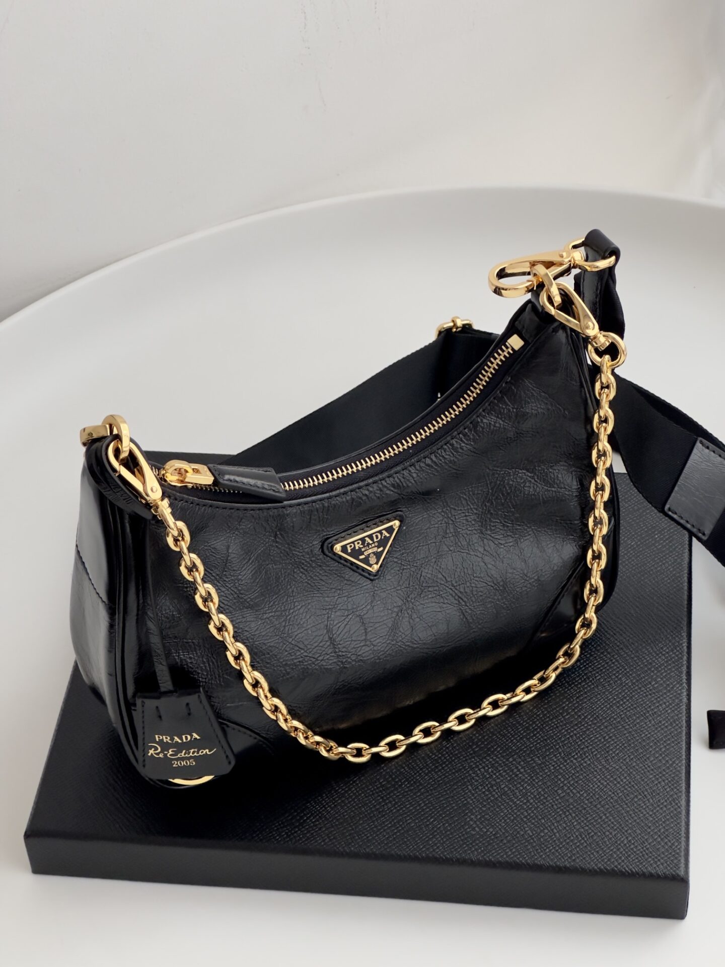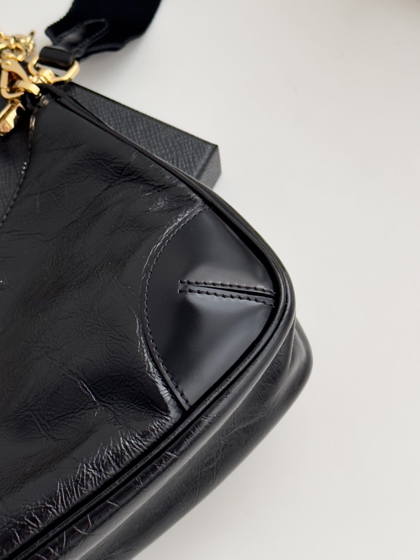 프라다의 삼합일 오일 왁스 가죽 백은 독특한 질감과 세련된 디자인이 돋보입니다.