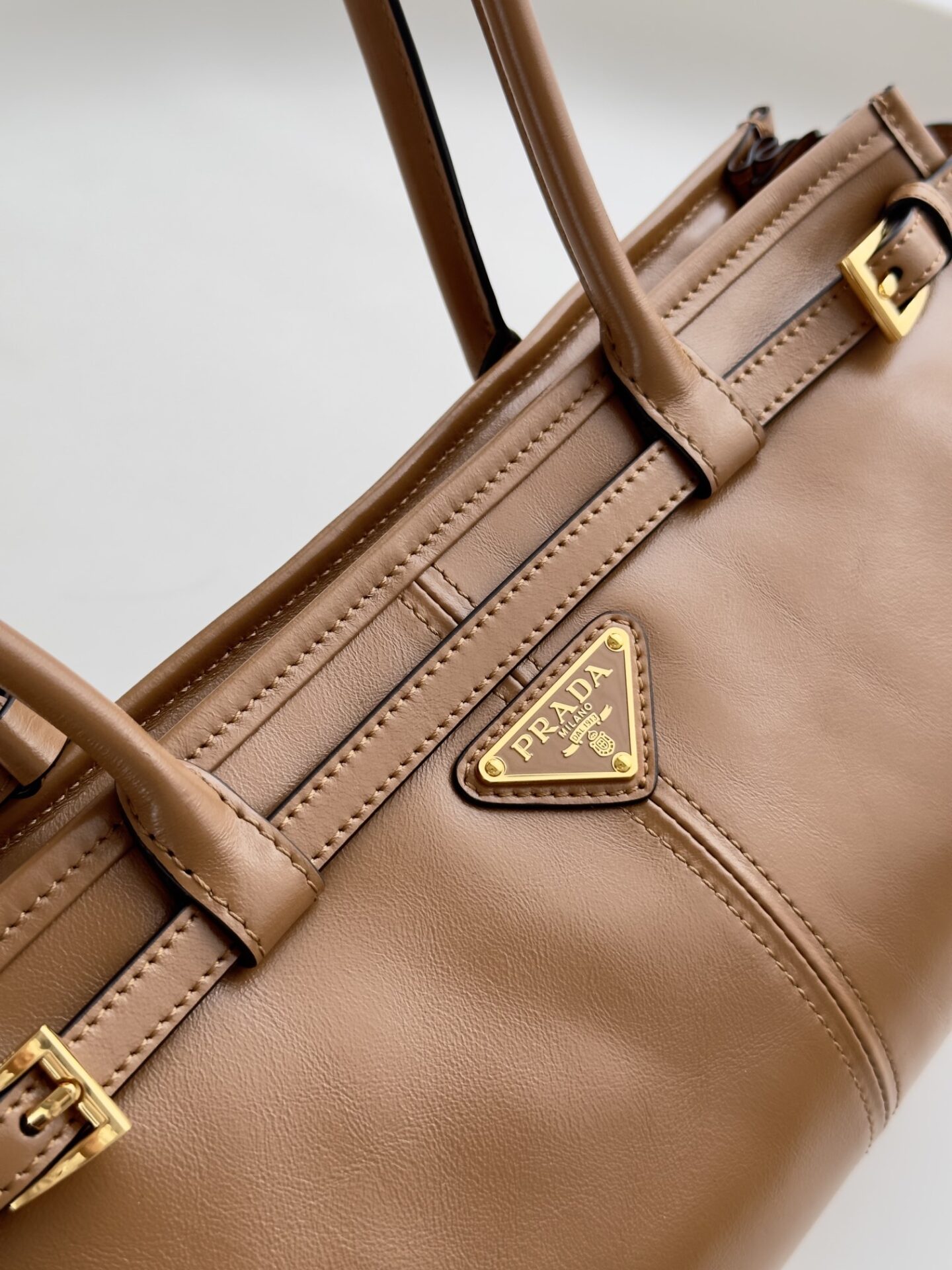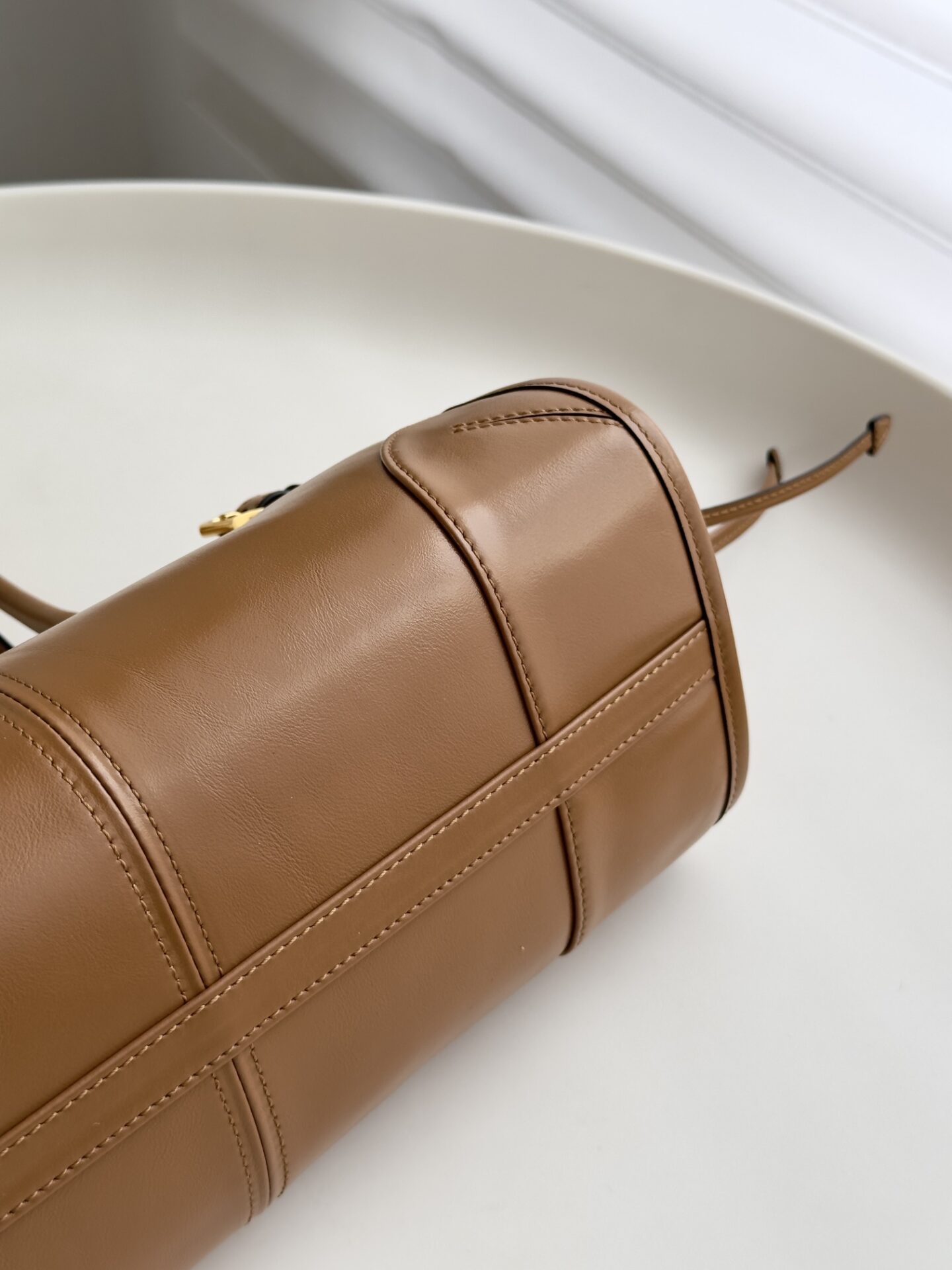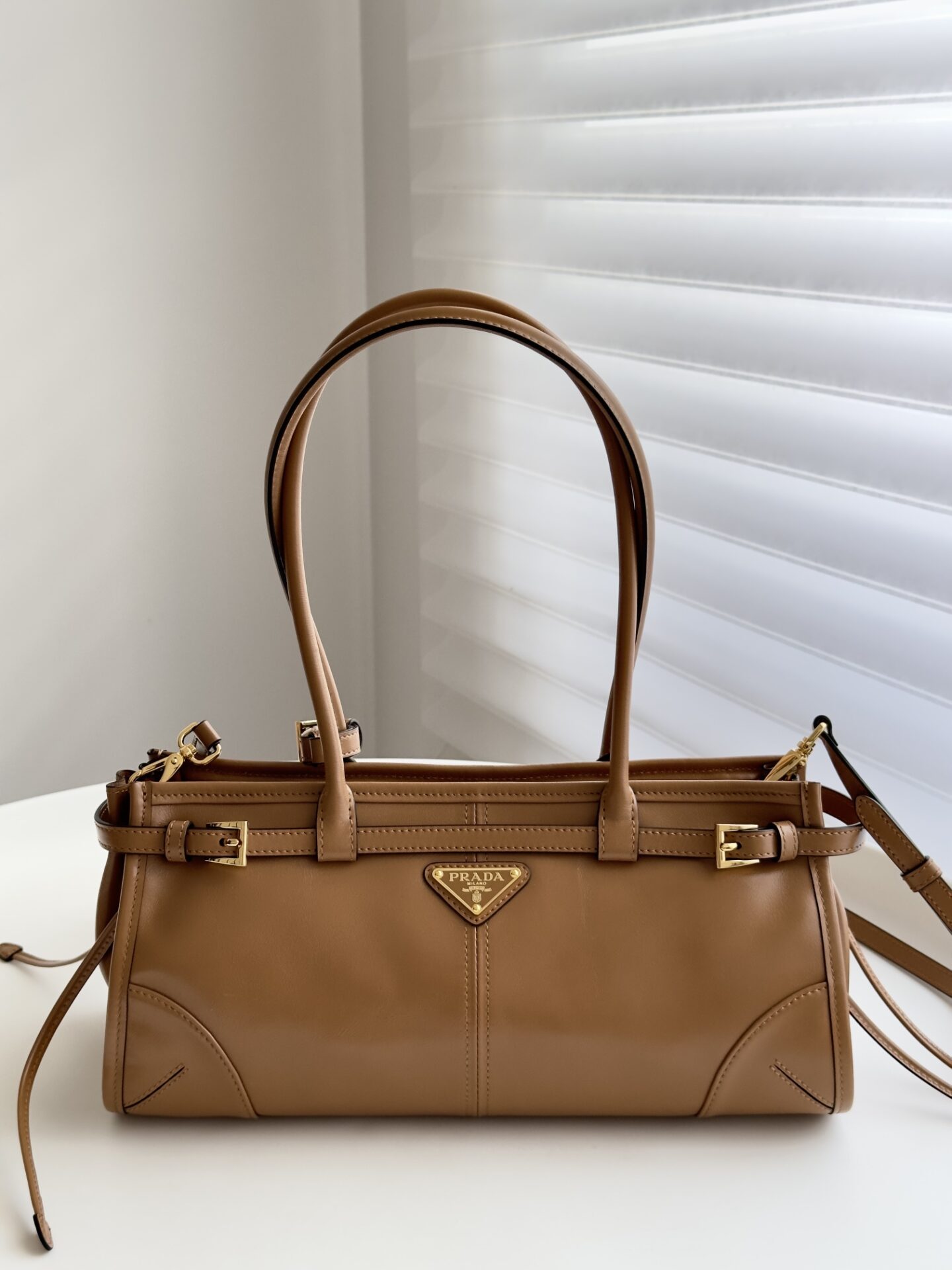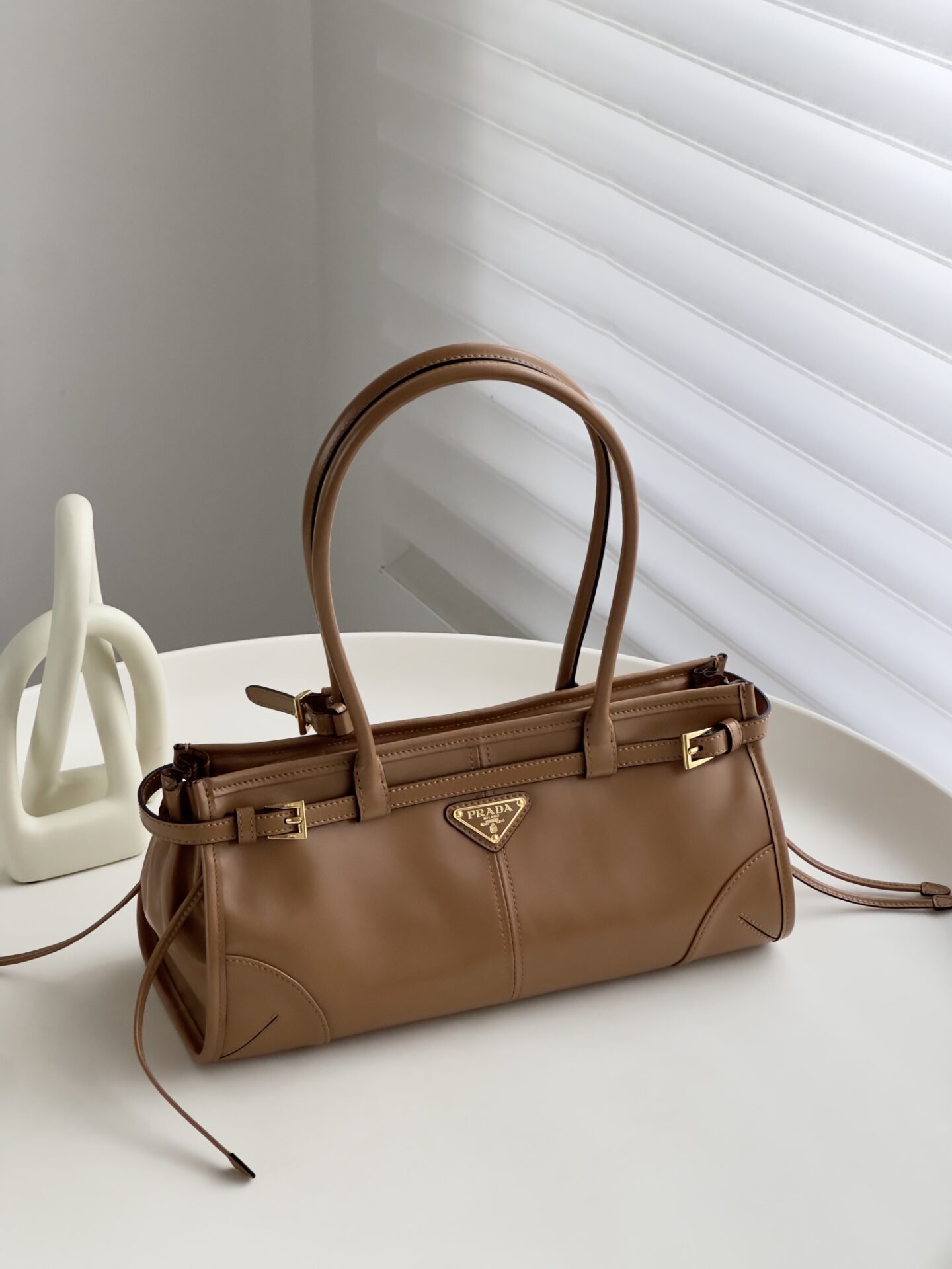 프라다의 소프트 럭스 미니 백은 빈티지 바게트 스타일로, 오일 왁스 가죽 소재로 제작되어 내구성이 뛰어납니다.