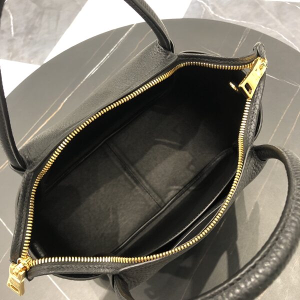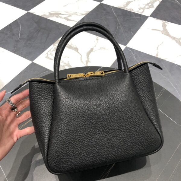 부드러운 곡선 형태의 디자인과 더불어, 이중 손잡이 및 이중 지퍼 디자인이 독특한 매력을 더합니다. 내부는 부드러운 양가죽으로 마감되어 있으며, 하나의 격층과 두 개의 포켓이 있어 실용성 또한 뛰어납니다.