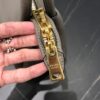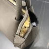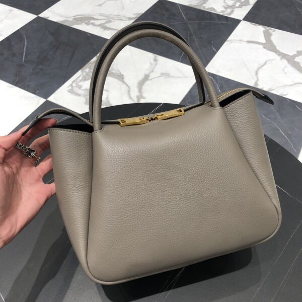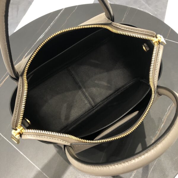 세련된 디자인의 삼각형 로고와 금속 각인 로고가 중앙에 위치해 브랜드의 장인 정신을 잘 보여줍니다. 뒷면의 부드러운 곡선 형태가 매력적이며, 이중 손잡이와 이중 지퍼 디자인이 독특한 스타일을 더합니다.