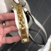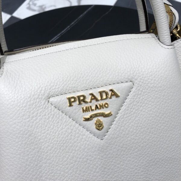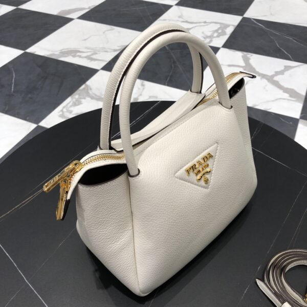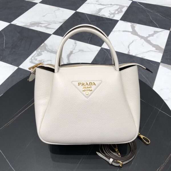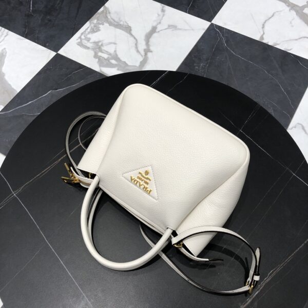 세련된 브러시드 스테인리스 스틸 하드웨어와 독창적인 삼각형 로고가 조화를 이루며, 브랜드의 장인 정신을 잘 표현하고 있습니다.