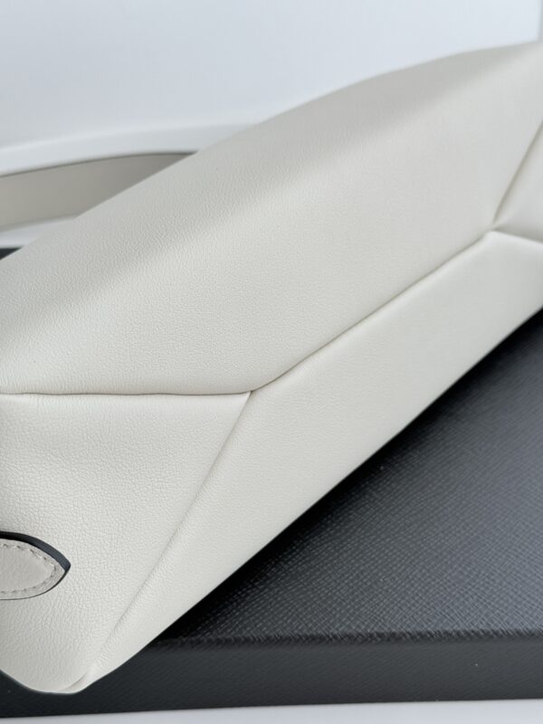 아이보리 색상에 브랜드의 상징적인 삼각 로고가 더해져 세련된 느낌을 줍니다.