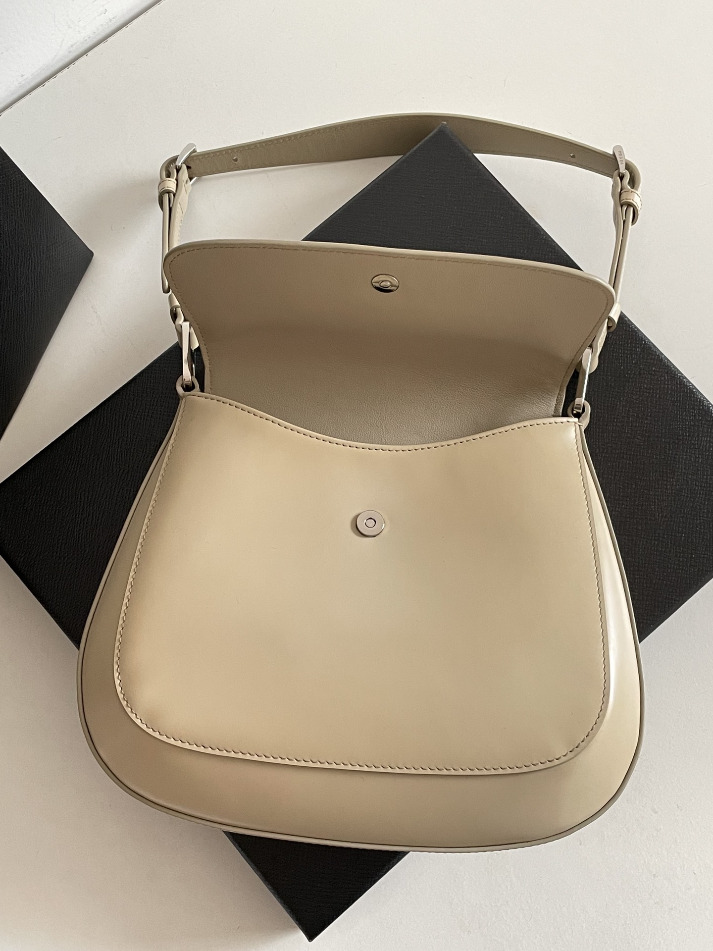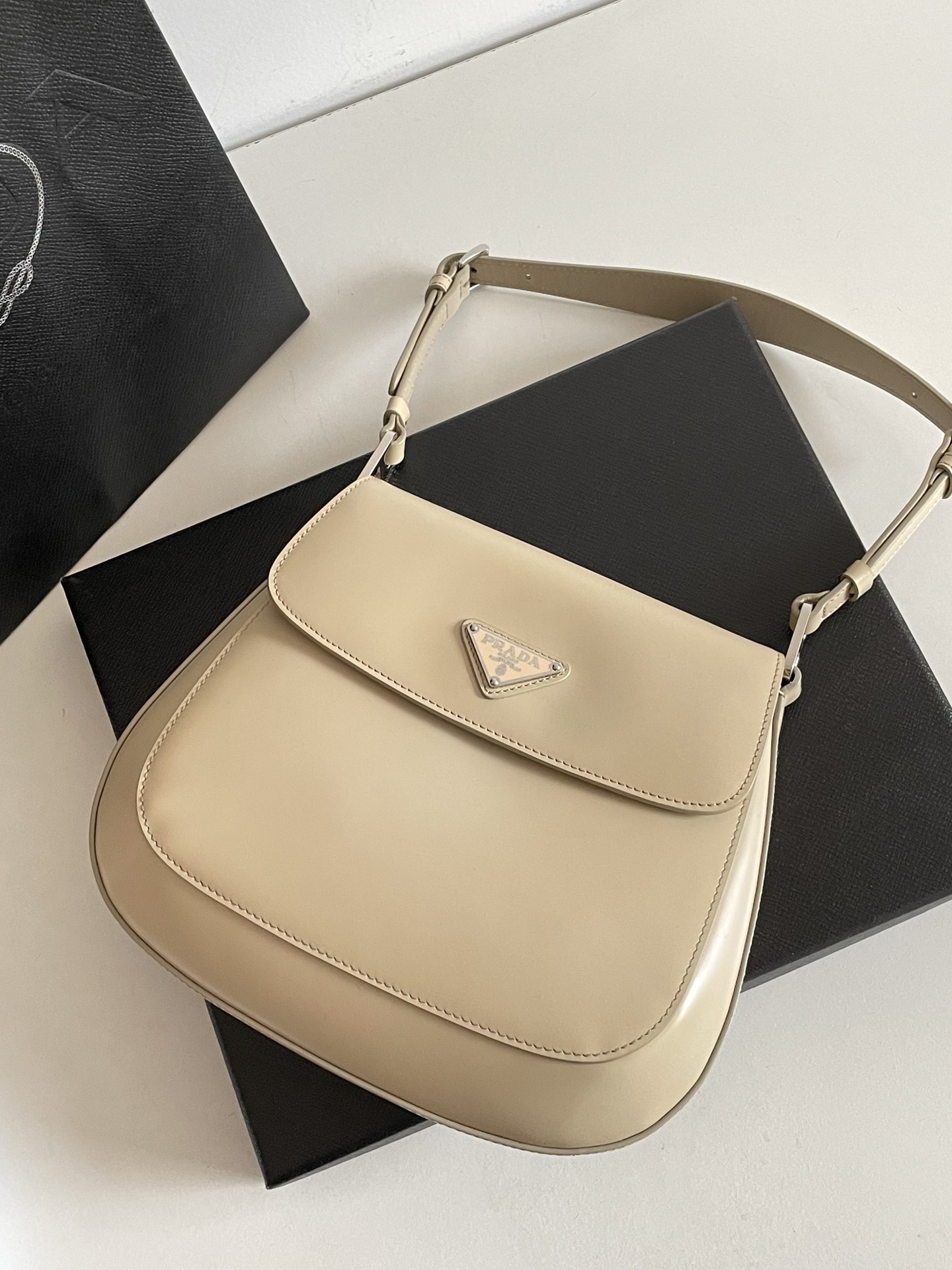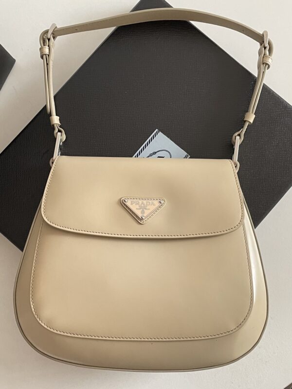프라다의 클레오 대형 플랩 숄더백은 세련된 디자인과 고급스러운 소재로 눈길을 사로잡습니다.