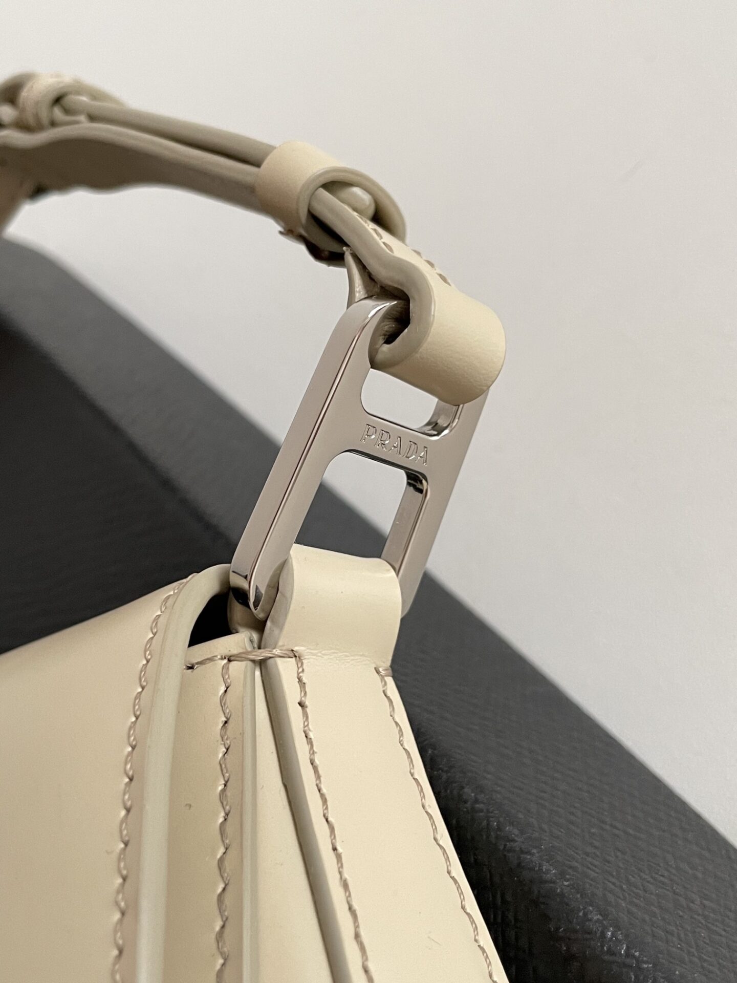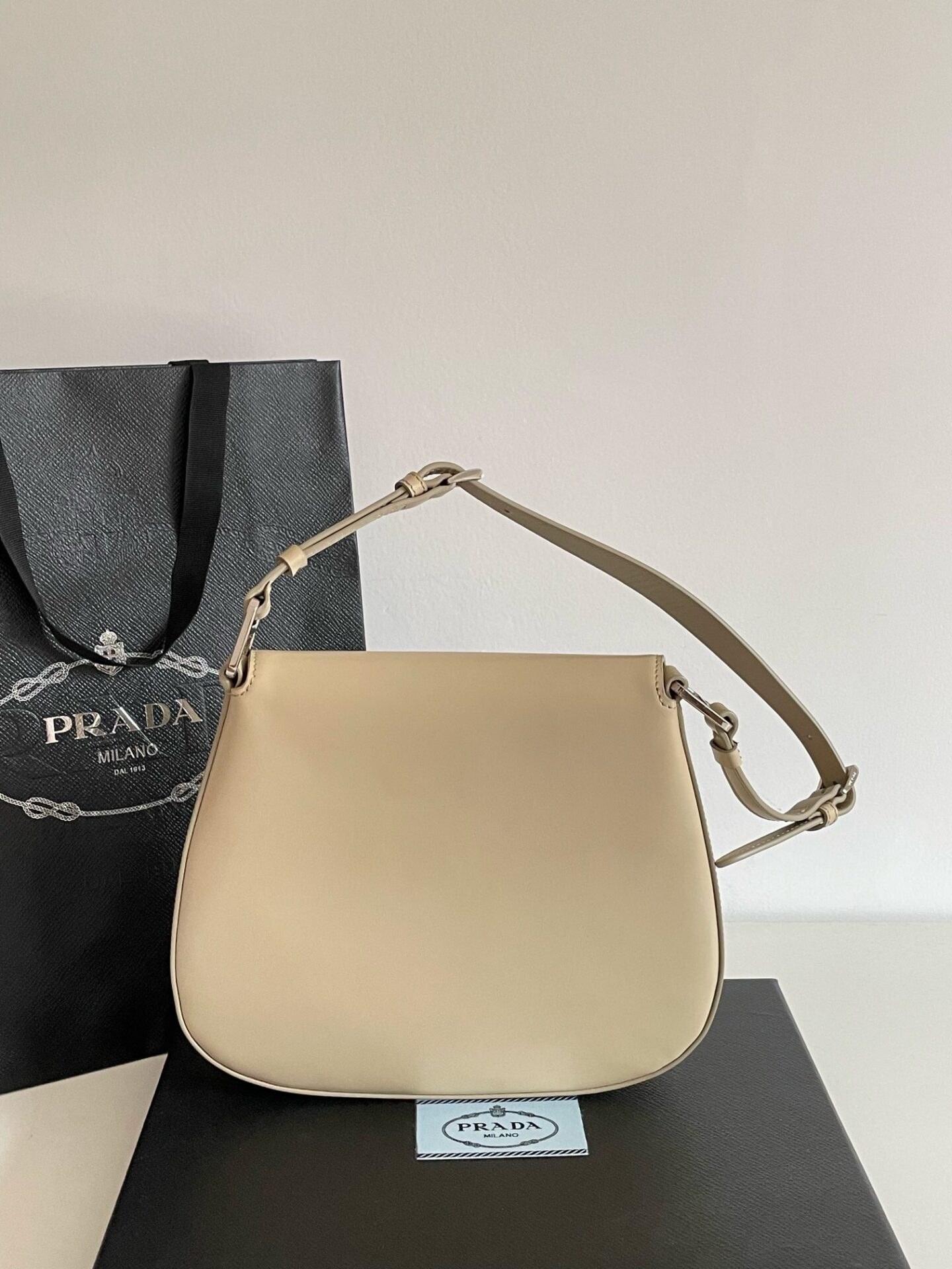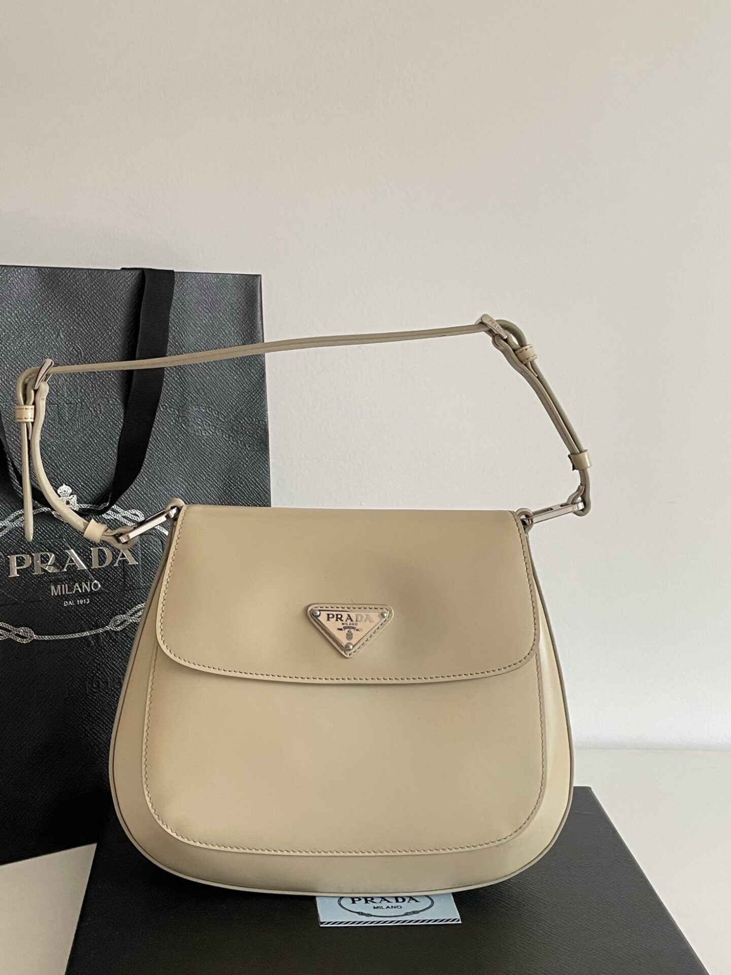 프라다의 클레오 대형 플랩 숄더백은 세련된 디자인과 고급스러운 소재로 눈길을 사로잡습니다.