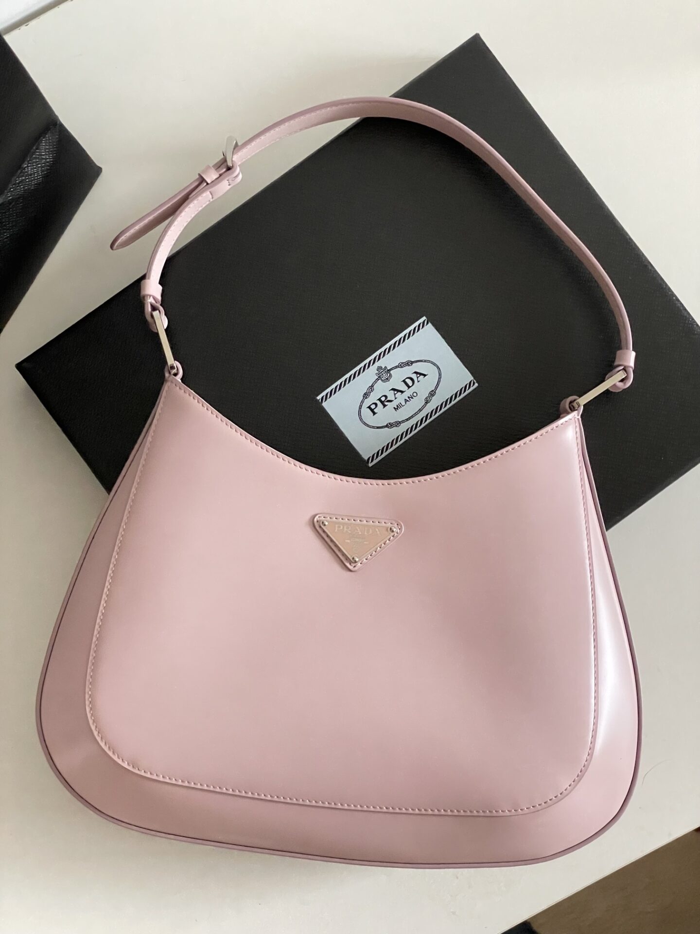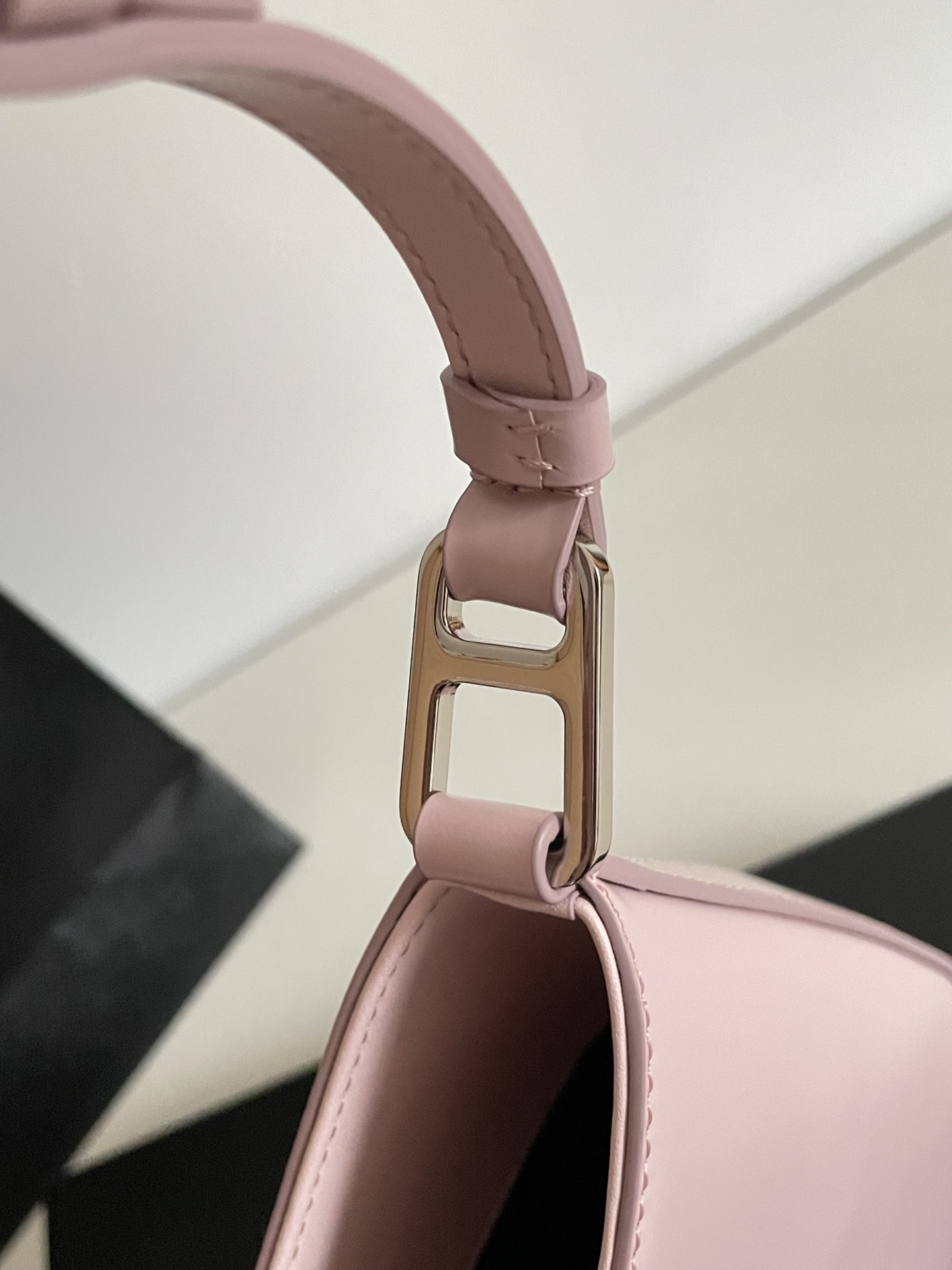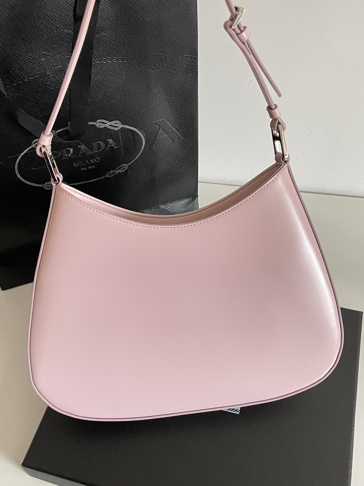 프라다의 클레오 대형 호보백은 독특한 디자인으로 시선을 사로잡습니다. 부드러운 핑크 색상의 소가죽으로 제작되어 고급스러운 질감을 자랑합니다.