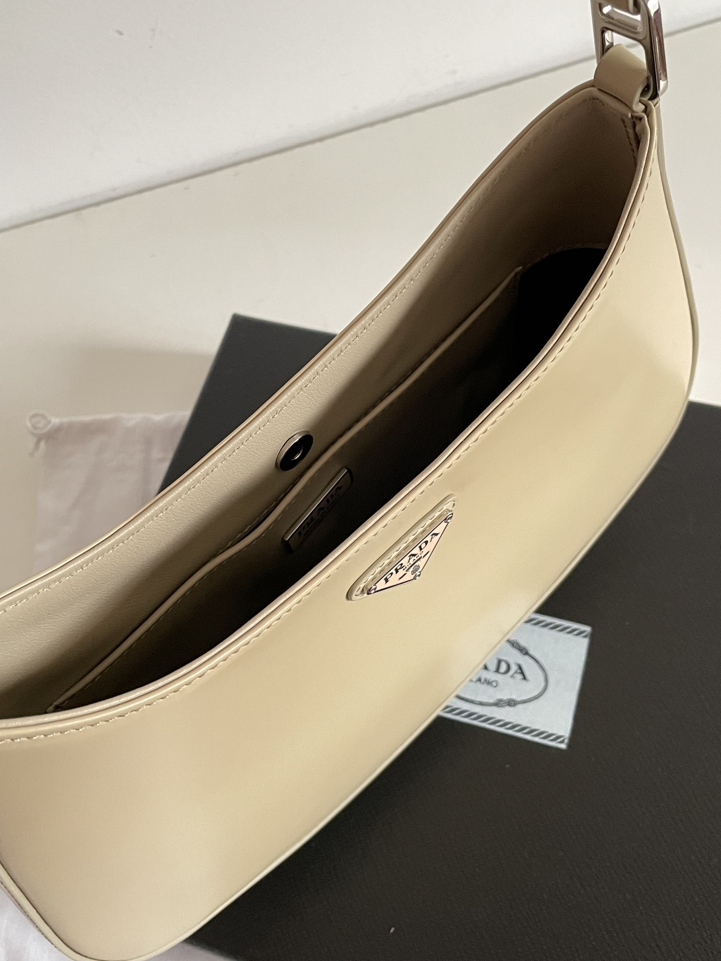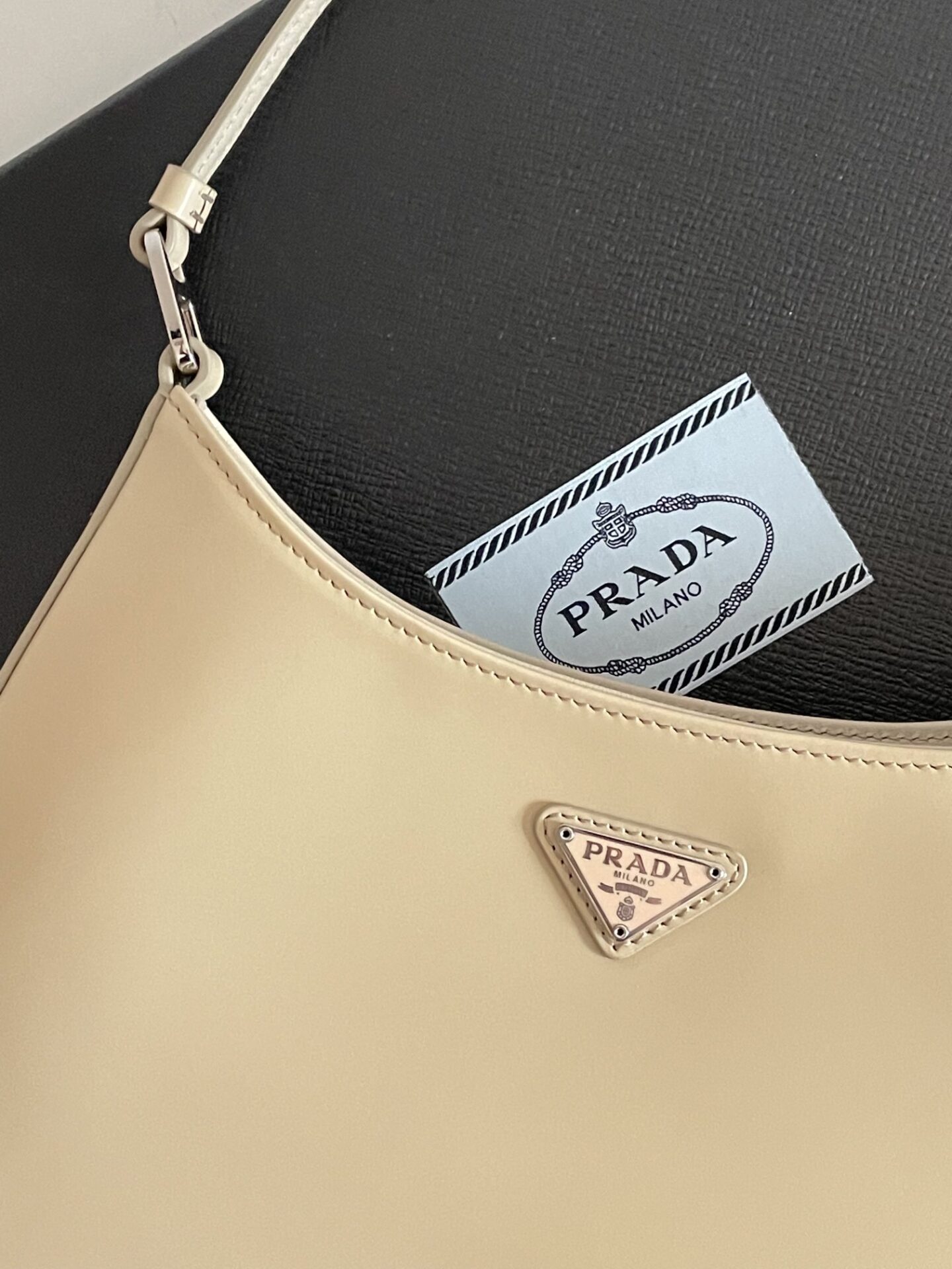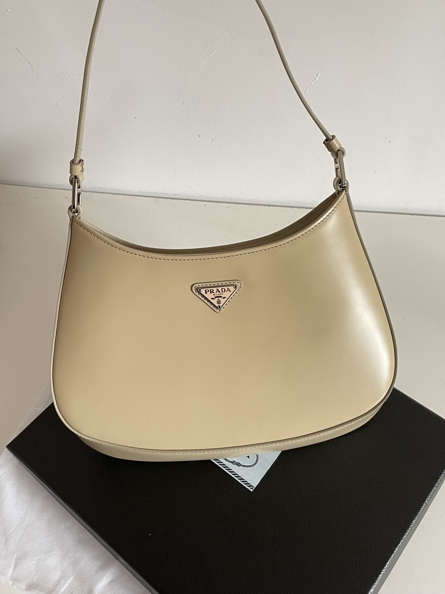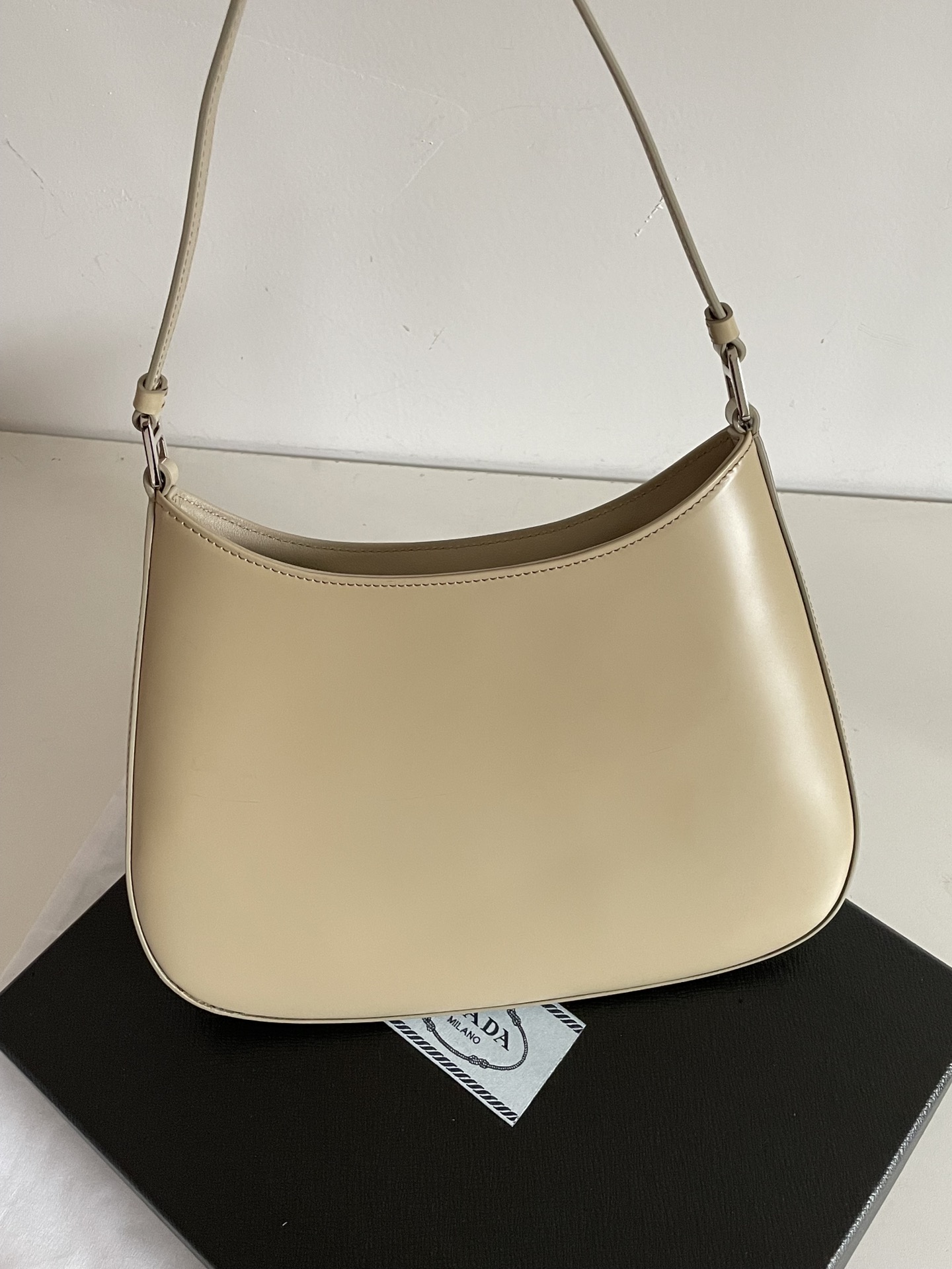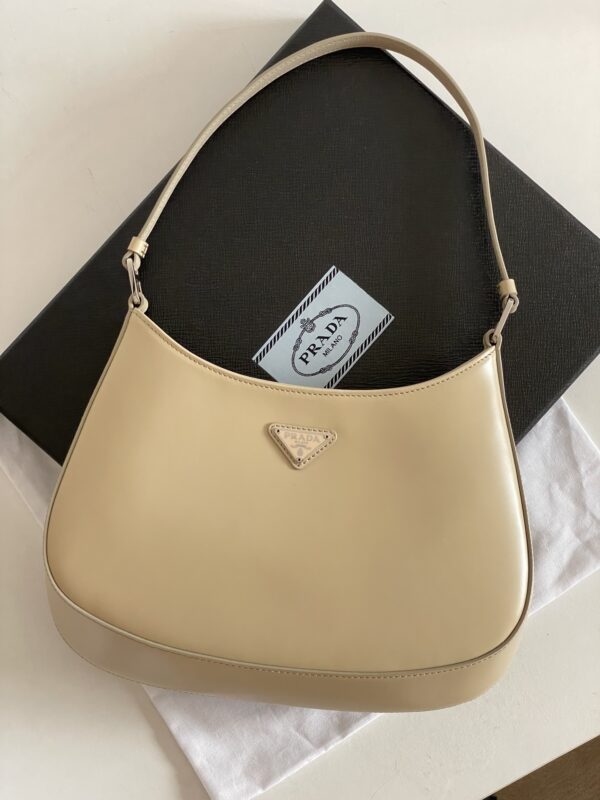 프라다의 클레오 미디움 숄더백은 세련된 디자인과 고급스러운 소가죽 소재로 제작되었습니다.