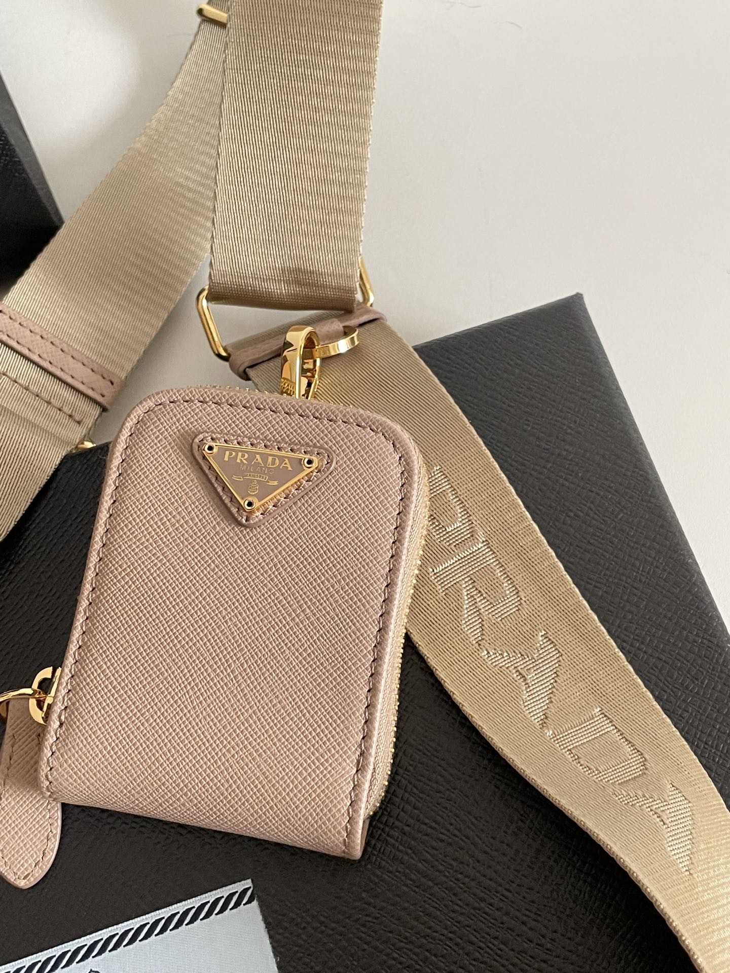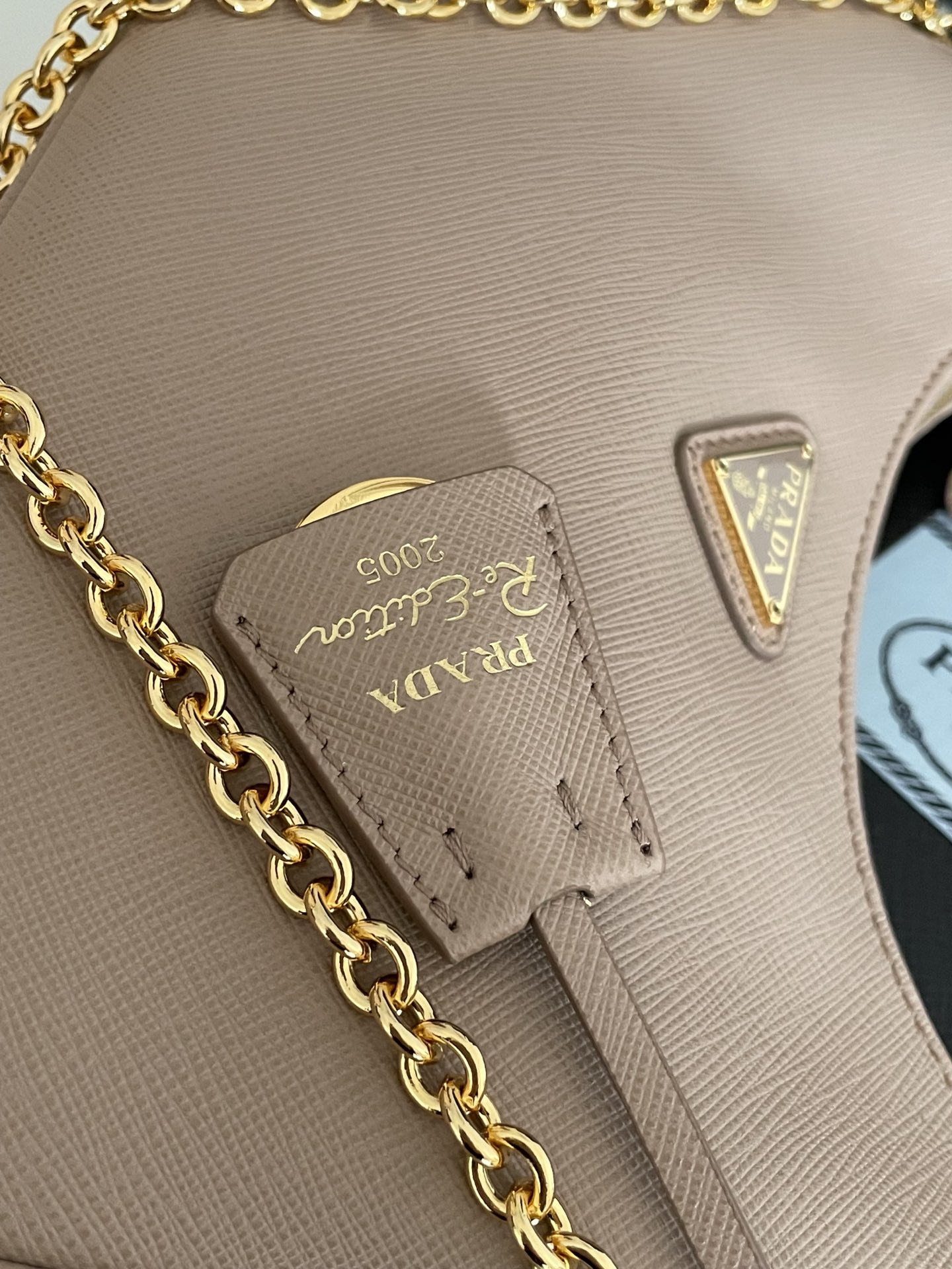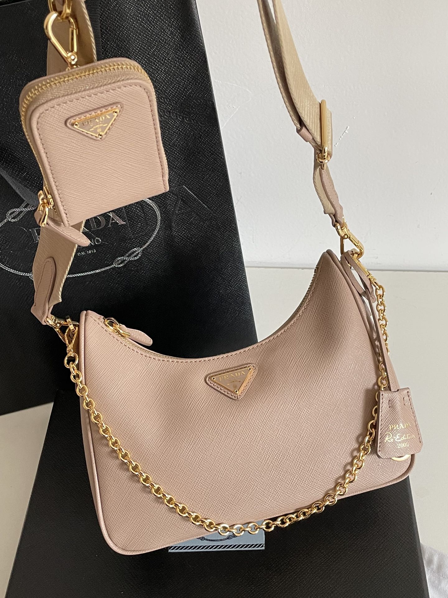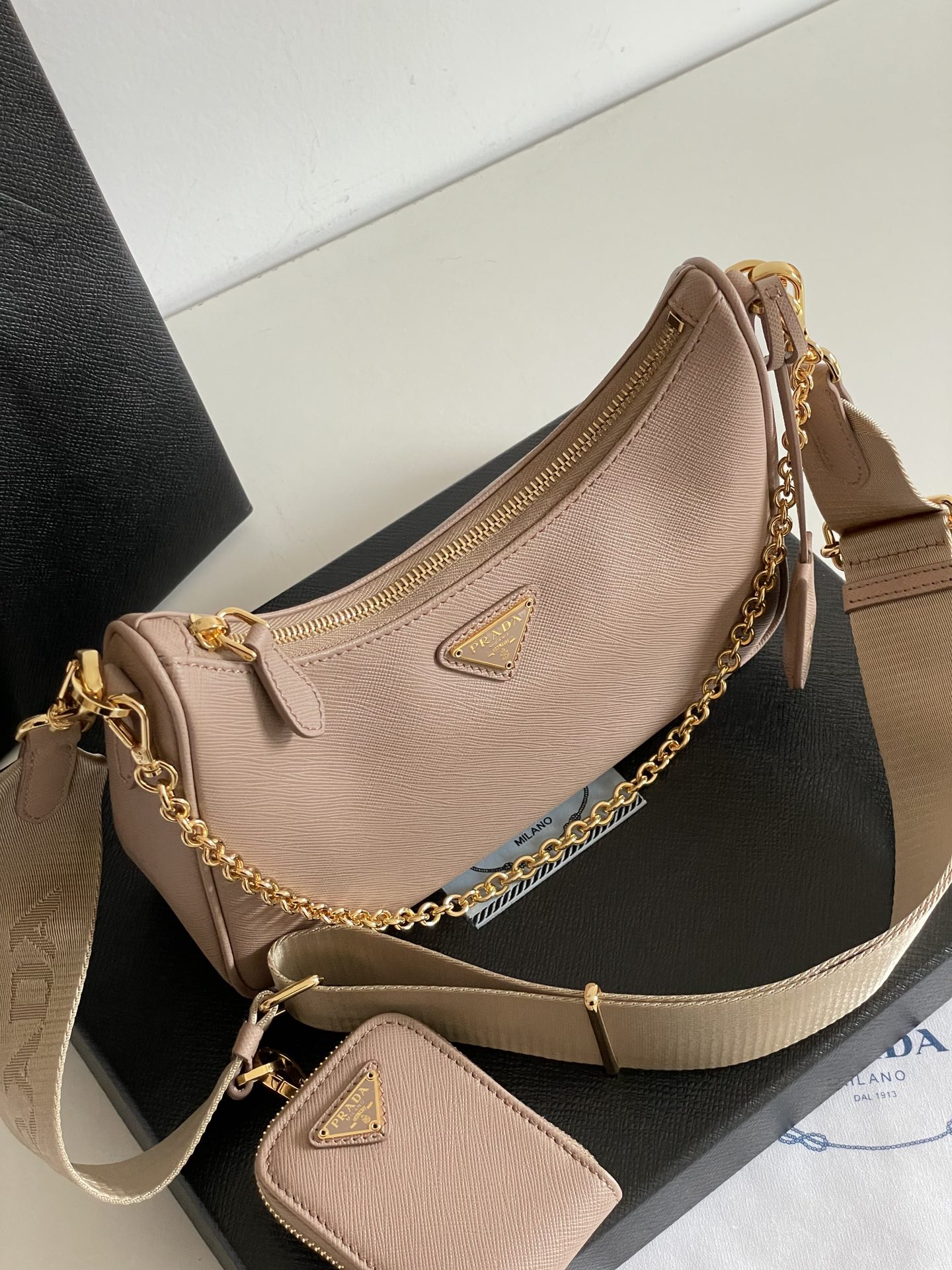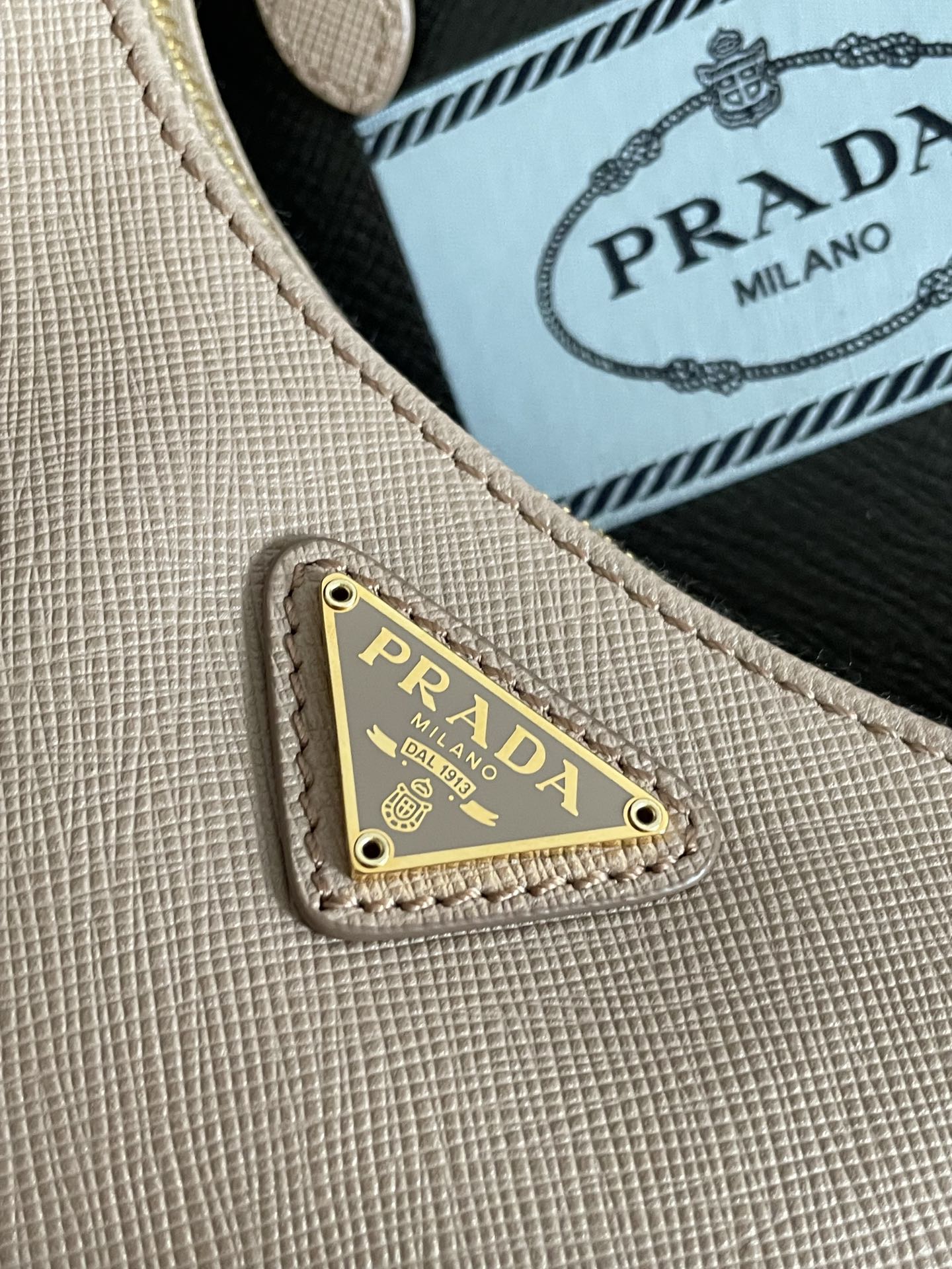 프라다의 호보백은 고급 소가죽으로 제작되어 부드러운 질감을 자랑합니다.