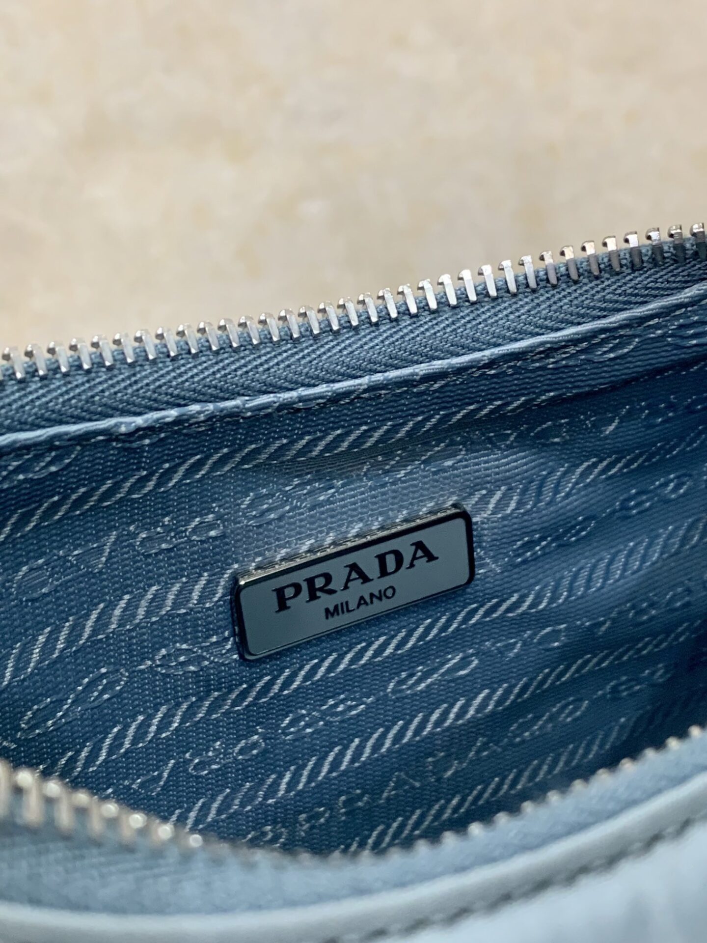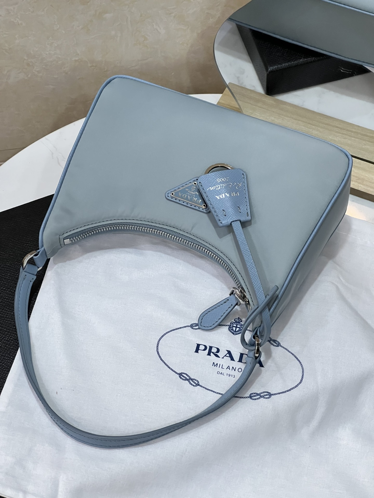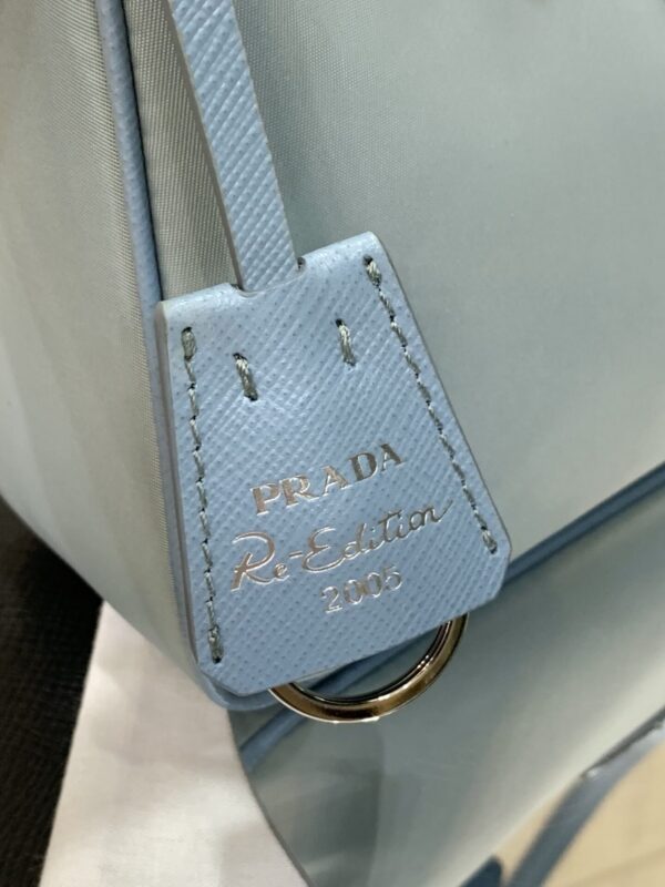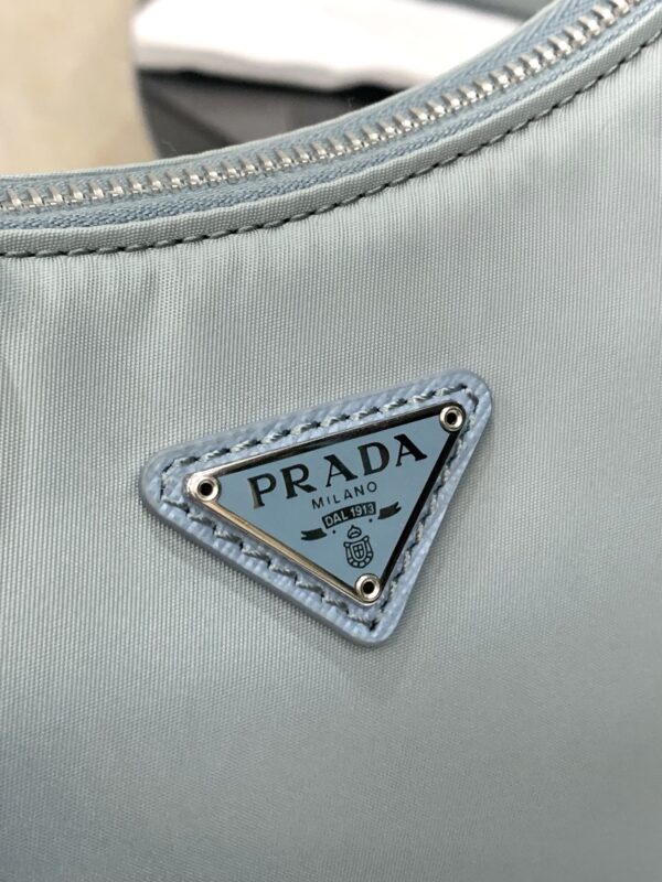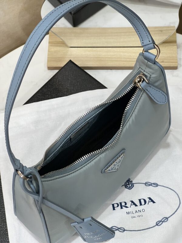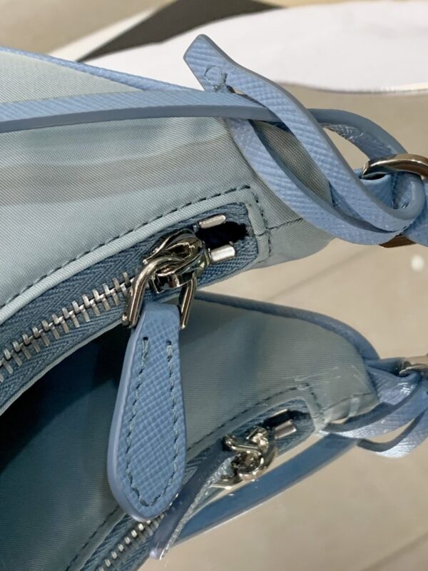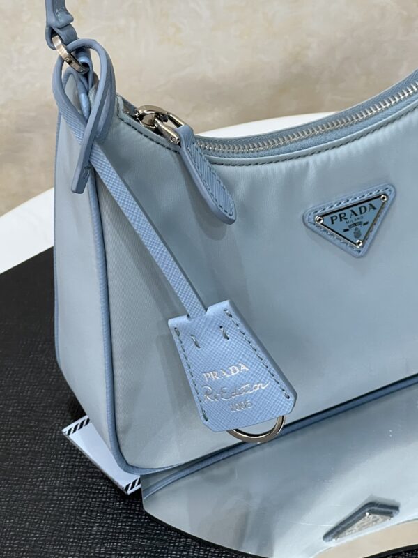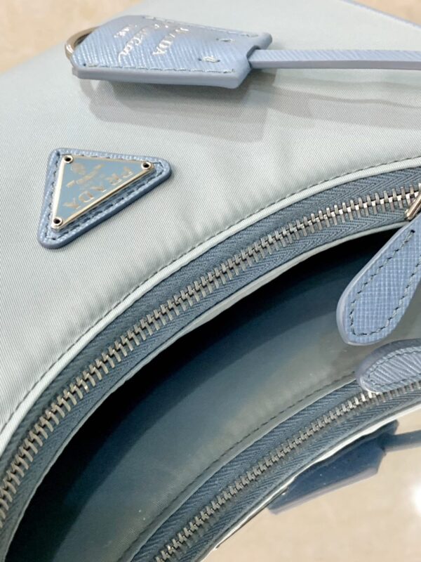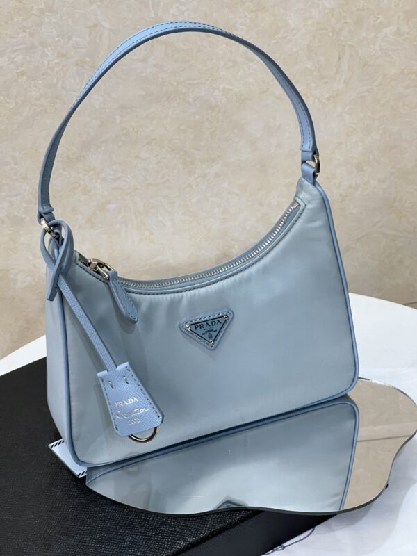프라다의 호보백은 스포티 섹시 스타일로, 베이비 블루 색상이 매력적입니다.