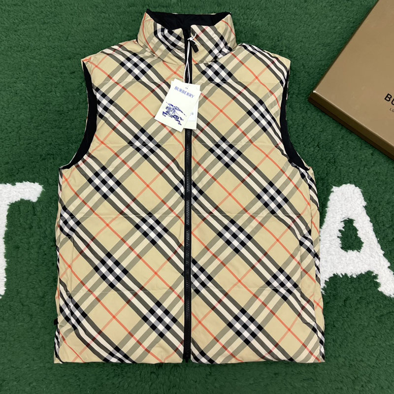 - 버버리 브랜드의 체크 패턴과 리버시블 디자인이 적용된 나일론 패딩 조끼입니다.