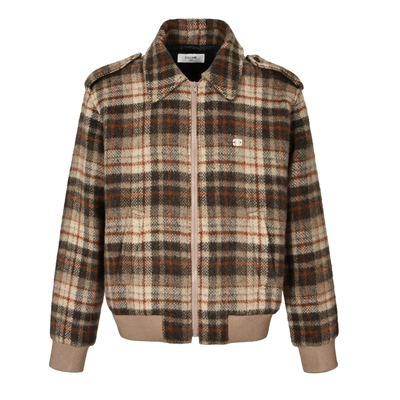 - 트리오페 로고 자수가 포함된 체크 패턴의 테디 자켓입니다.
