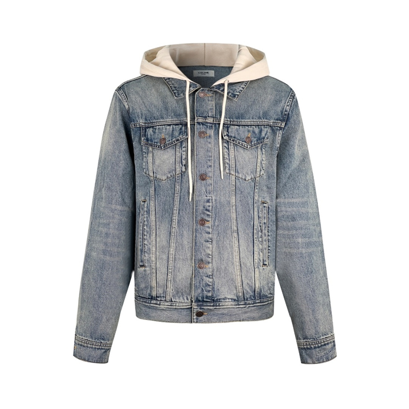 셀린느의 트러커 후드 데님 자켓입니다. 연청색으로 캐주얼한 룩에 적합합니다.