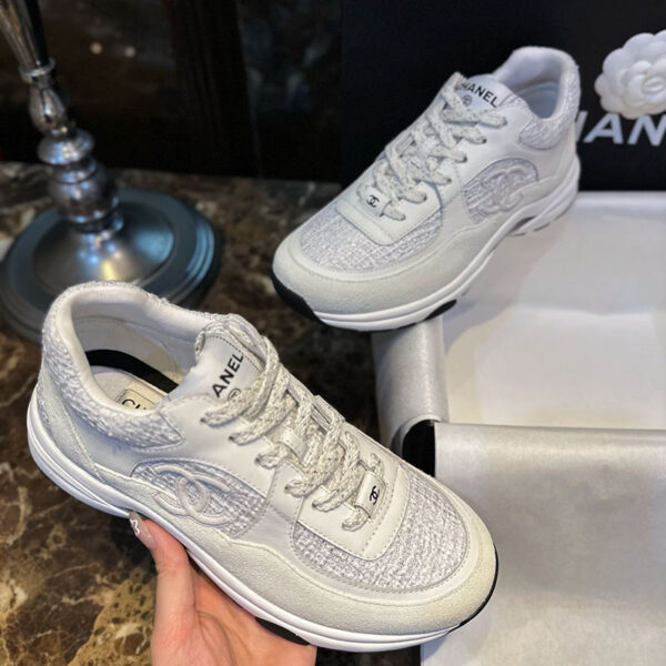 - 샤넬 cc로고가 장식된 트위드 스니커즈로 일상적인 신발 용도에 제작되었습니다.