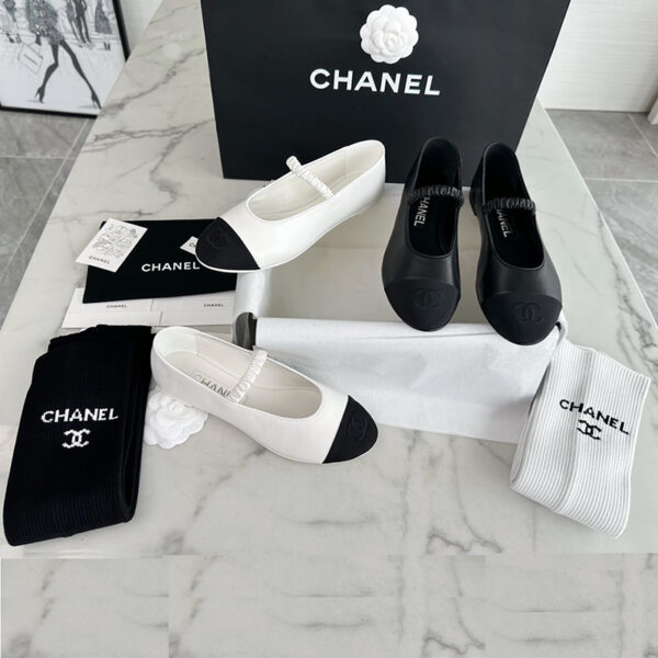 샤넬 브랜드의 메리제인 플랫슈즈입니다. 다양한 룩에 매치하기 좋은 디자인입니다.