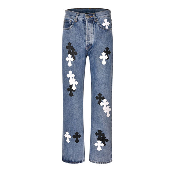 - 크롬하츠 브랜드의 데님 하의로 캐주얼하고 유니크한 크로스 패치 디자인이 돋보입니다.