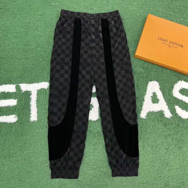 루이비통 잔디집 다미에 패턴의 테크니컬 플록드 트랙팬츠입니다. 편안한 착용감과 독특한 디자인이 특징입니다.