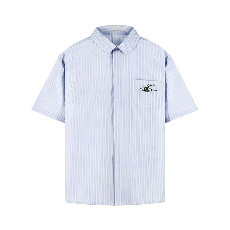 디올의 꾸뛰르 은방울꽃 자수와 스트라이프 디자인이 특징인 반팔 셔츠입니다. 여름철 가볍게 착용하기 적합한 제품입니다.