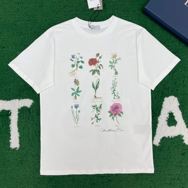 - 디올의 플라워 프린팅 반팔 티셔츠로, 여성용 상의에 적합합니다.
