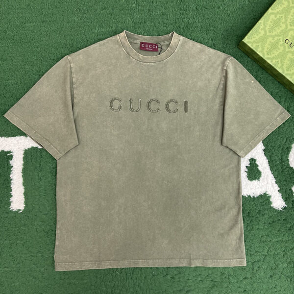 - 디스트레스드 로고가 특징인 구찌 코튼 반팔 티셔츠입니다.
