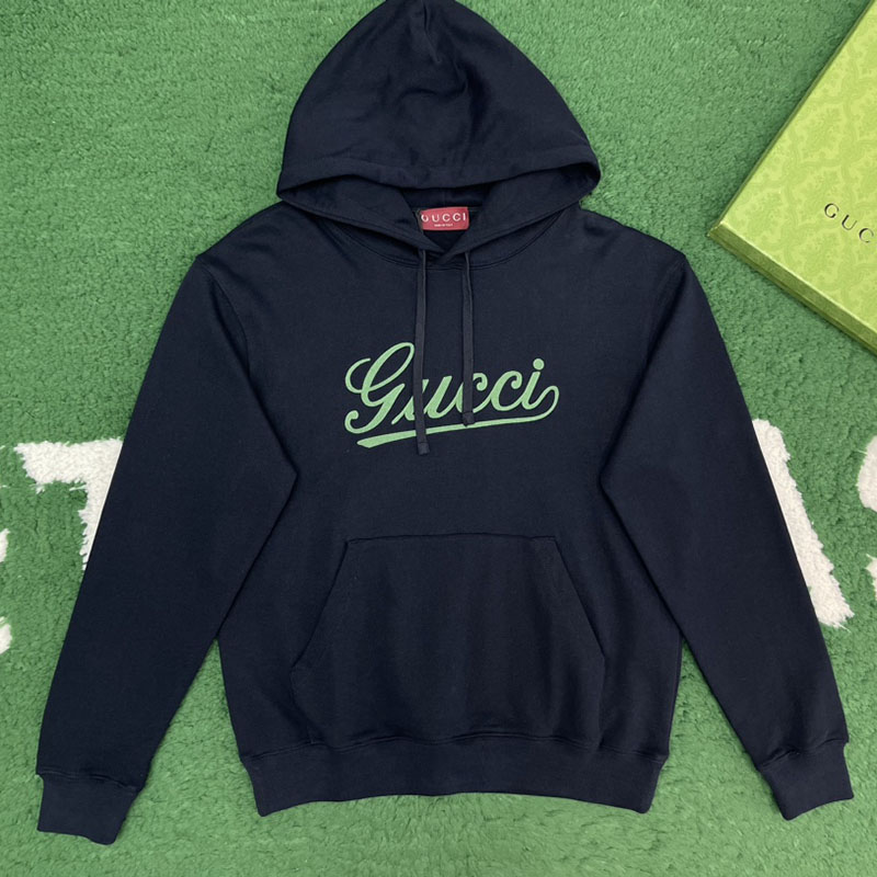 - 이 제품은 구찌의 로고 디테일이 돋보이는 후디로, 편안한 착용감과 조절 가능한 드로스트링 디자인이 특징입니다.